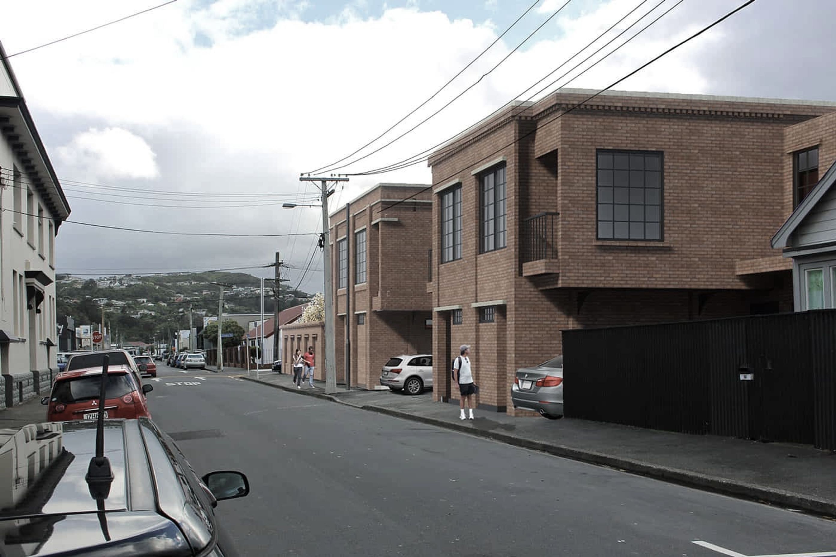 ArchiPro Project Summary - A cluster of five urban townhouses in Petone, designed for flexible living, featuring two duplex pairs and a standalone corner house, reflecting the heritage of the area with a strong use of brick and an appreciation for the vibrant Jackson Street precinct.