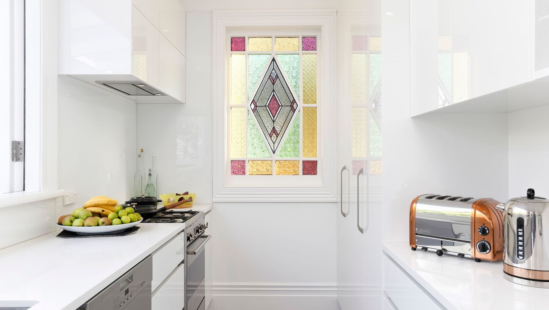 ArchiPro Project Summary - Classic villa restoration in Ponsonby, Auckland, completed in 2020, featuring preserved traditional elements like picturesque stained glass windows and refreshed interiors with clean white walls.