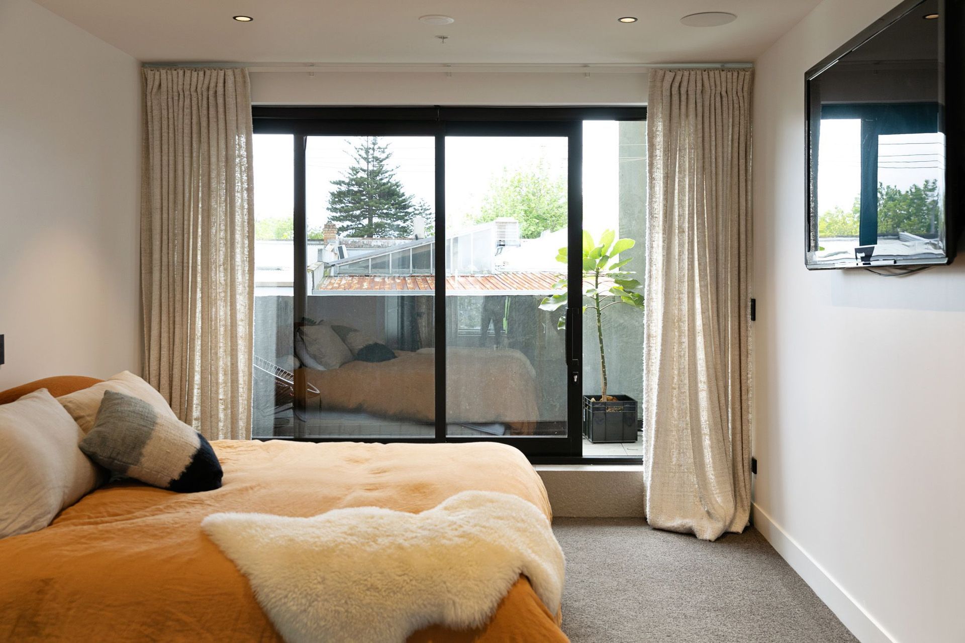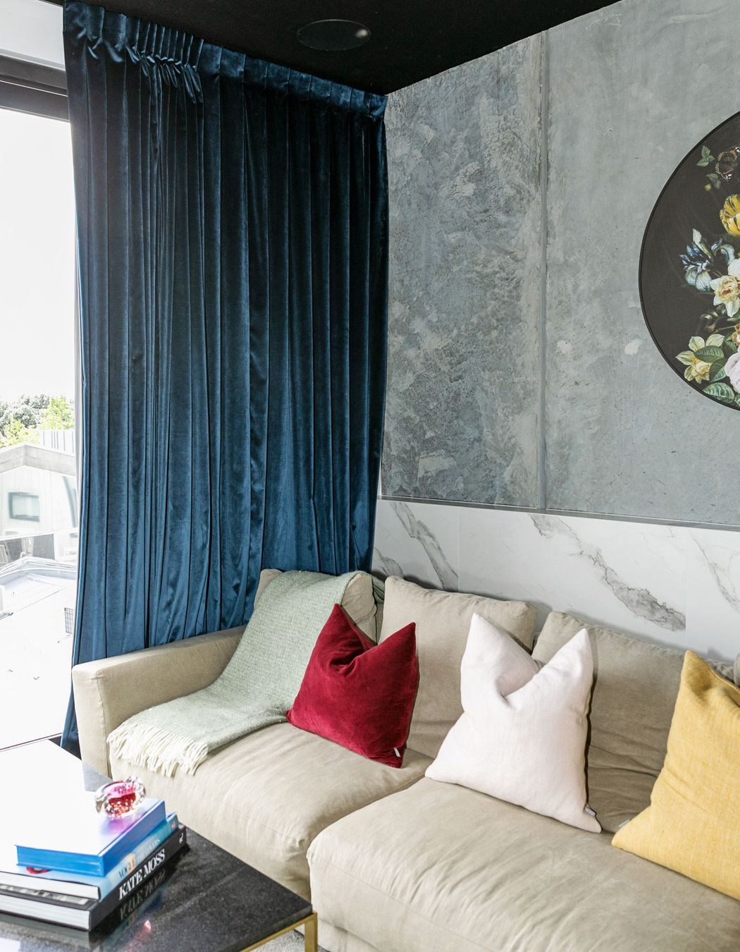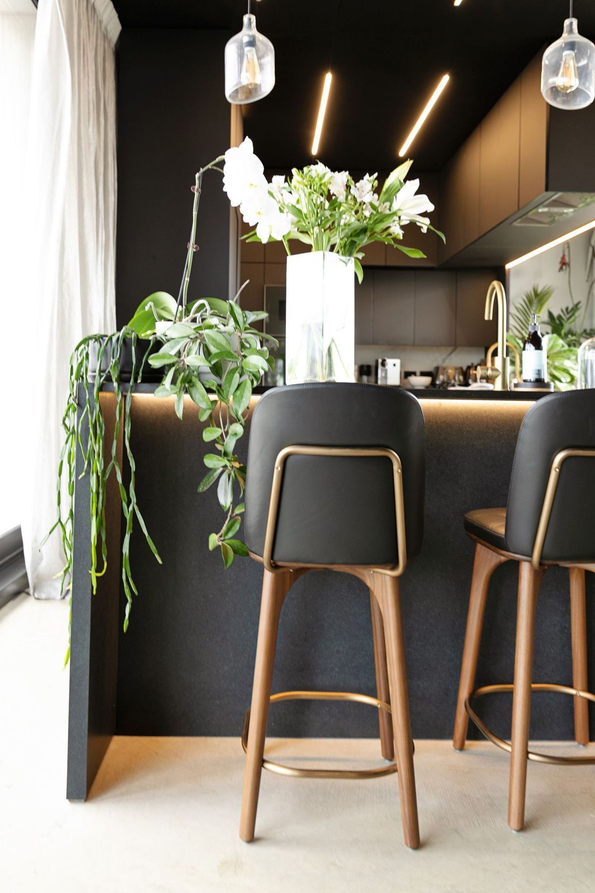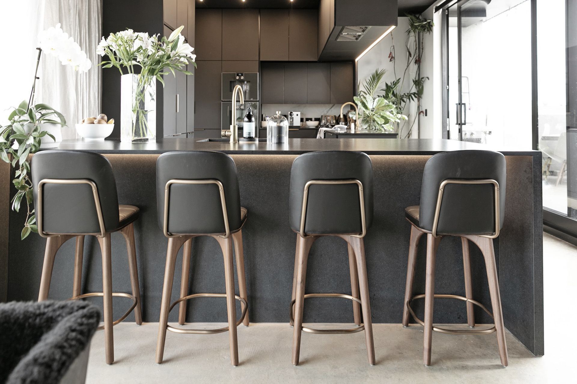 ArchiPro Project Summary - Finishing touches added to the Vinegar Lane Penthouse with elegant drapes and carefully sourced dining and bar stools, enhancing the sophisticated interiors designed by Izzard Interiors.