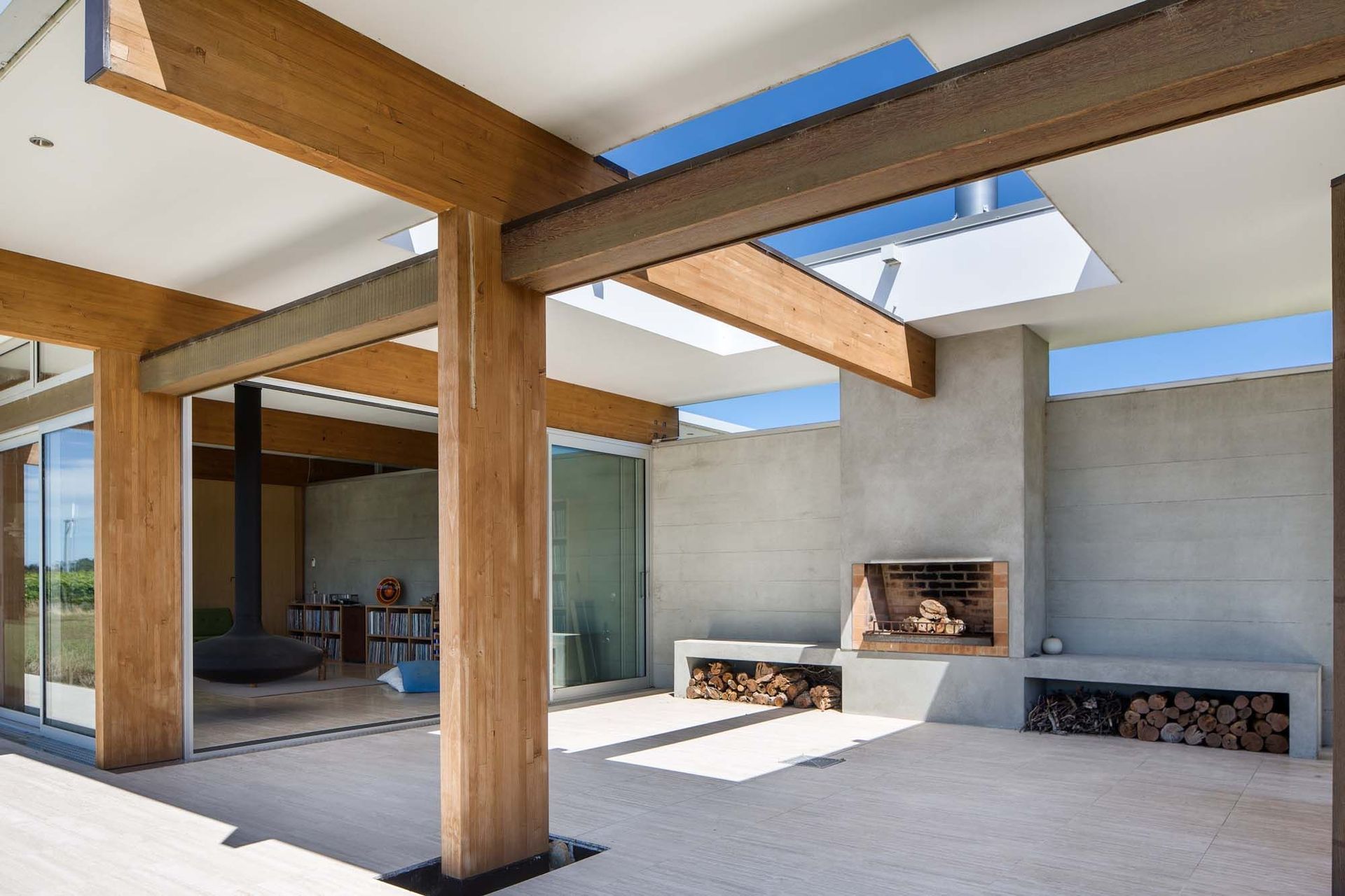 Two exterior outdoor rooms are vital to maintaining year-round comfort, providing outdoor living along with shade while also protecting from the prevailing summer winds. One end of the house features three rather substantial steel-framed, cedar-clad doors that pivot and close off.