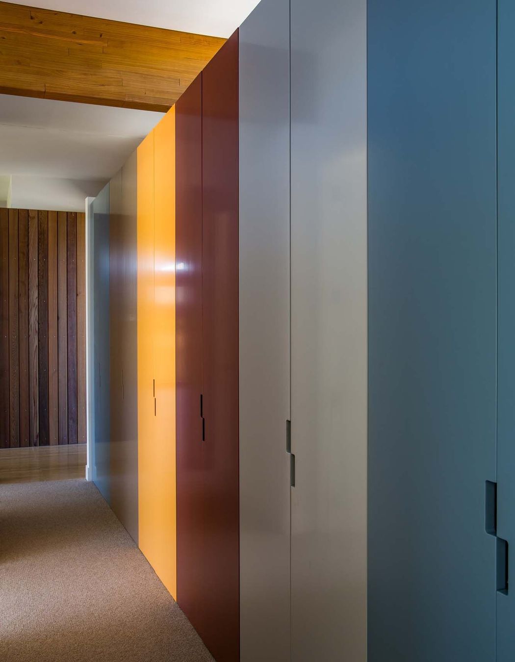 Spatially, the house has a flowing, relatively straightforward plan that incorporates two rectangular pavilions – one for living spaces and one for bedrooms – at right angles. The spectacular hallway features multi-coloured cupboards in mid-century style colours that runs its length and houses plenty of storage, including a space for the clients’ extensive collection of vinyl records and their vintage record players.