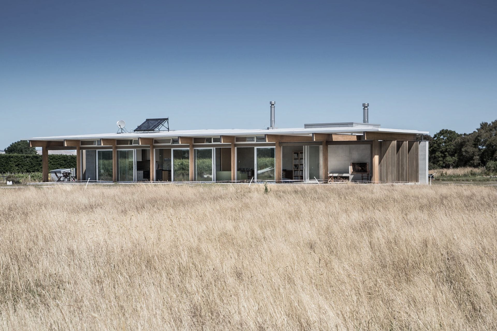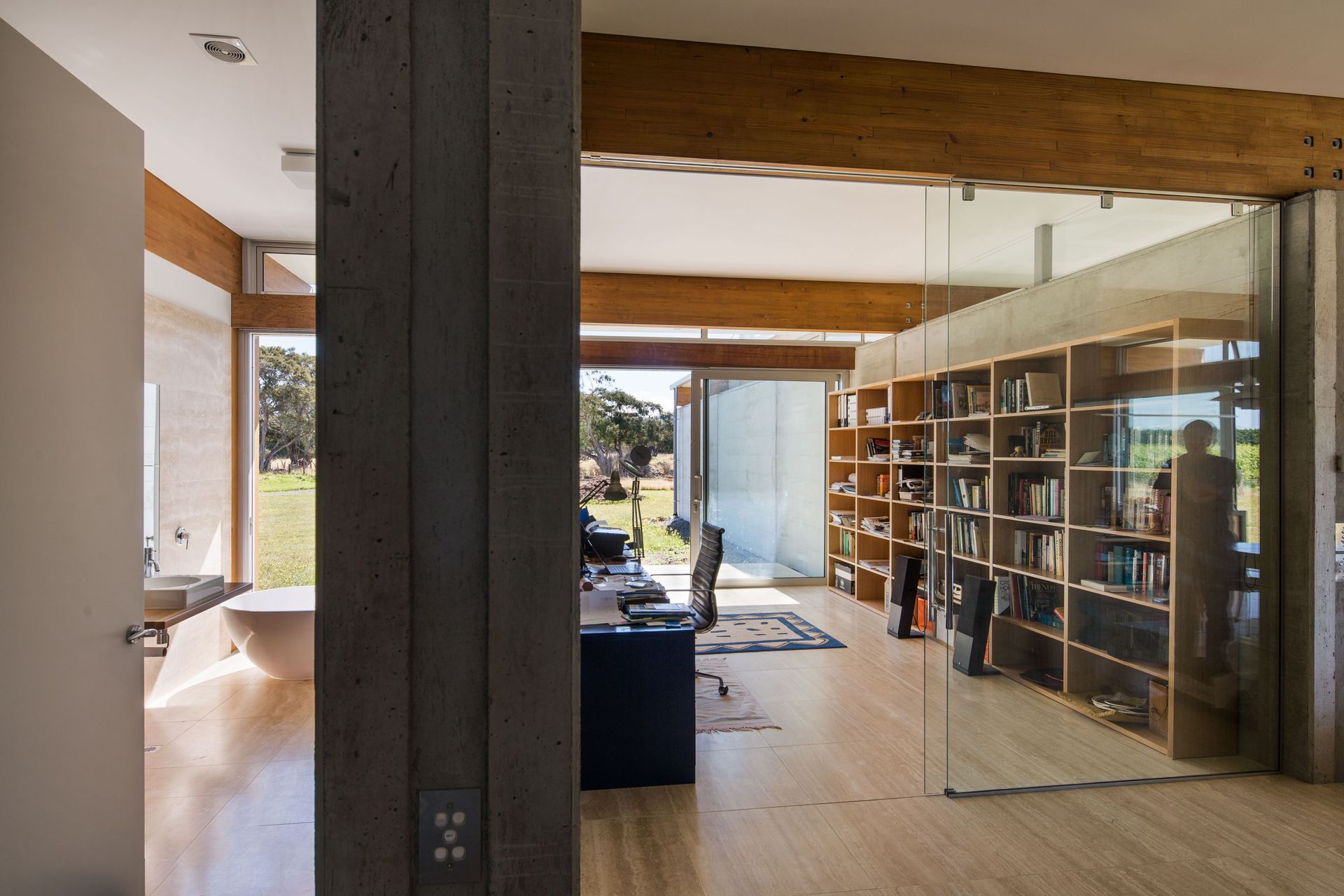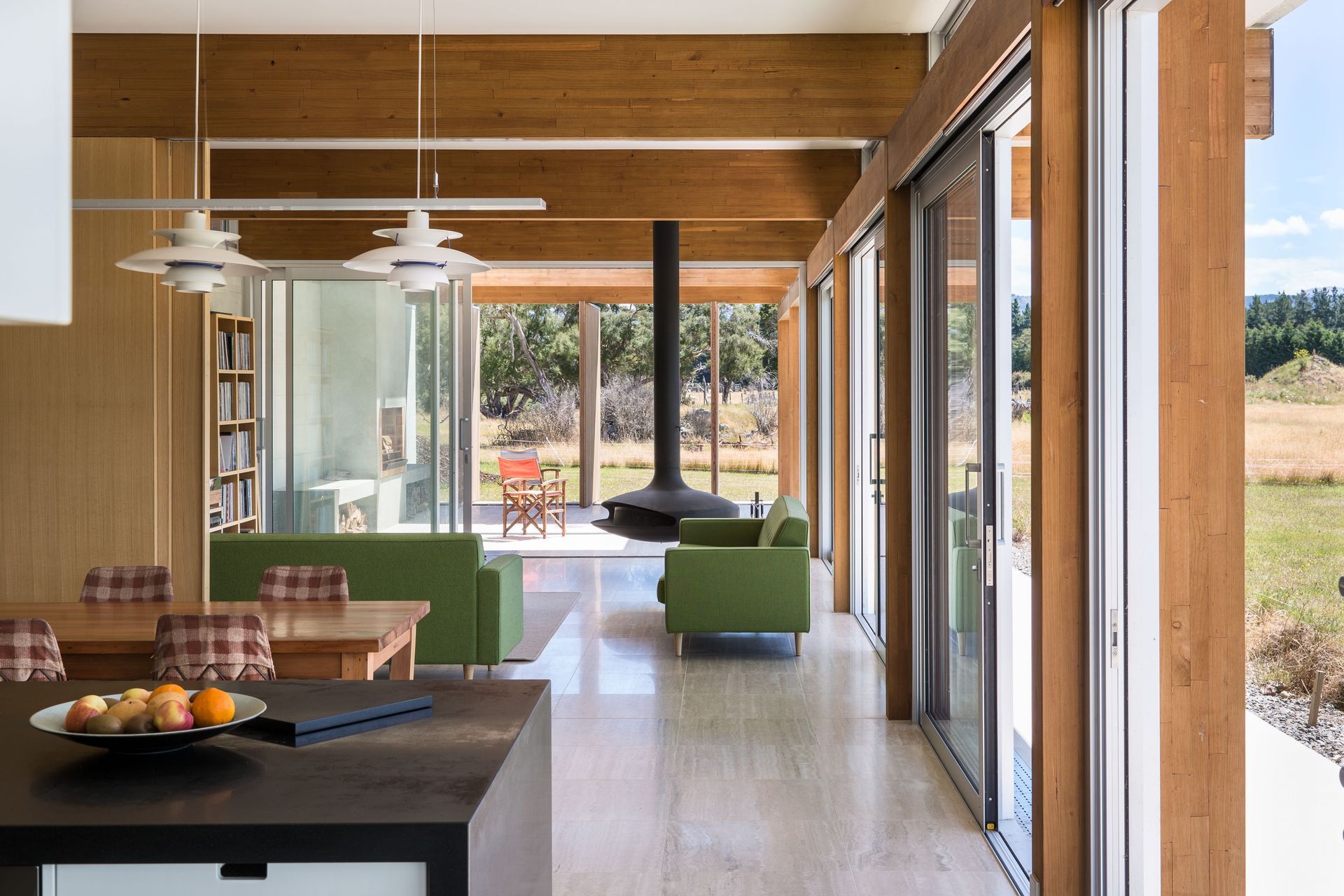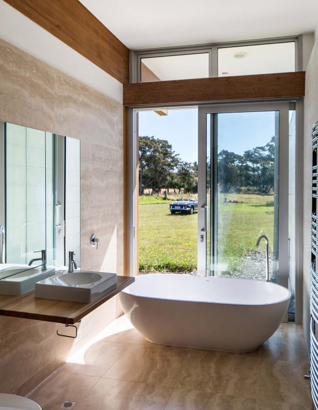 With Wairarapa experiencing extremely high temperatures in the summer, the architect has used extensive computer modelling to ensure that despite the floor-to-ceiling glazing, the large overhang to the north keeps the worst of the summer sun out but allows the house to be warmed by the winter sun. High-level windows can be kept permanently open to allow cross-ventilation through the house, even when windy or raining.