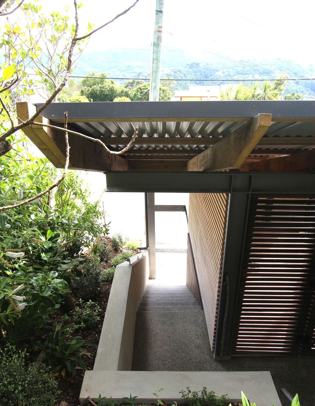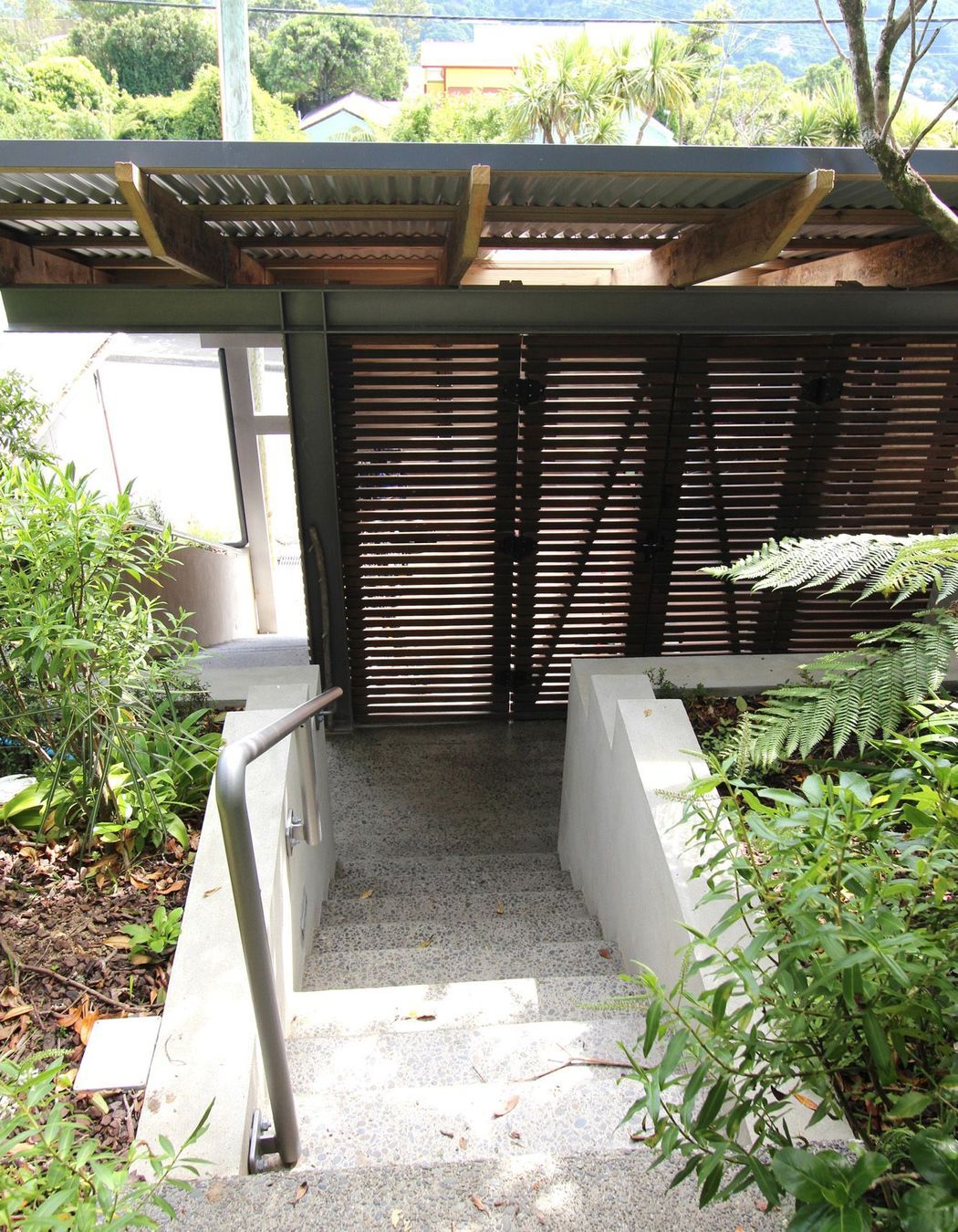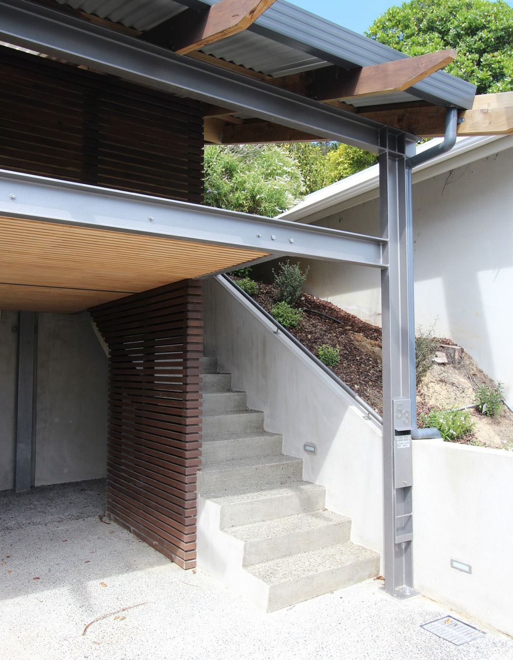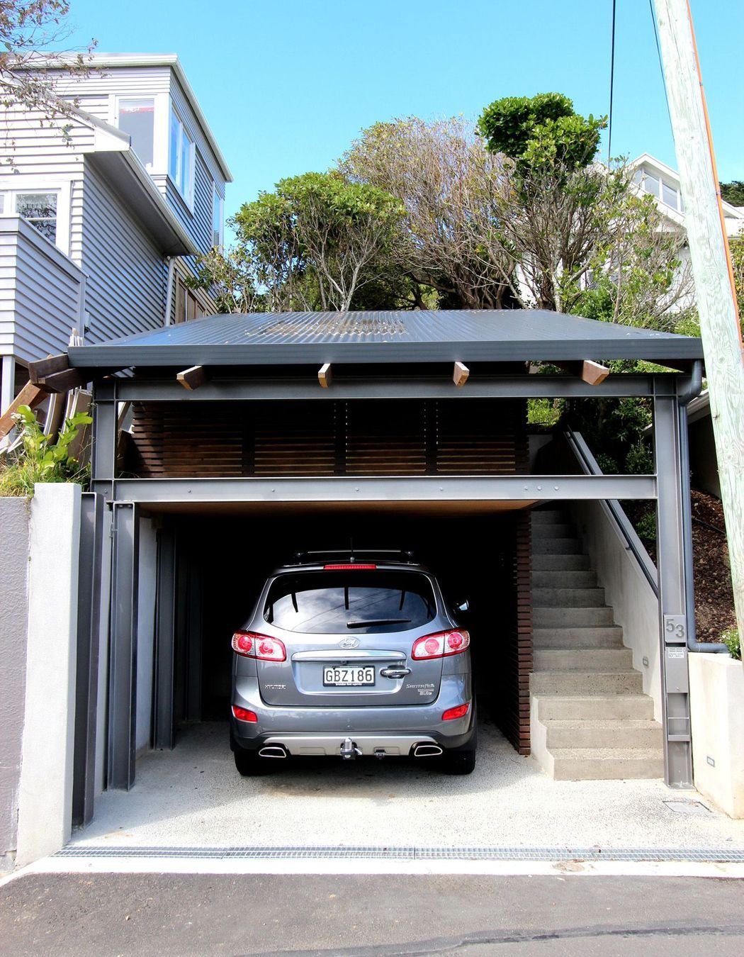 ArchiPro Project Summary - Contemporary carport design optimizing a narrow, contoured site for off-street parking, upper-level storage, and an elegant property entrance.