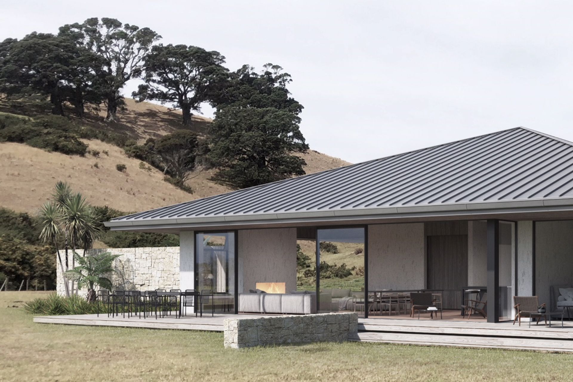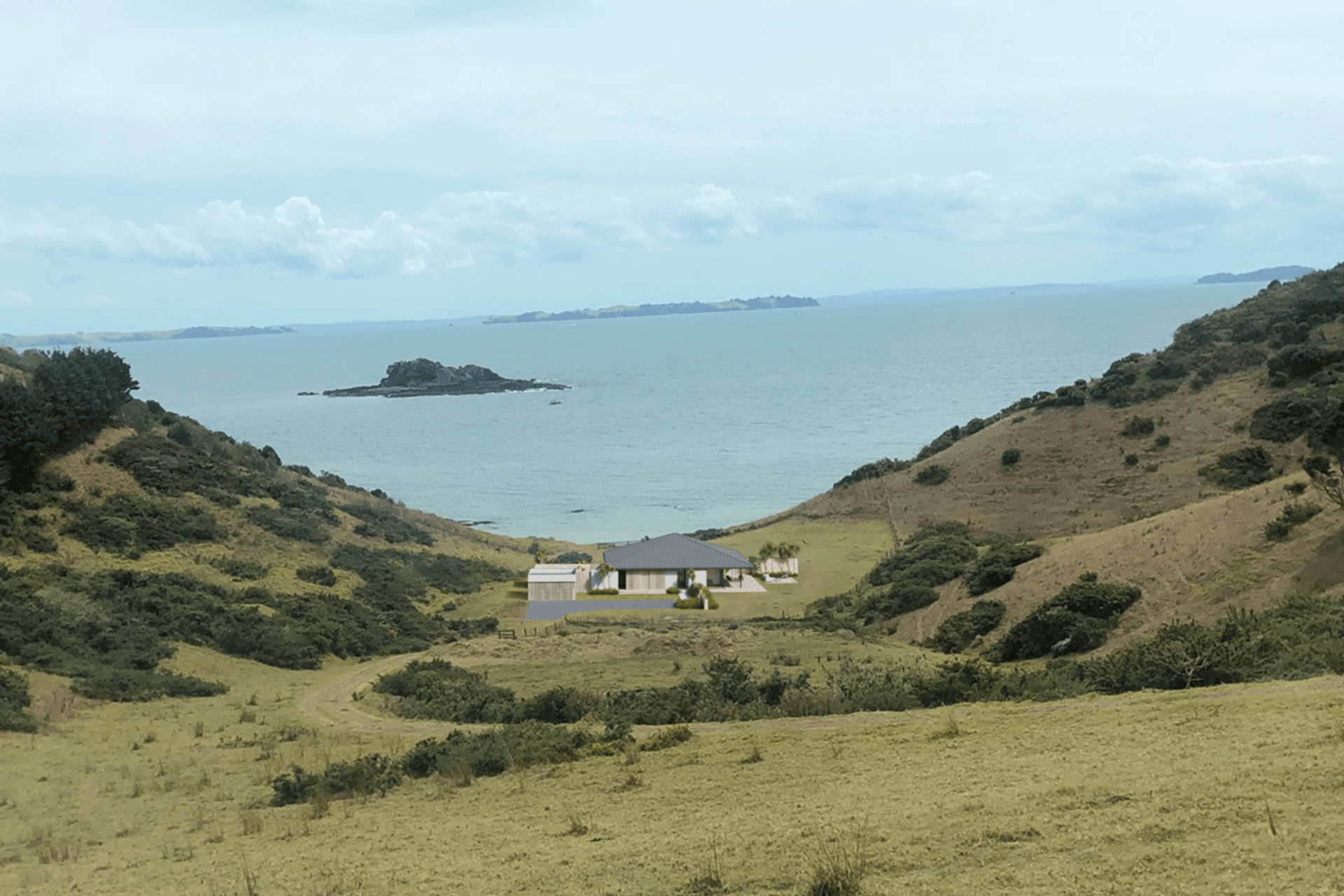 ArchiPro Project Summary - Concept design for a holiday home in a private bay on Waiheke Island, featuring a simple square roofline that harmonizes with the landscape while providing shelter and capturing stunning western sea views.