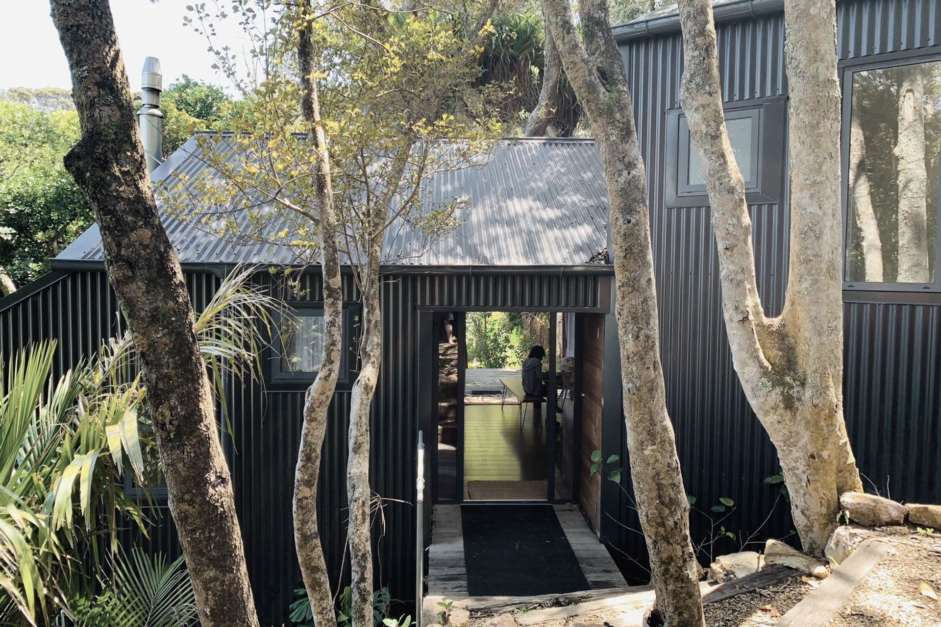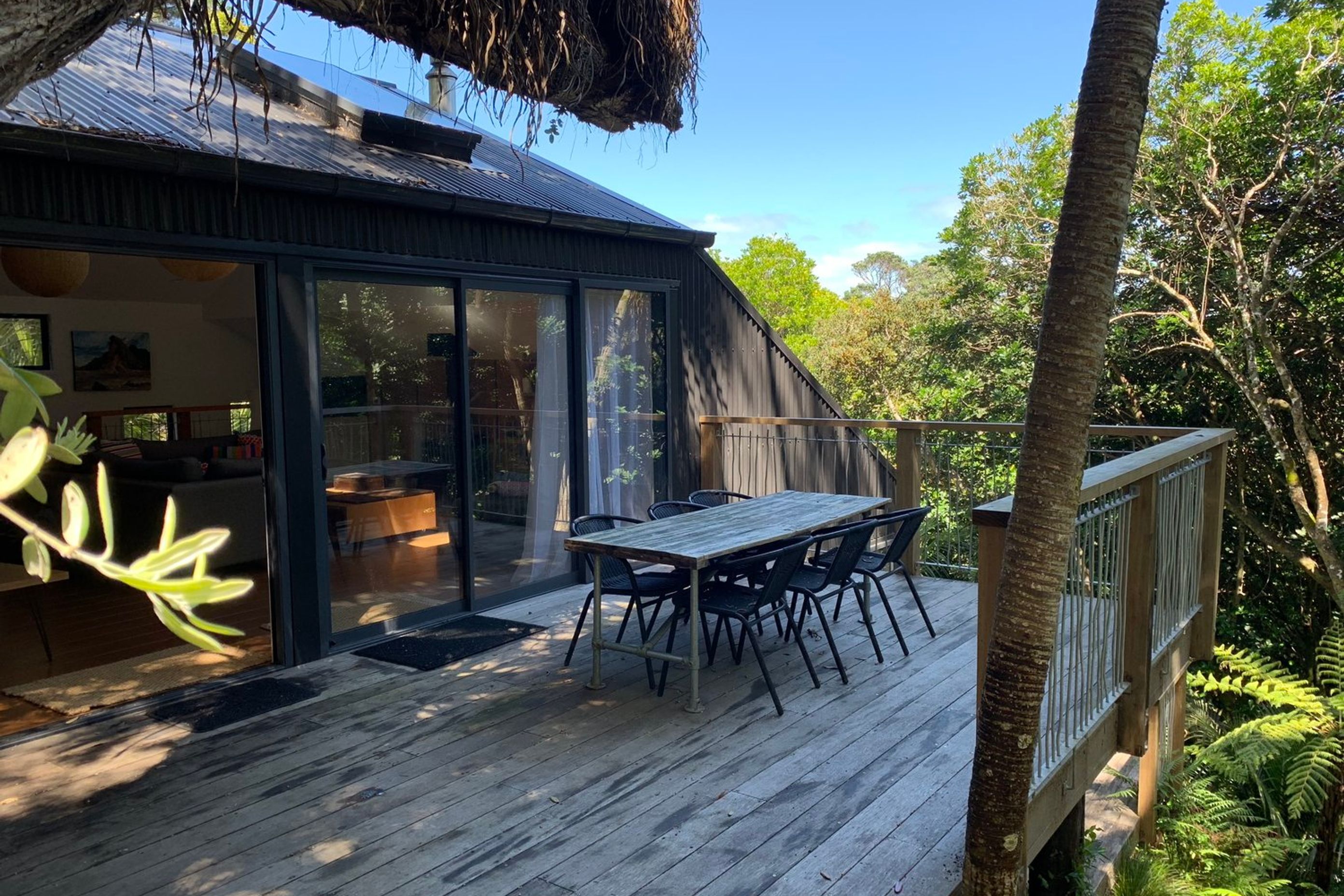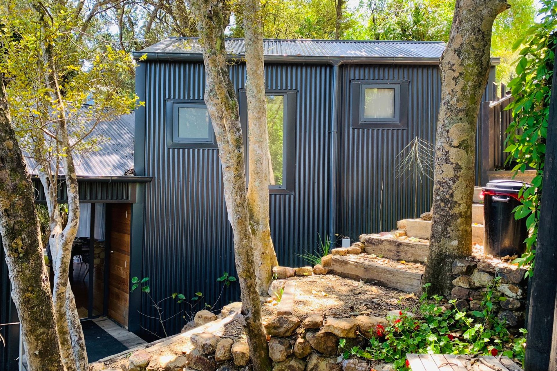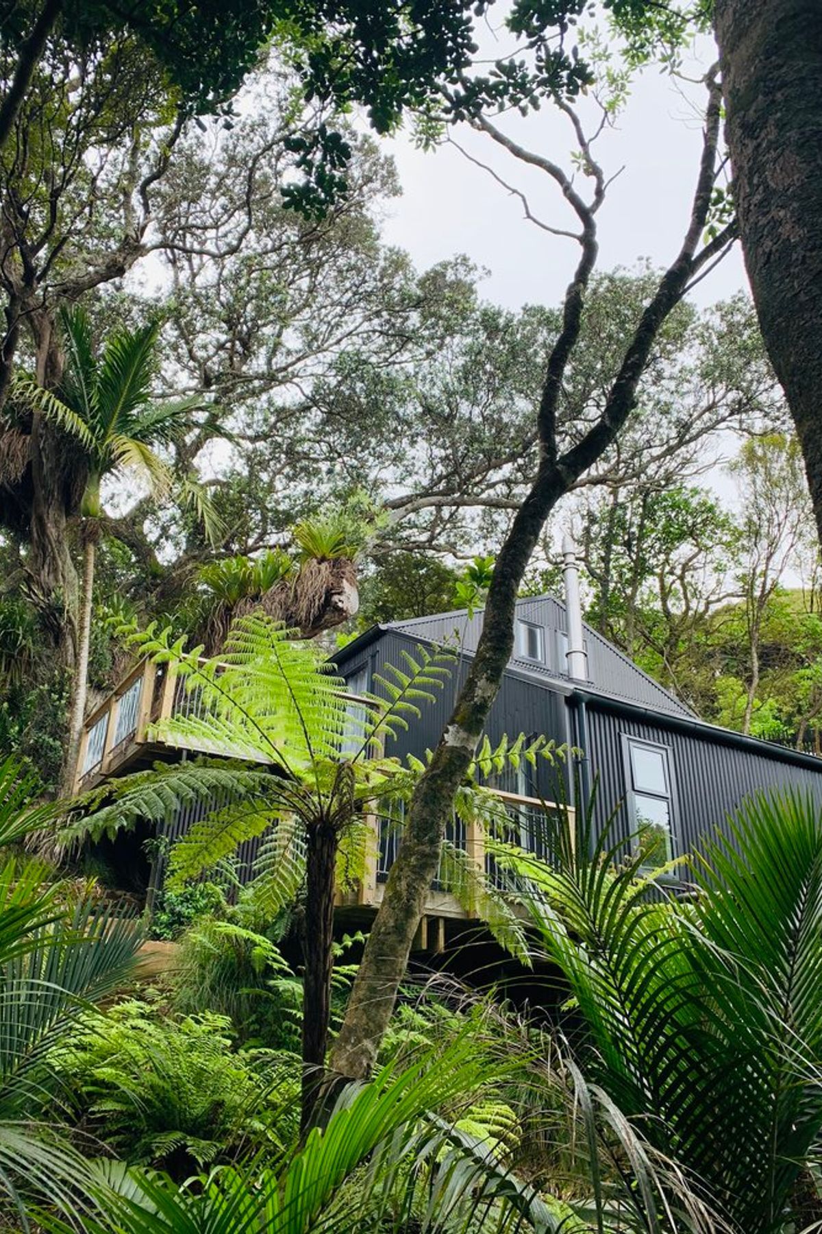 ArchiPro Project Summary - A multilevel black steel clad Bach seamlessly integrated into the Waiheke bush, designed to harmonize with the sloping site and weather beautifully within its native surroundings.