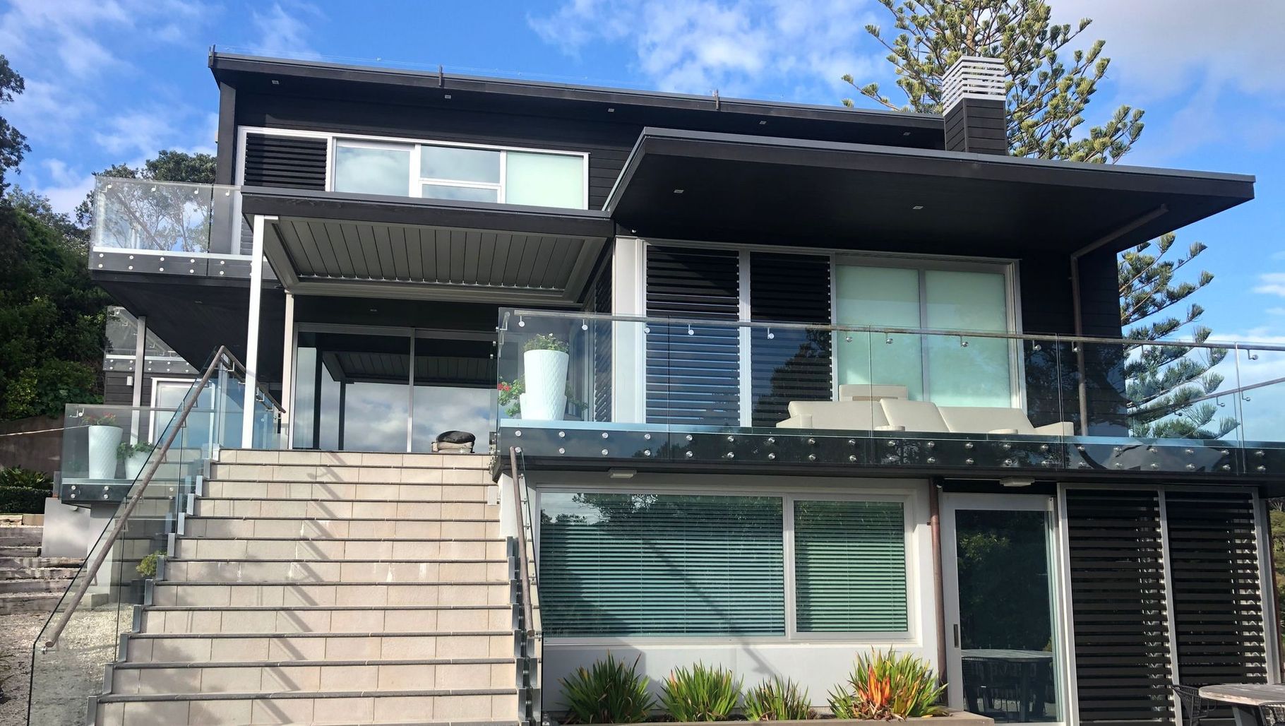 ArchiPro Project Summary - Enhancing outdoor living with a new Alfresco dining area, louvre roofed space, custom fencing, and improved boat facilities at Waiheke House.