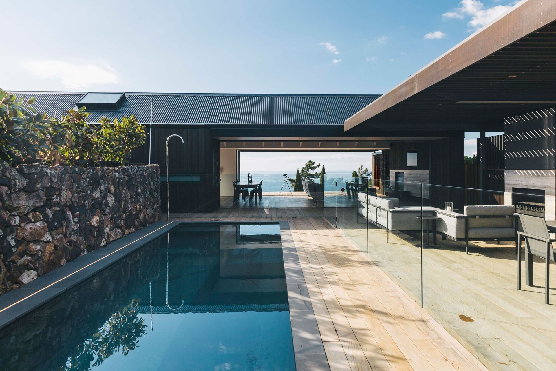 ArchiPro Project Summary - Elegant dual dwelling on Waiheke Island featuring a stunning courtyard and pool, expertly designed to blend with the landscape while overcoming site challenges with innovative engineering solutions.