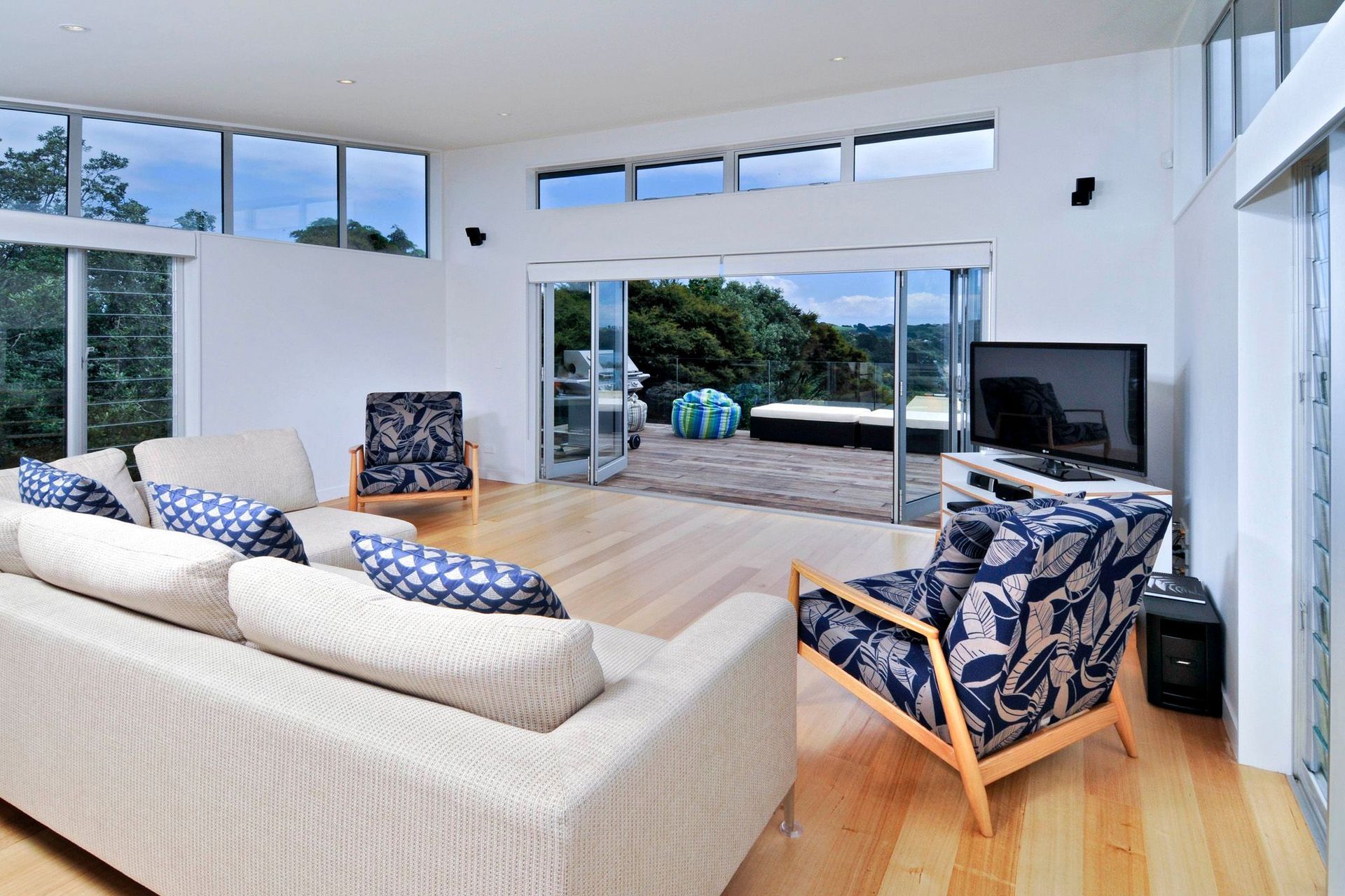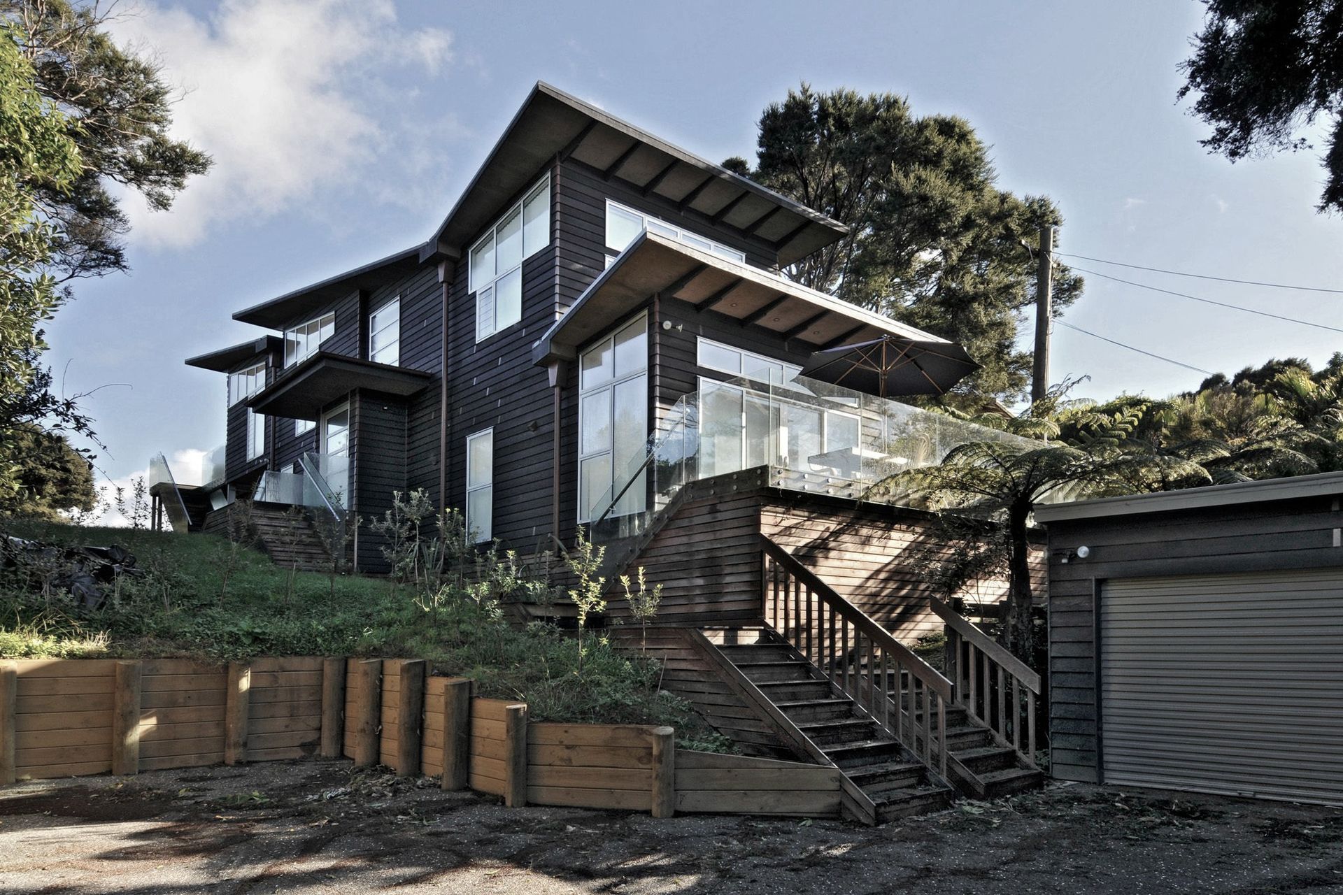 ArchiPro Project Summary - Contemporary 3-bedroom home designed over two levels, featuring stunning views of Onetangi Beach and surrounding bush, with a budget of $600,000 and a winged roof form that enhances natural light and vistas.
