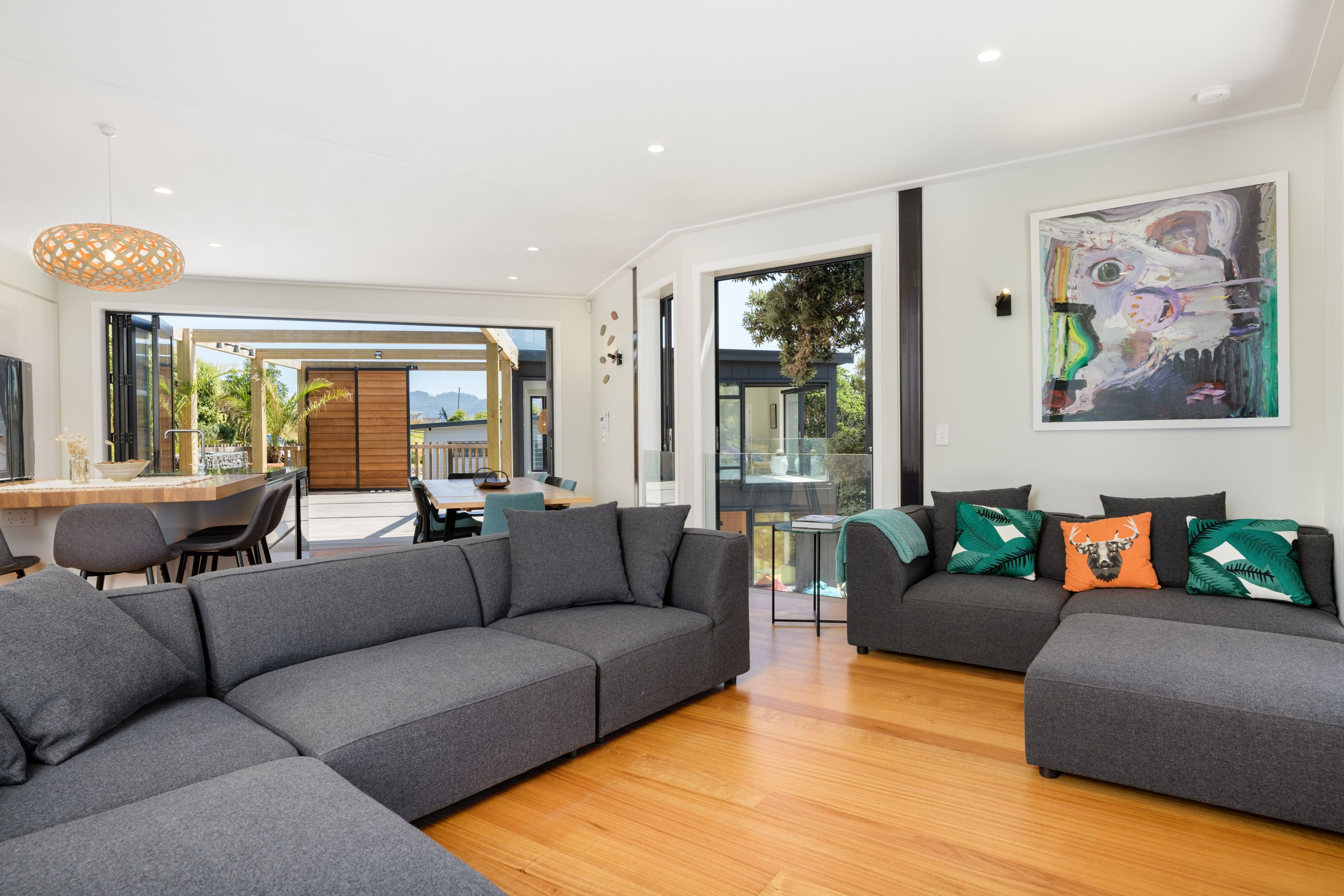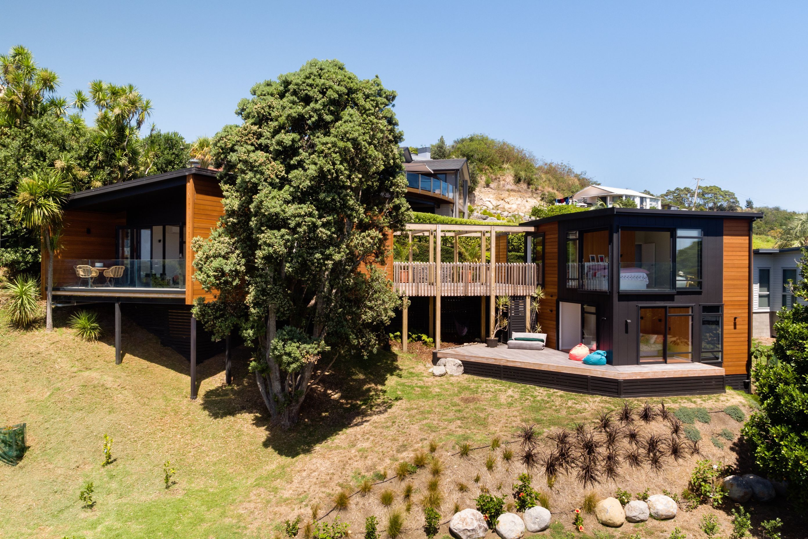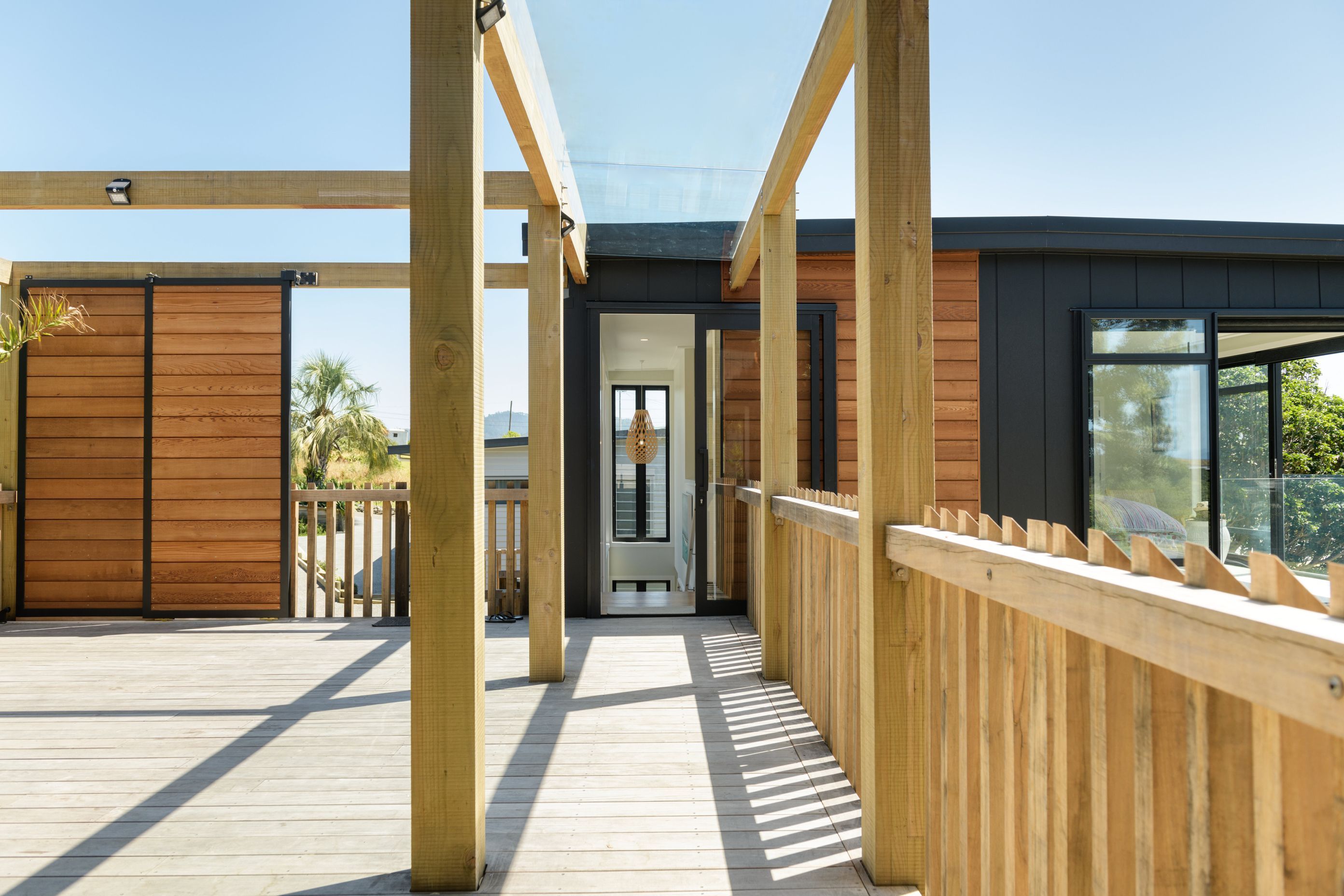 ArchiPro Project Summary - Casa del Arbol: A modern architectural marvel at Waihi Beach, featuring two pavilions connected by a spacious deck, designed to harmonize with nature while providing ample space for entertaining and relaxation.