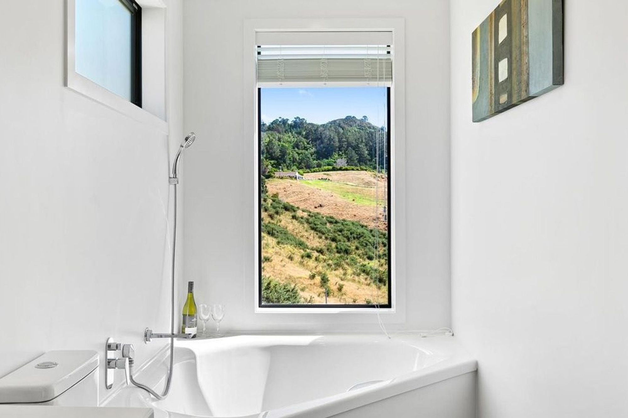 ArchiPro Project Summary - The East Coast Custom project at Waihi Beach features modern architecture with clean lines and expansive glass facades.