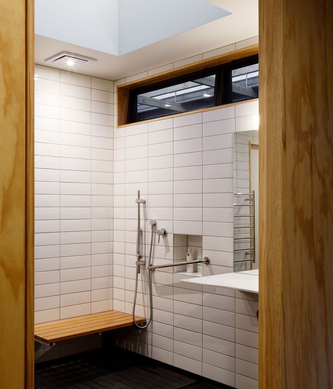 We’ve designed many bespoke elements into the bathroom, such as timber grab rails and a bathtub that can be entered via a door in the side. A lot of the intent, in both the planning and the aesthetics of the wet room, was to make it feel homely, warm and completely un-hospital-like. Materials include black vinyl flooring, feature tiles and plywood-lined walls.