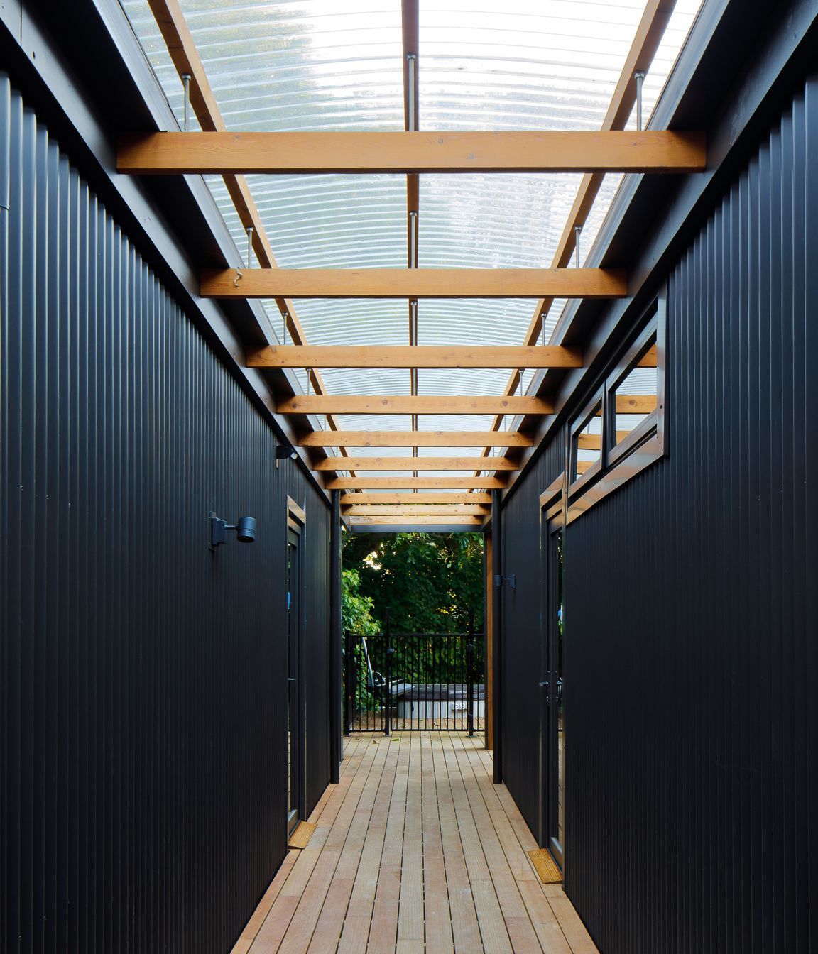 At the front of the middle module is a shared living space with a fireplace and TV, which has a large sliding wall that can be completely closed for privacy but has vision windows installed at the right height and position so the mother and daughter can see each other and feel connected, but still have their own space.