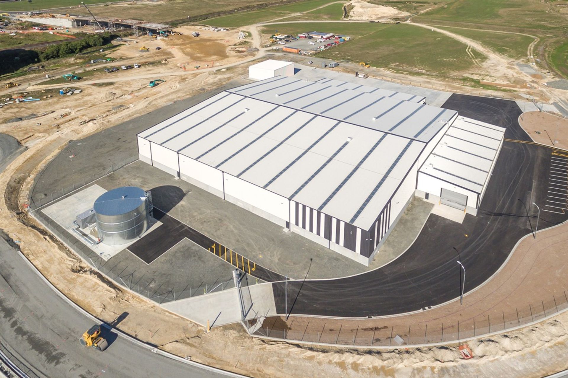 ArchiPro Project Summary - 7,500m² drystore design and build project for Ports of Auckland Ltd at the Waikato Freight Hub, featuring environmental loading areas, office amenities, automated container loading pods, and a dedicated pallet store, completed in 2019.