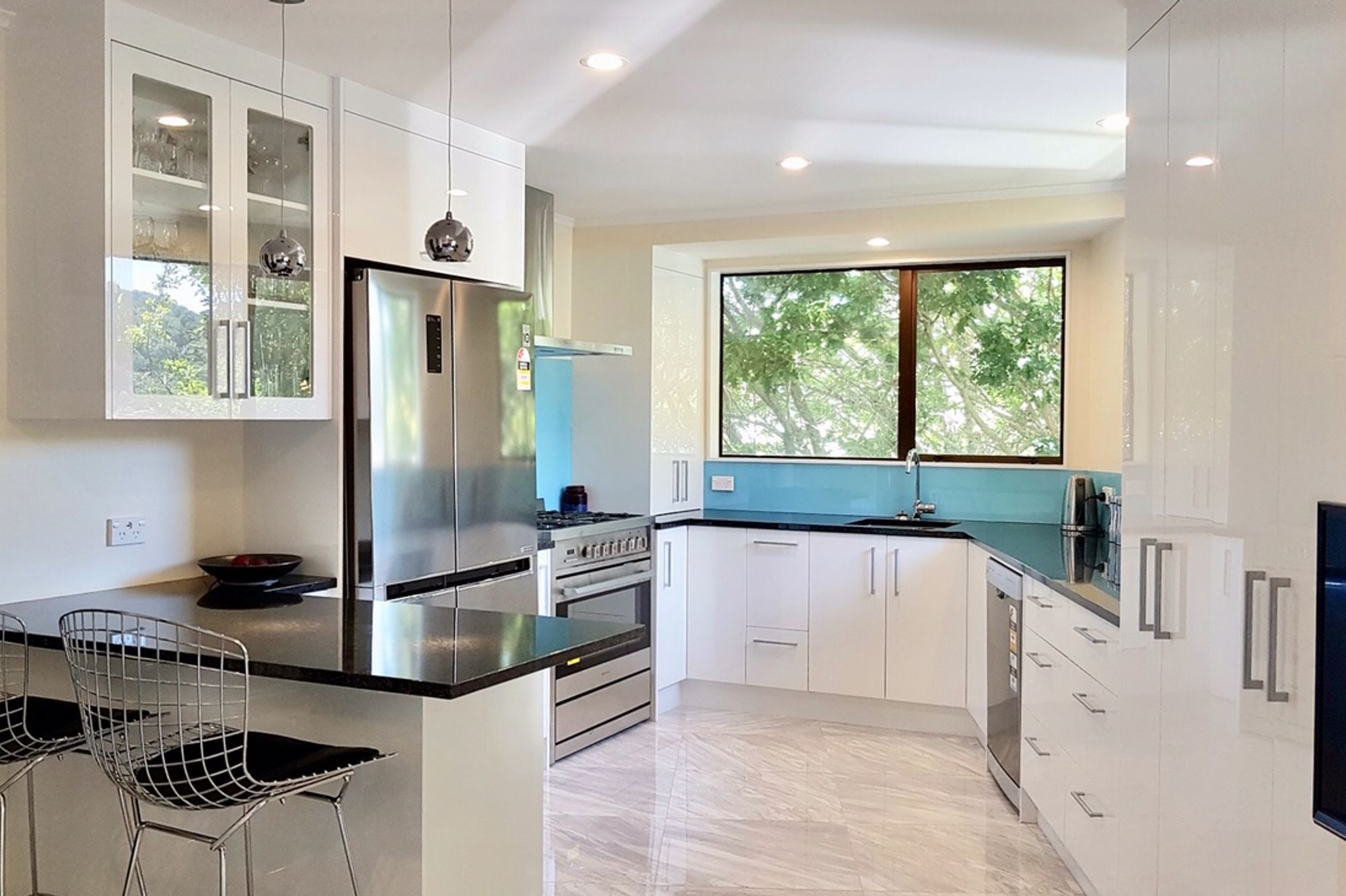 ArchiPro Project Summary - Contemporary kitchen design in Wainuiomata featuring White Gloss Acrylic cabinetry, Angola Black Granite countertops, a Soft Blue Back Painted Glass splashback, and elegant ceramic tile flooring.