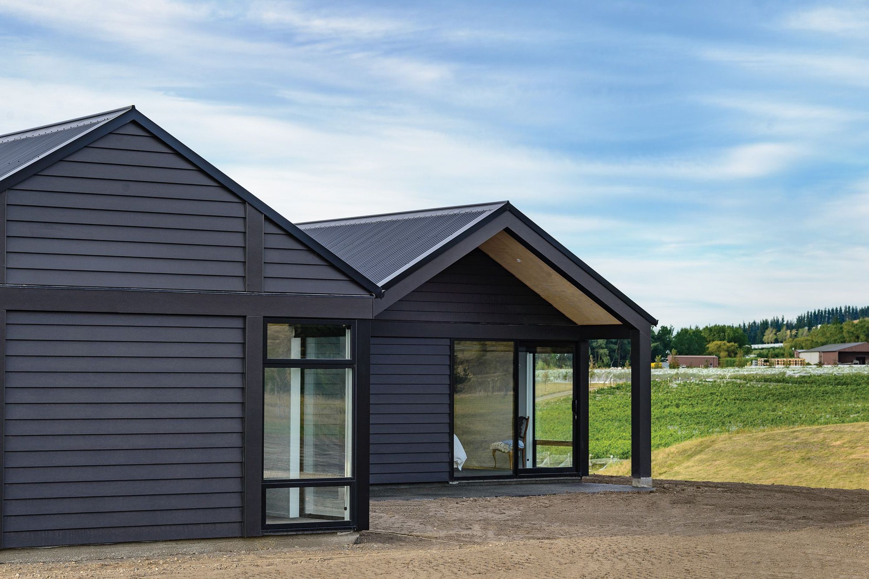ArchiPro Project Summary - A versatile Waipara House featuring two pavilions designed for intimate living and accommodating guests, harmoniously blending with the vineyard landscape through sustainable architecture and a robust, dark exterior.