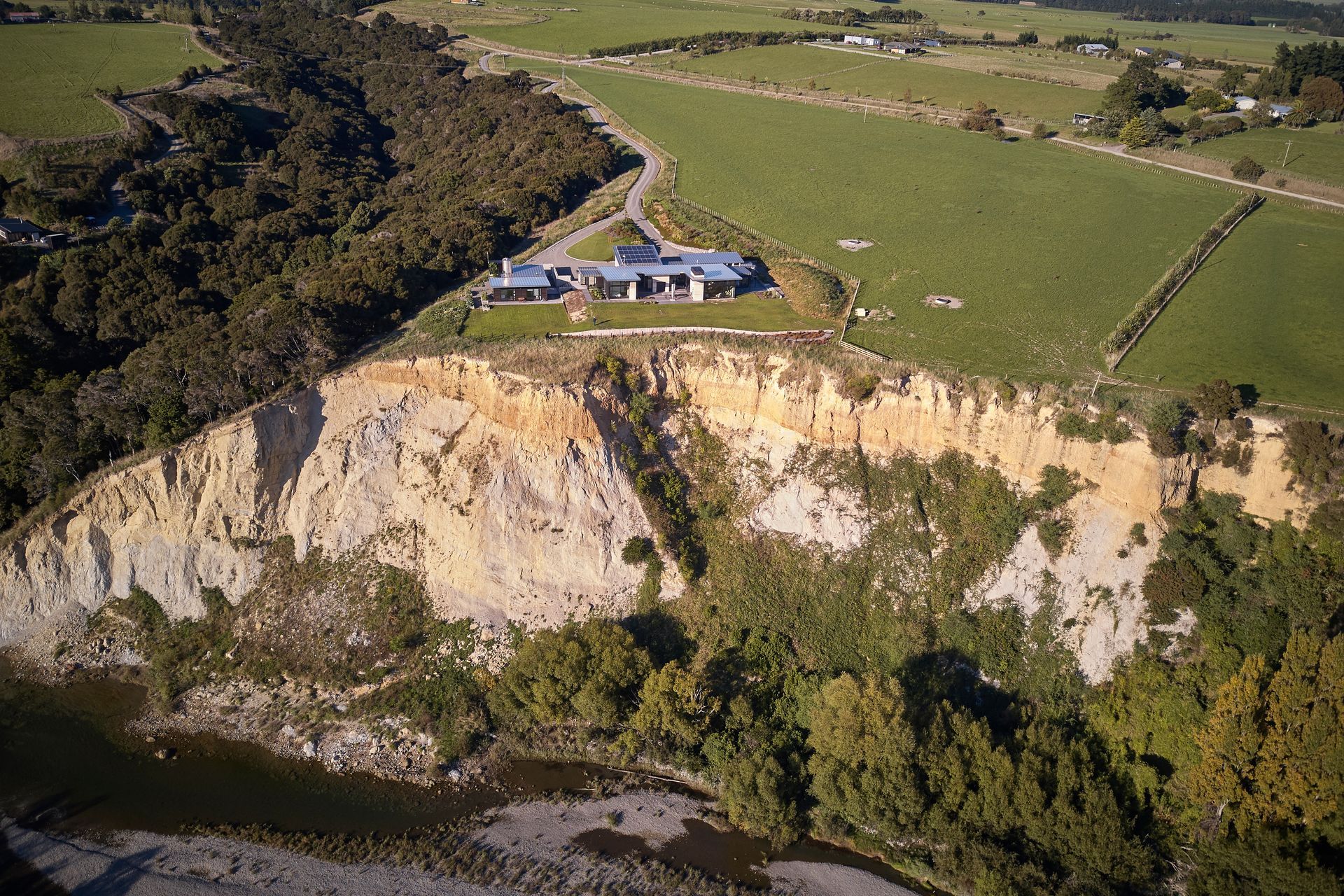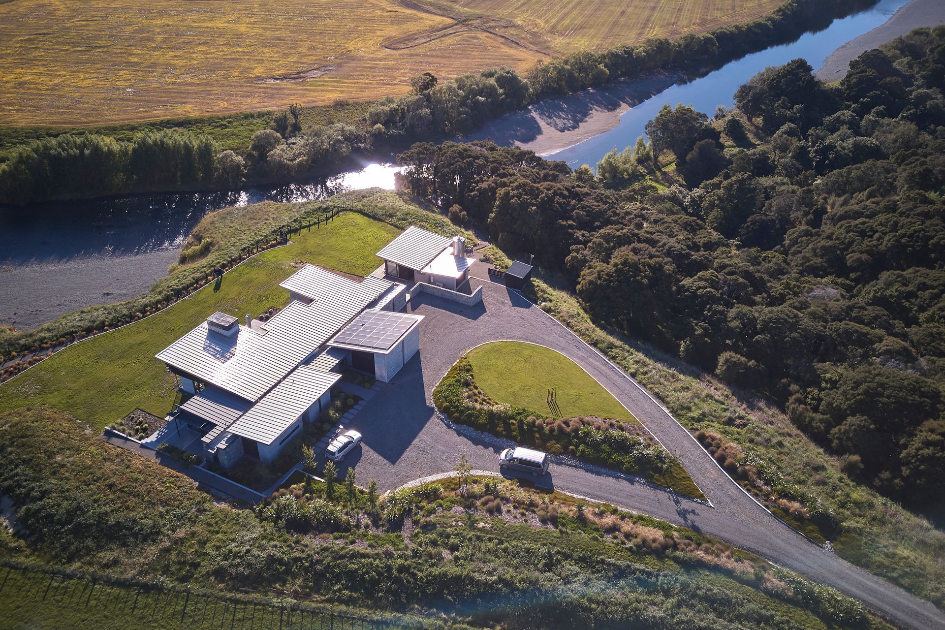 ArchiPro Project Summary - A striking residence on the Ruamahanga River, featuring robust materials and elevated views, designed with a strong East to West axis and a seamless connection to the surrounding rural landscape.