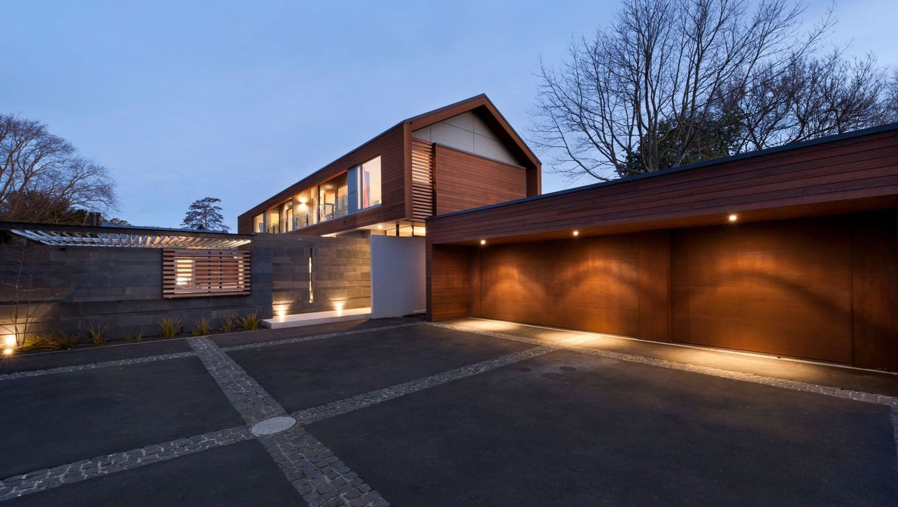 ArchiPro Project Summary - A spacious family home in Fendalton featuring a series of elegant gable forms clad in natural-stained cedar, designed for comfortable living and large-scale entertaining, with dedicated play areas and a sheltered courtyard.