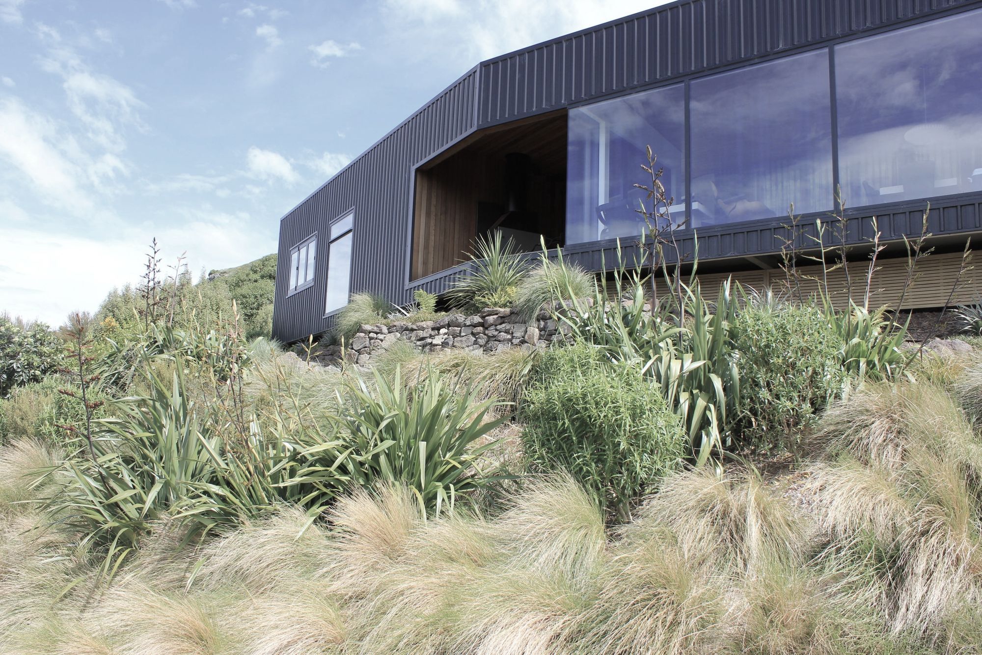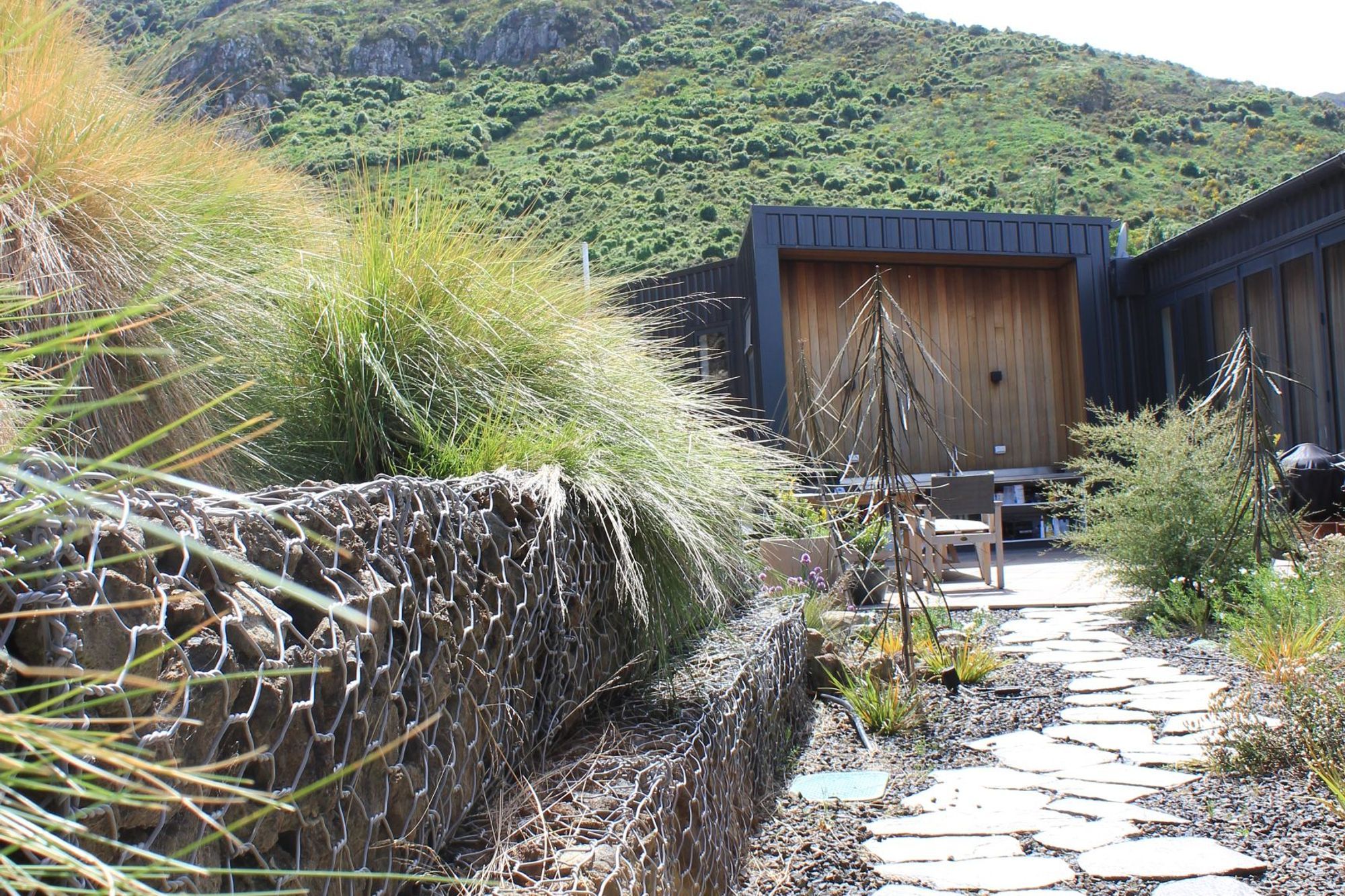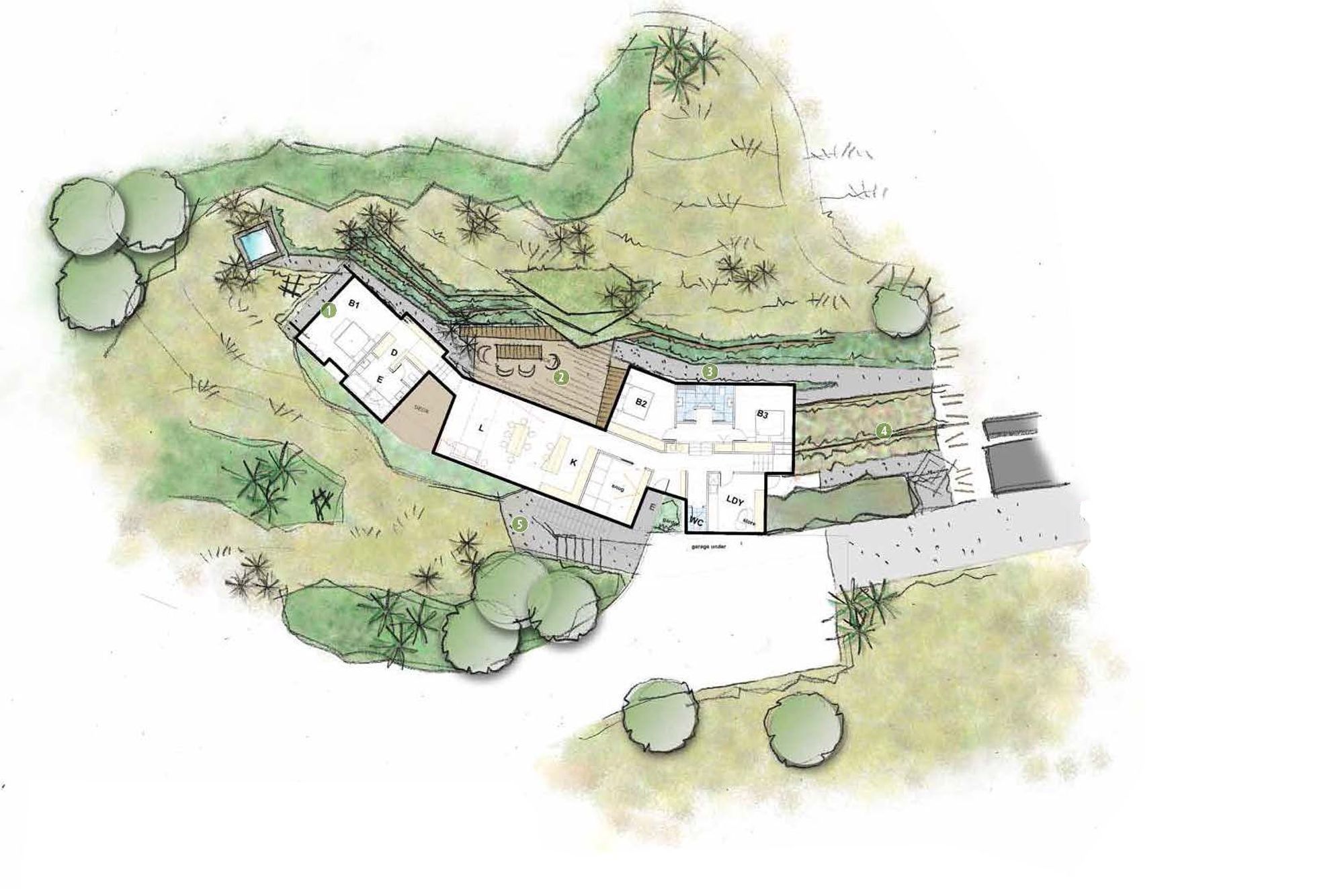 ArchiPro Project Summary - Innovative hillside design in Lyttelton, featuring angular terraces that enhance usability while harmonizing with the natural landscape through native planting.