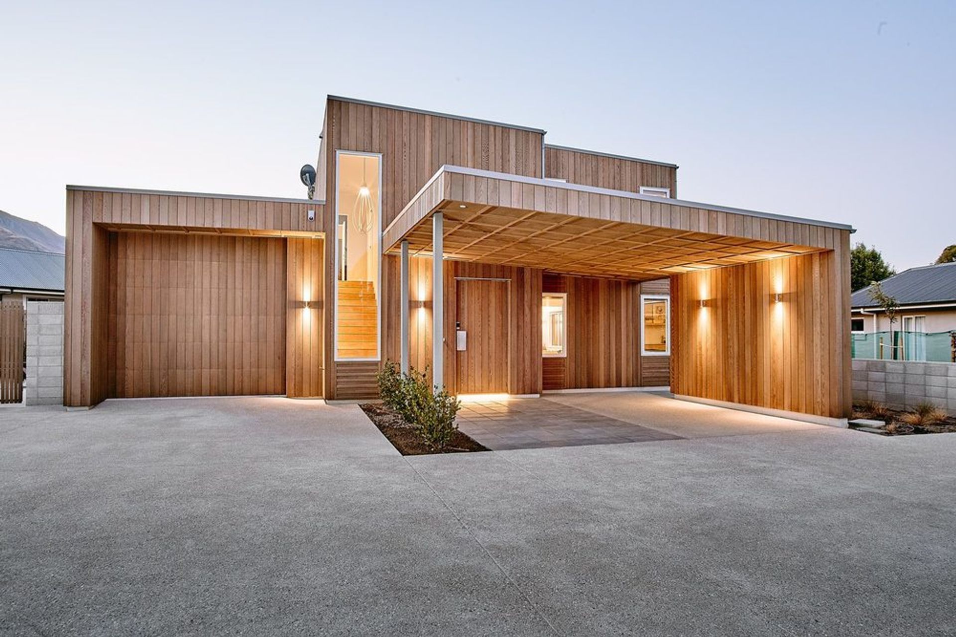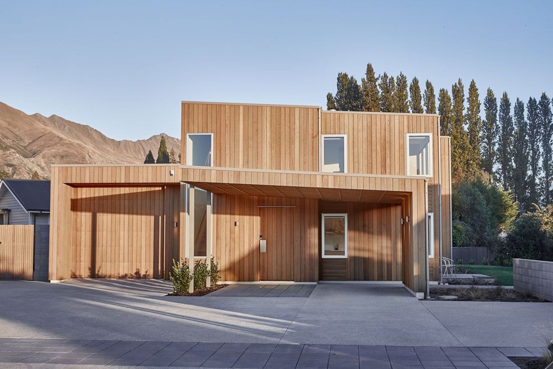 ArchiPro Project Summary - The Wanaka House features a modern design with wood, composite materials, and concrete, showcasing a unique Brutalist style that harmonizes with its natural surroundings.