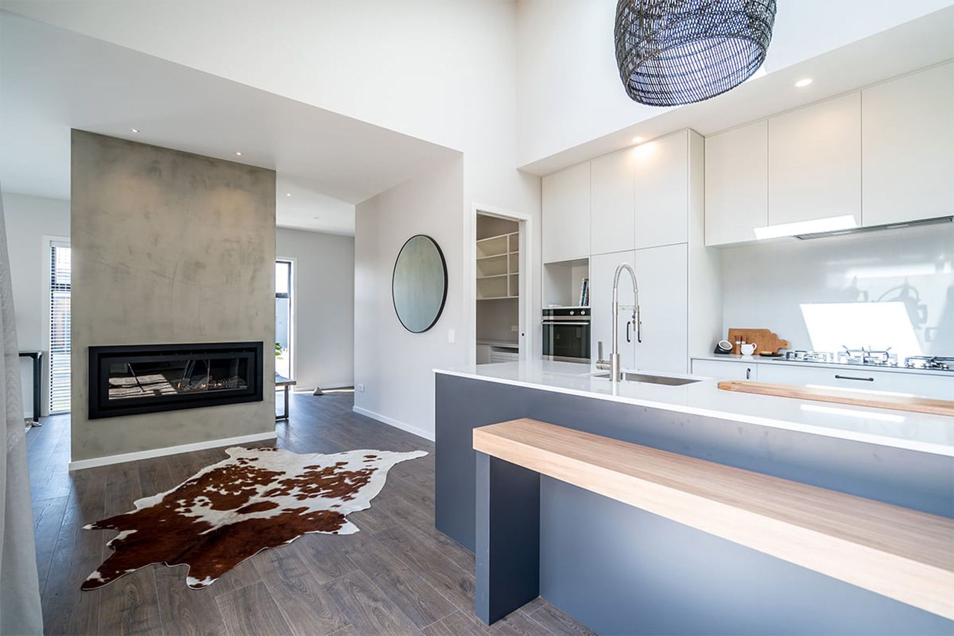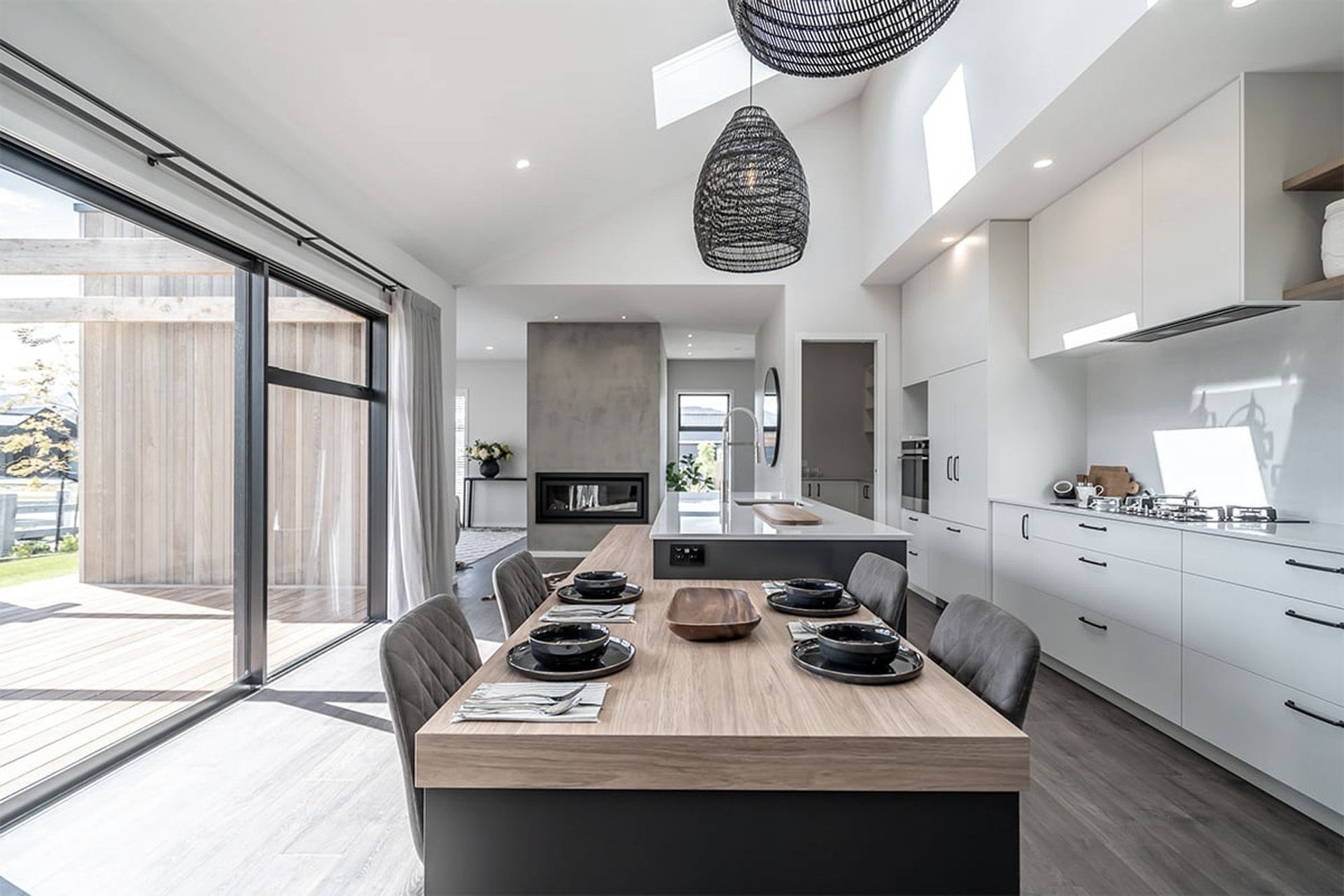 ArchiPro Project Summary - A modern showhome featuring a functional kitchen with a combined island and dining table, floor-to-ceiling cabinetry, and ample storage in an easy-care gloss white finish.
