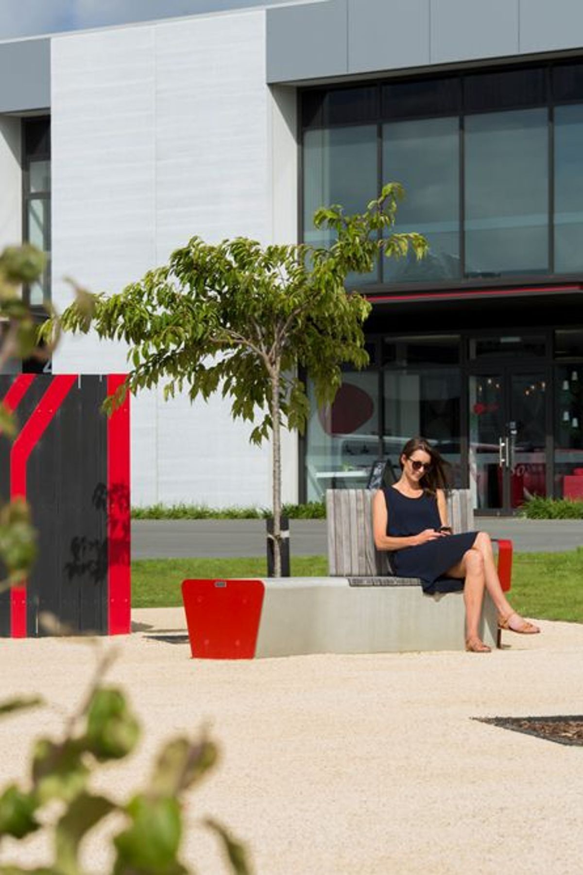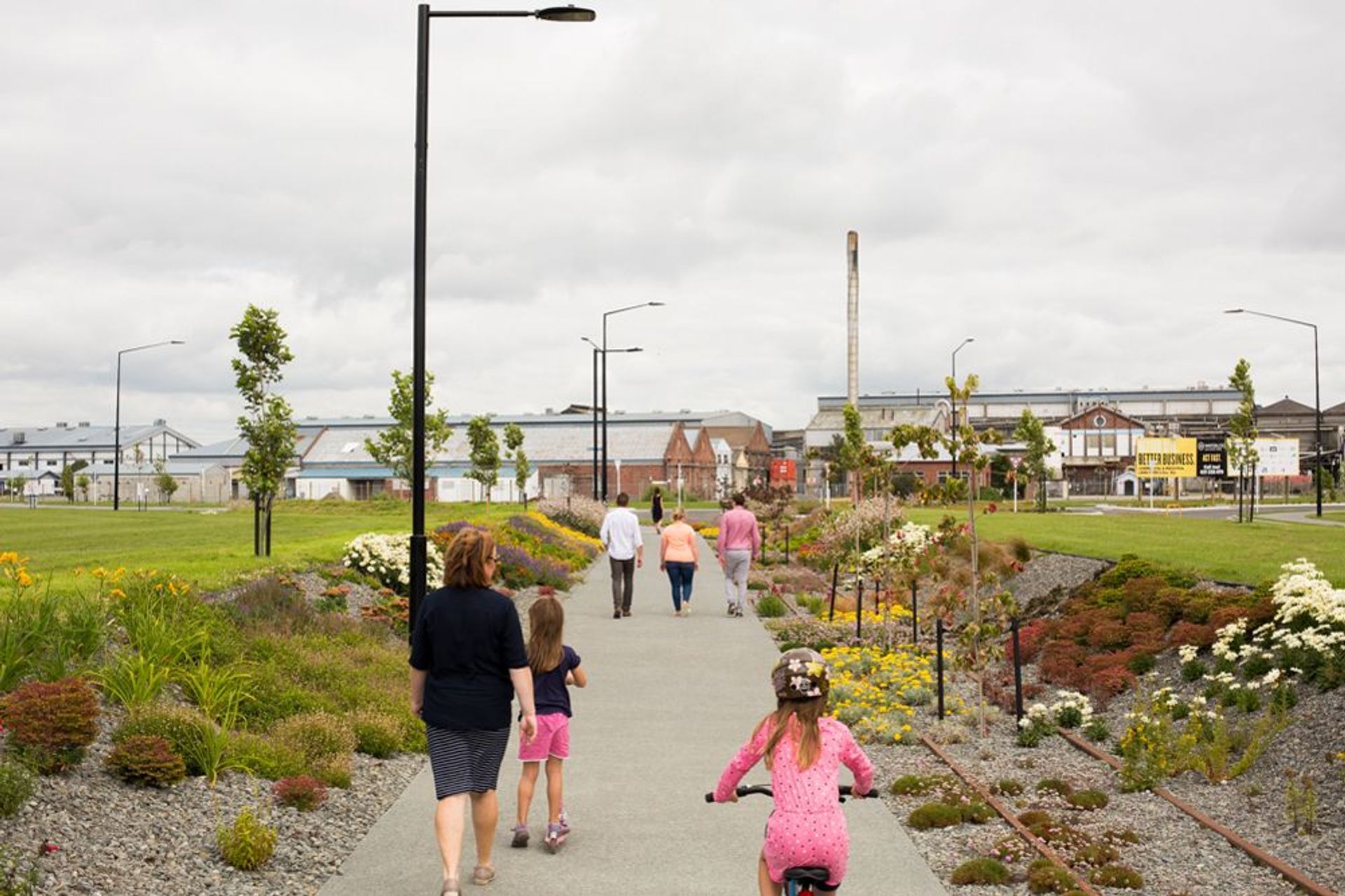 High quality materials, generous pathways and well-maintained garden areas ensure that the streets are an aesthetically pleasing place to be. Street furniture, in a considered palette that references the colours of pipes from the freezing works, is provided at various pause-points in the streets around the development, providing opportunities for workers to gather and socialise. Sustainable storm water collection is managed in raingardens; use of solar power, and a well-maintained planting scheme of trees, shrubs and grasses along the streets and in the parks are a few examples of how WBP aims to better the environment.