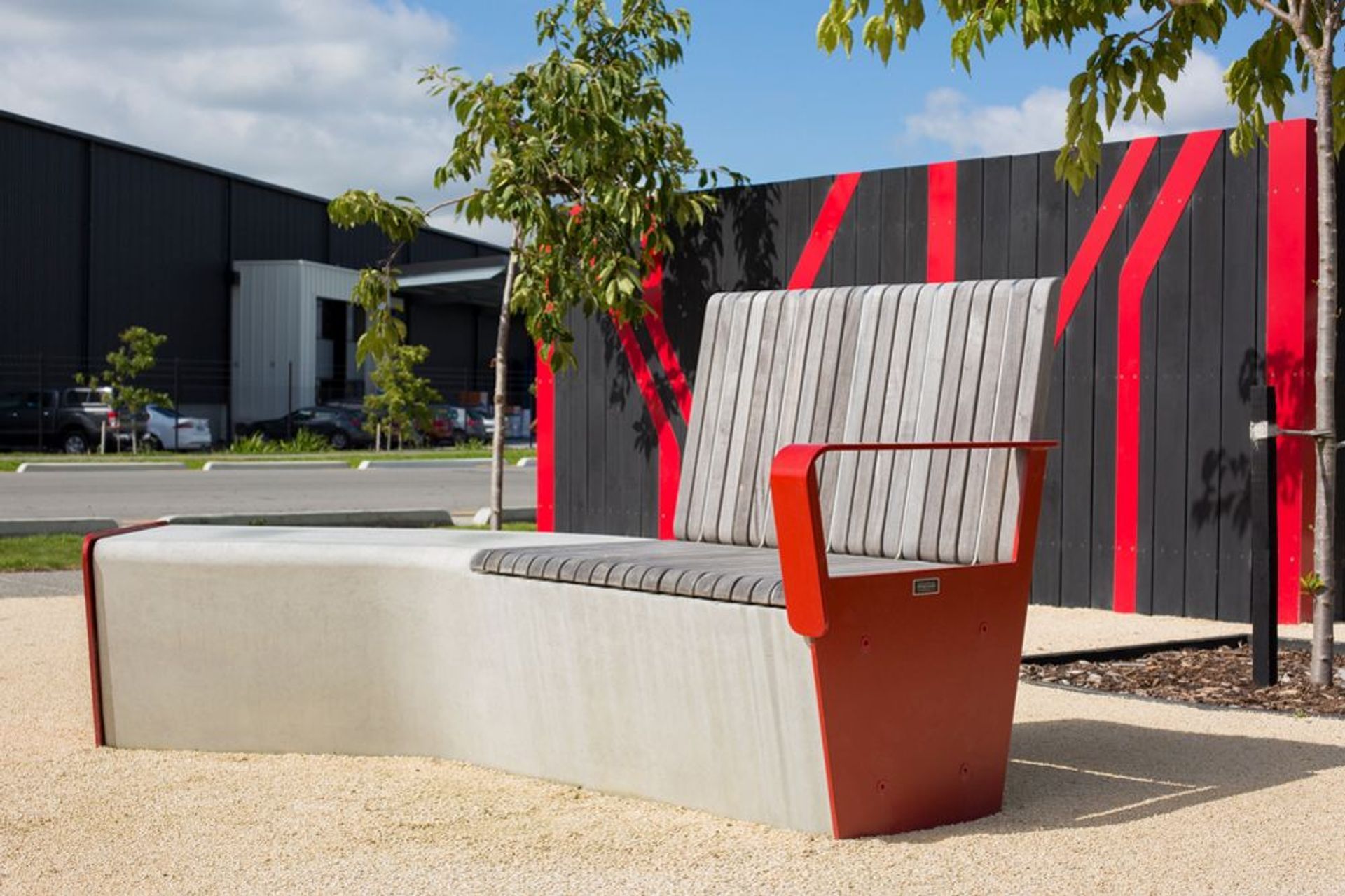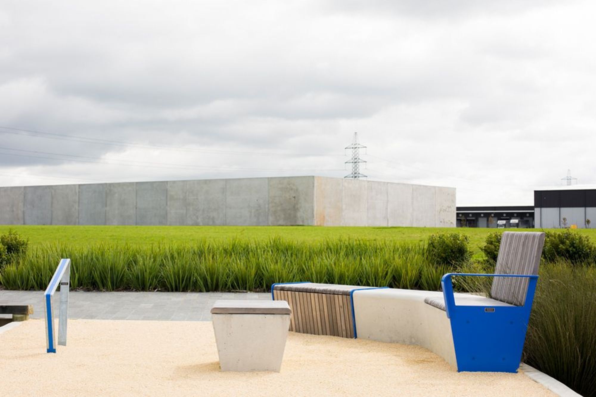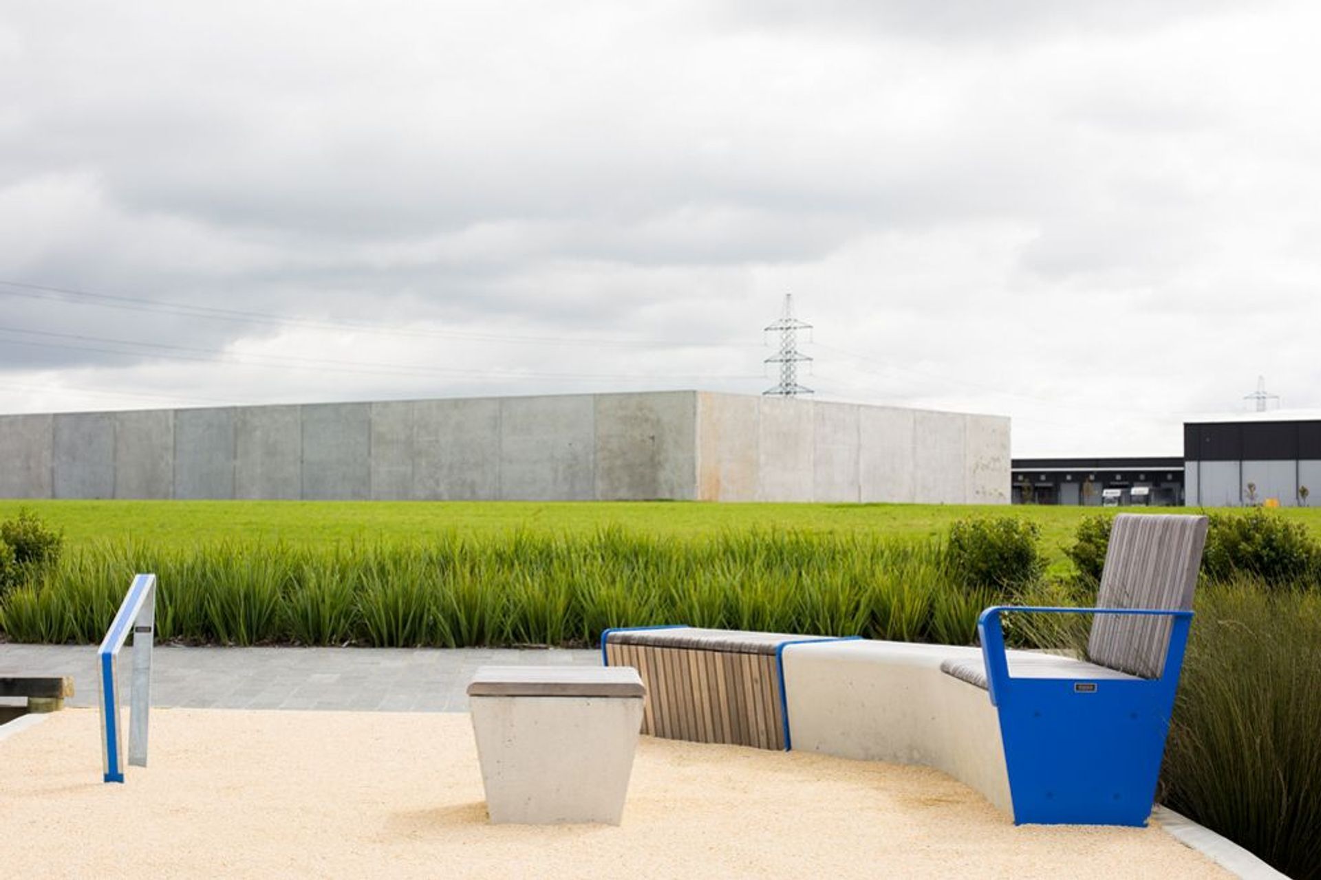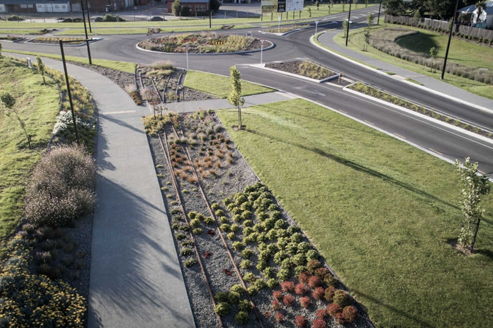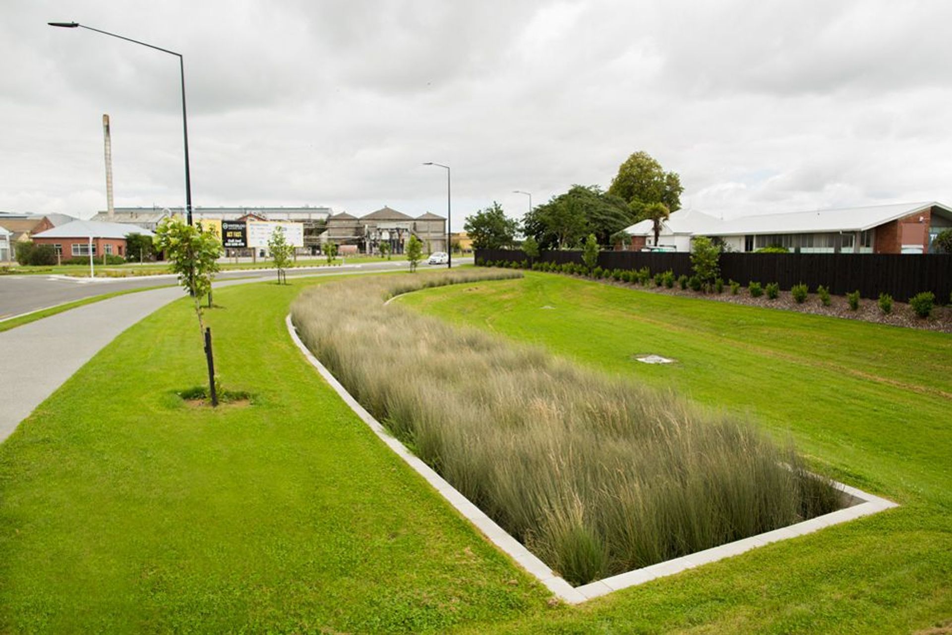 Much of this Christchurch business park’s open space and public realm design was inspired by the industrial character and fixtures from the early 20th century Islington Freezing Works buildings, with design cues taken from the extensive colour-coded pipe network and surrounding infrastructure. The main entrance into the business park references historic elements of the founding of the original freezing works at the time of the Industrial Revolution, the associated ‘Gardenesque’ movement, and the use of rail for transportation of goods. Throughout the 114-hectare development, street furniture and the planting scheme reflects the red, yellow and blue colour-coding used on the pipe network in the old freezing plant. These visual references to the remaining buildings and fixtures of the Freezing Works provide a point of difference. “We’re aiming to create a distinct sense of place that reflects, in the choice of materials and colour palette, the underlying alluvial landscape of the Canterbury plains as well as the site’s industrial past,” says Mark Brown, Boffa Miskell’s lead design on the project.
