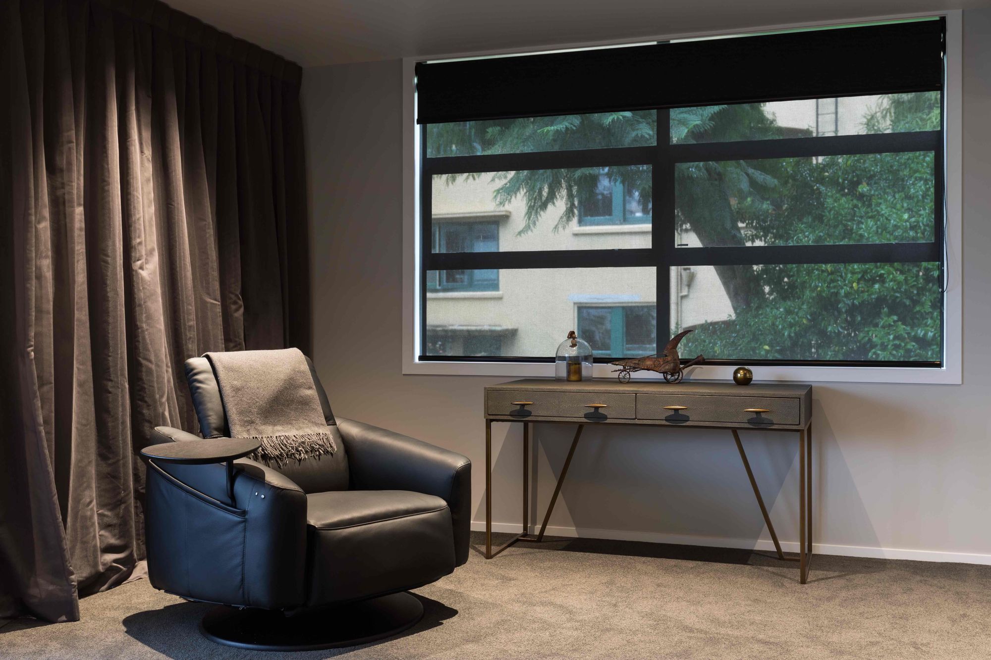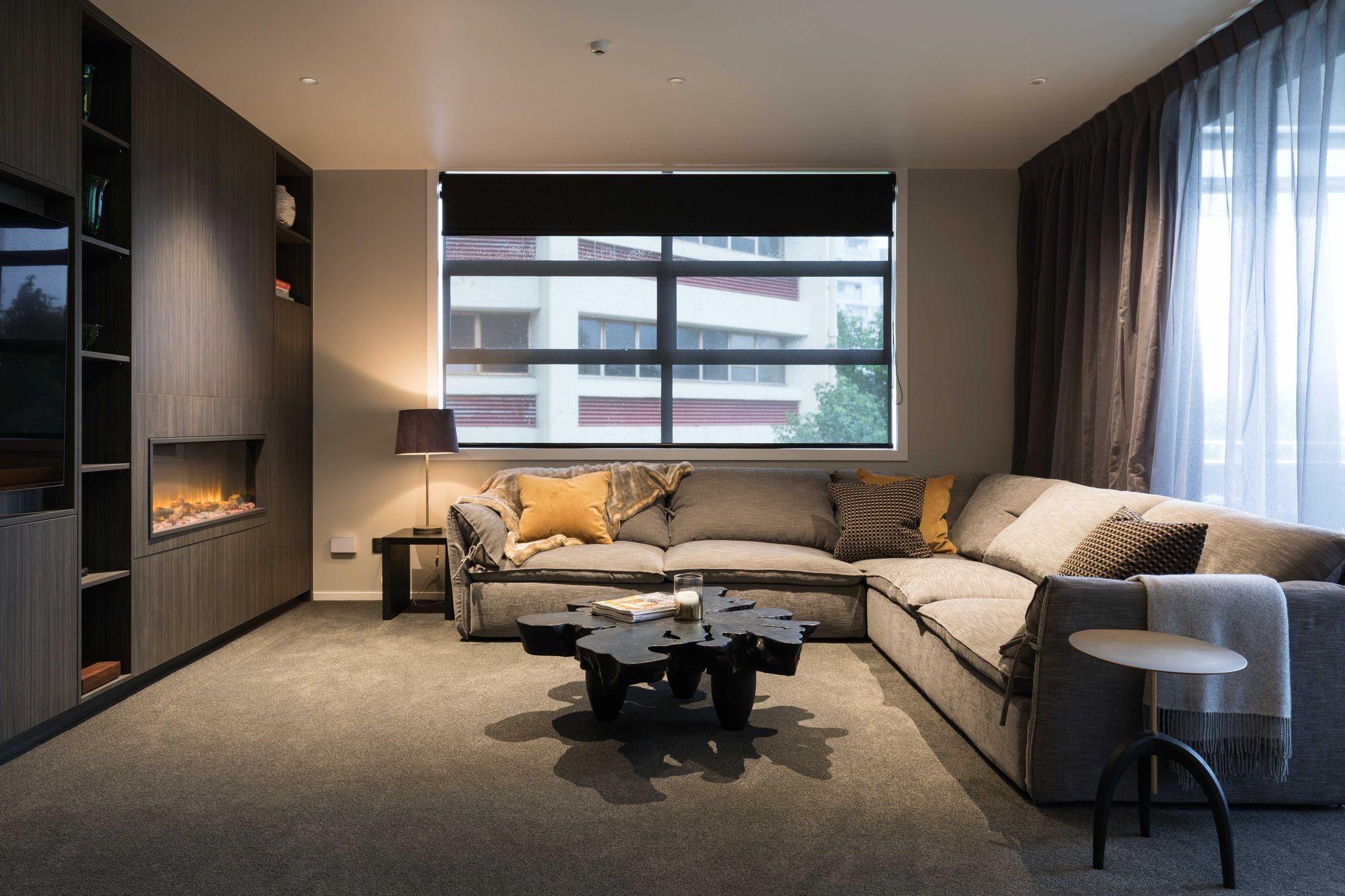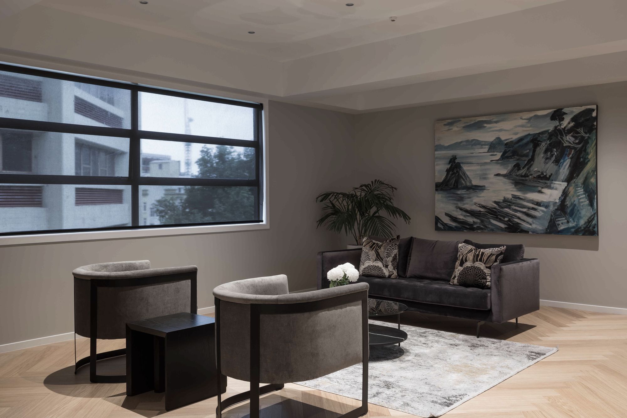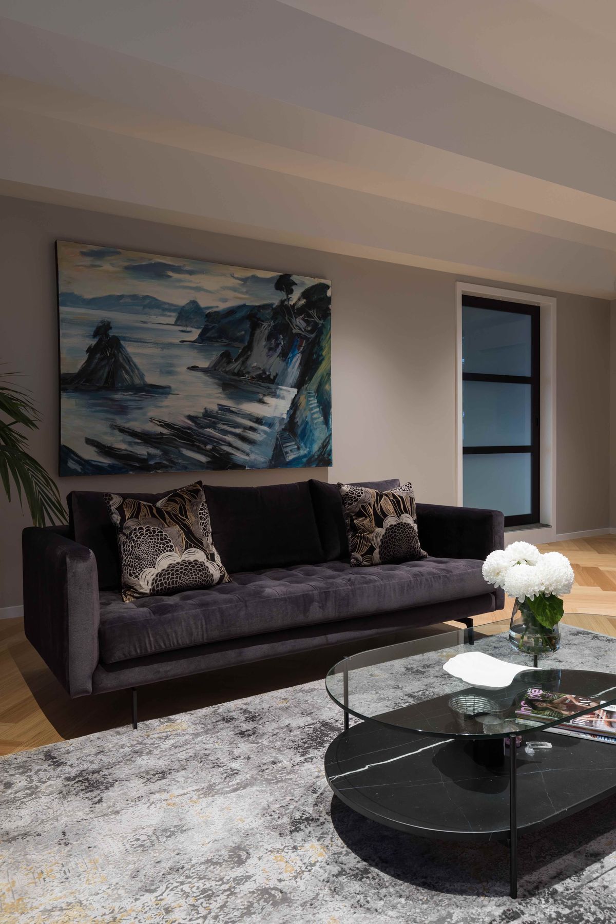 ArchiPro Project Summary - Transformation of a central CBD barrister chambers into a luxurious New York loft-style apartment featuring two bedrooms, a study, and bespoke cabinetry, complemented by a striking black and light oak color palette.