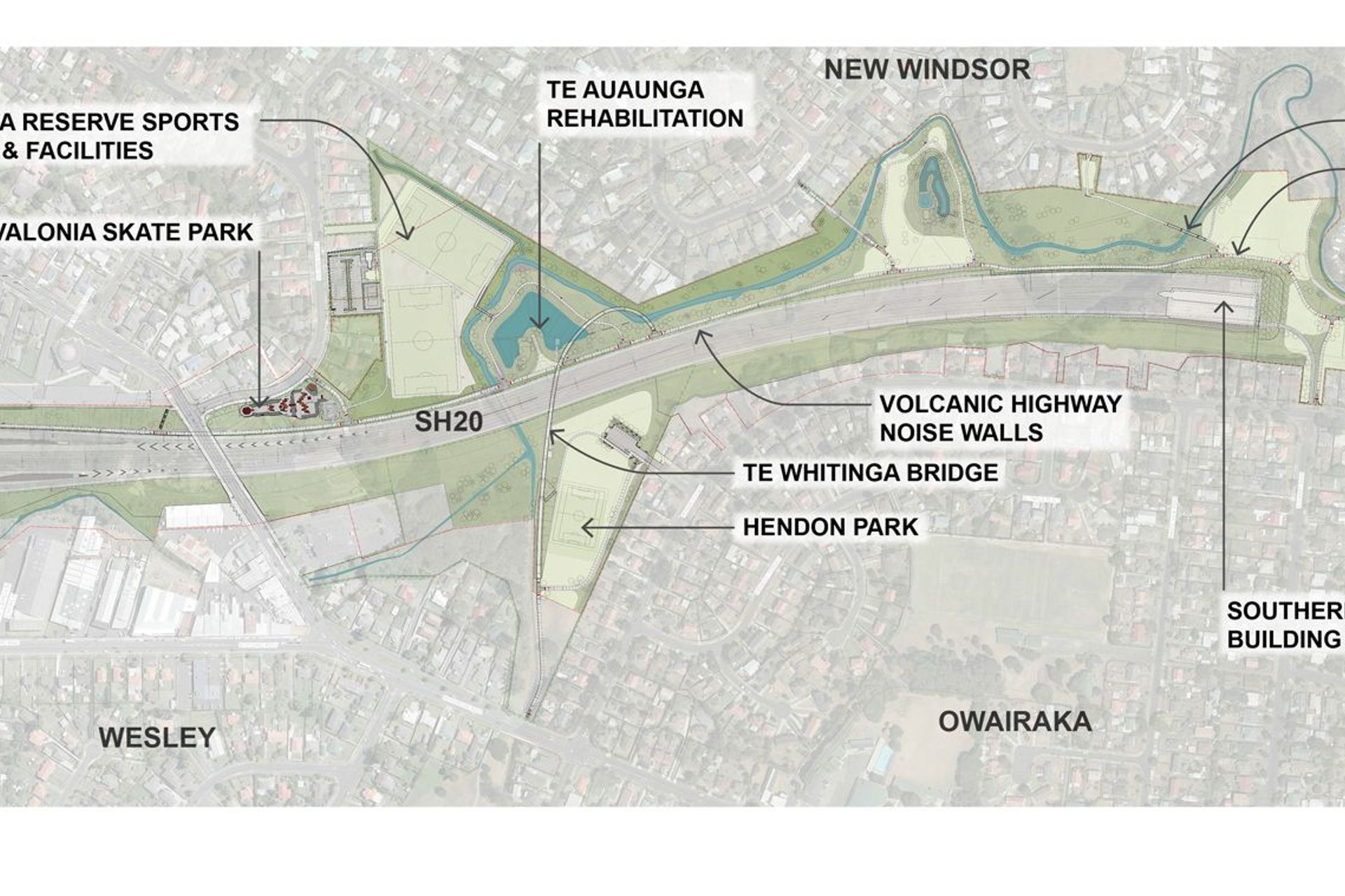 This section of SH20 route was envisaged as the ‘Volcanic Highway’ as it passed through the Pukewiwi (Mt Roskill) and Owairaka (Mt Albert) volcanic fields. The Specimen Design recognised this design direction and developed responses appropriate to that theme. These were largely unseen by the wider community and once they were made public, there were some strong reactions, namely to noise wall designs, ventilation building concepts and the lack of suitable mitigation to the loss of public open space.