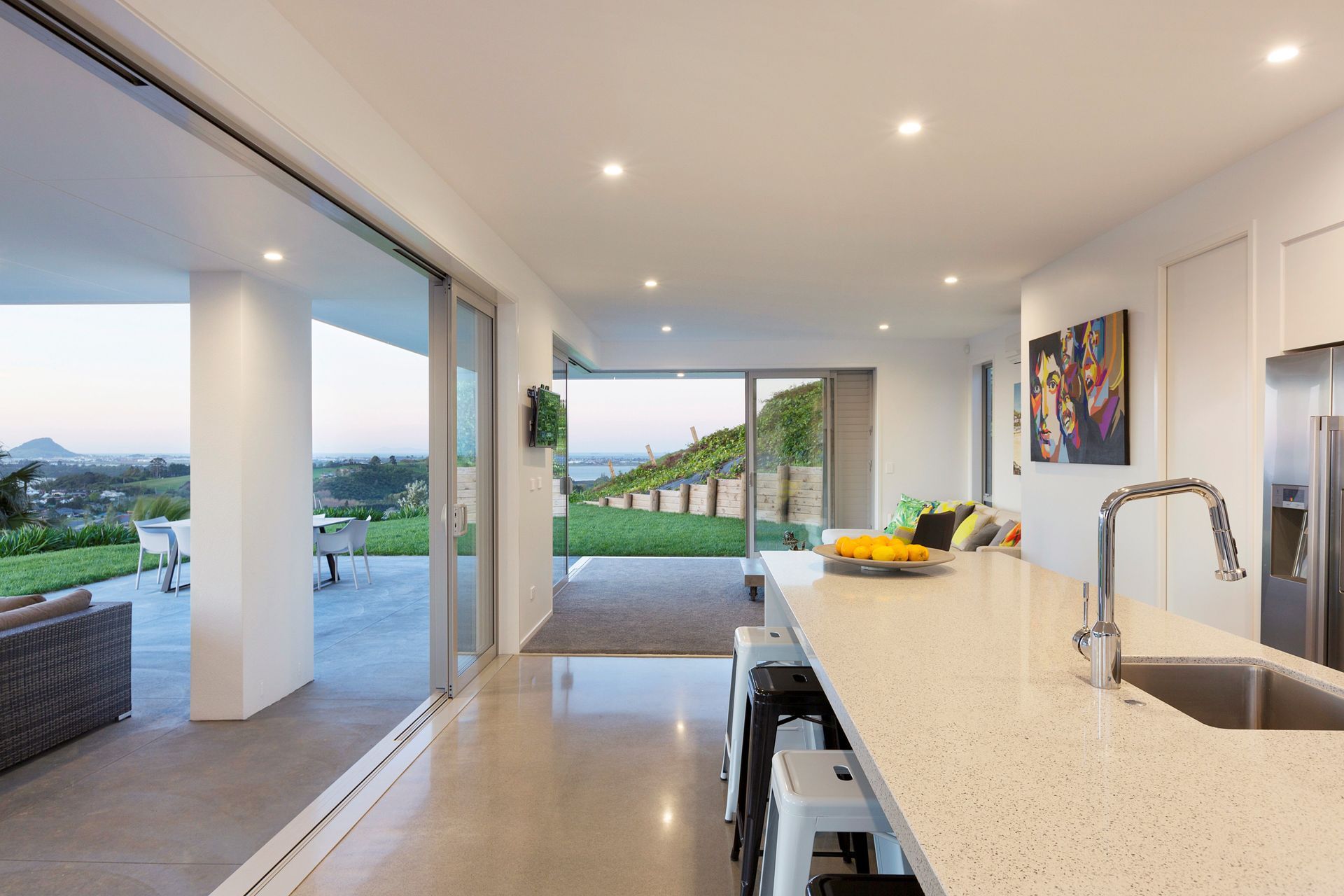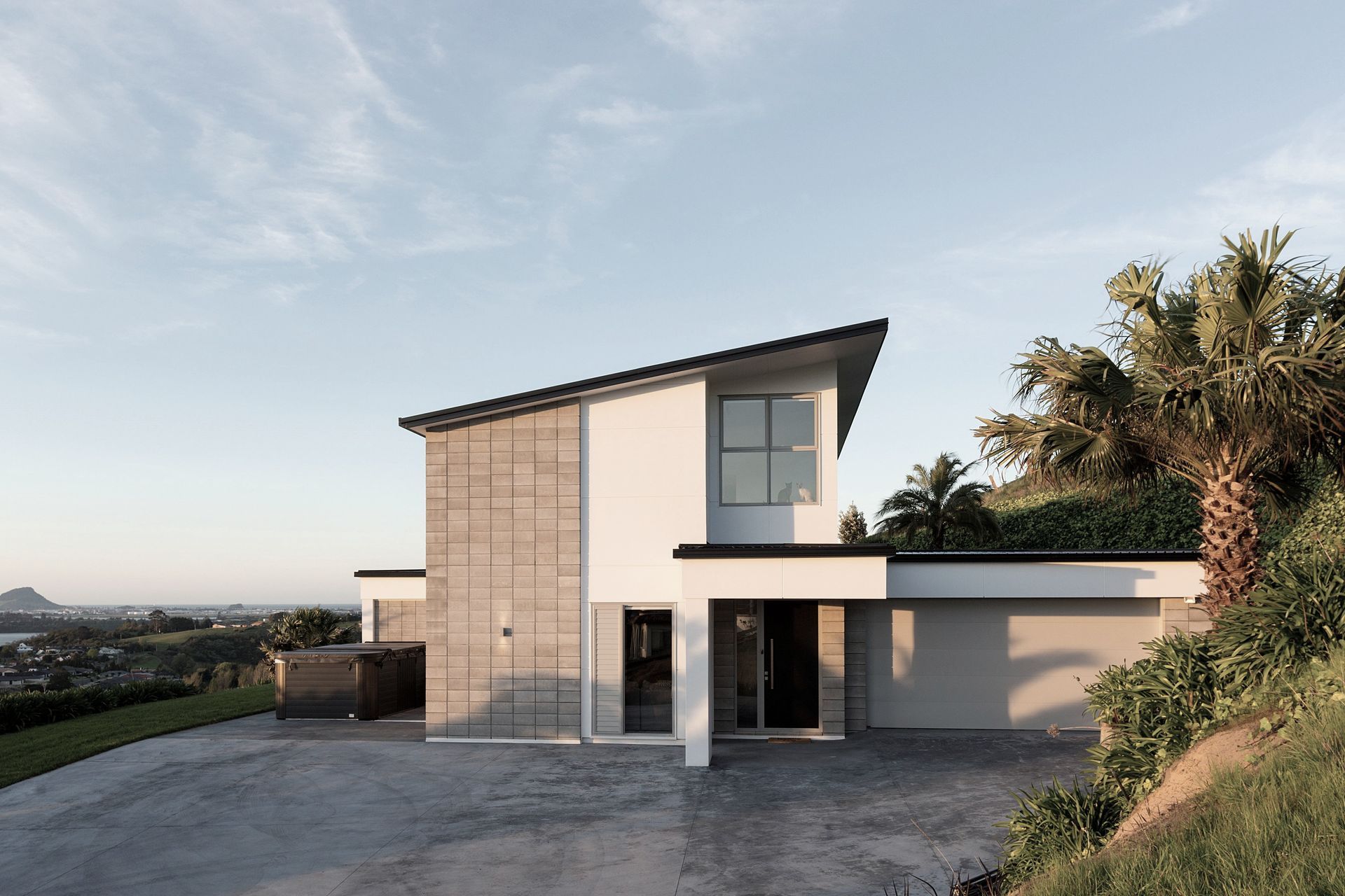 ArchiPro Project Summary - Contemporary 2-storey hillside home designed by Davista Architecture Ltd, featuring stunning north-west views, 5 bedrooms, 4 living areas, and a spacious alfresco outdoor room, completed in collaboration with Calley Homes.
