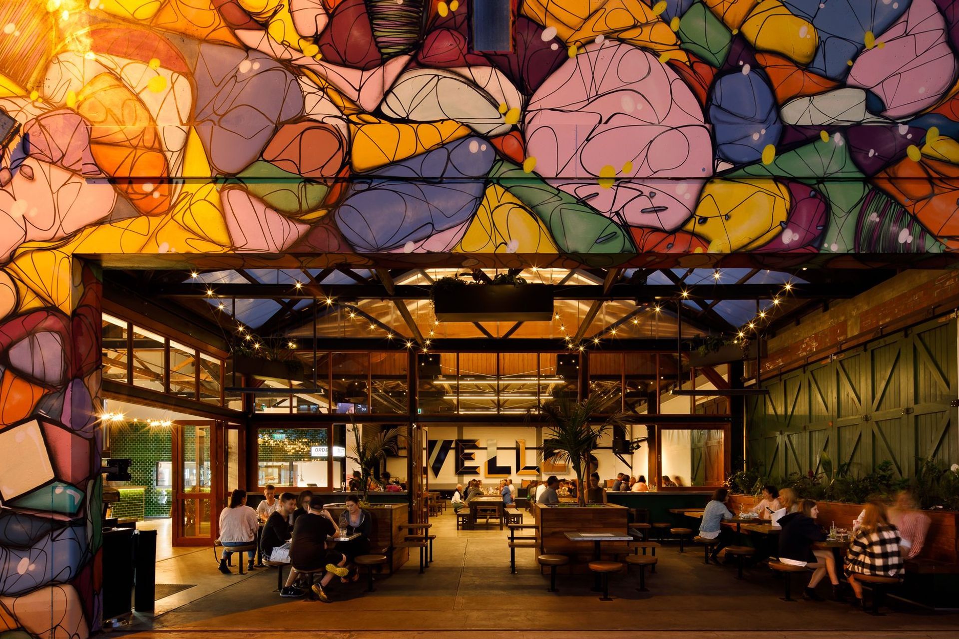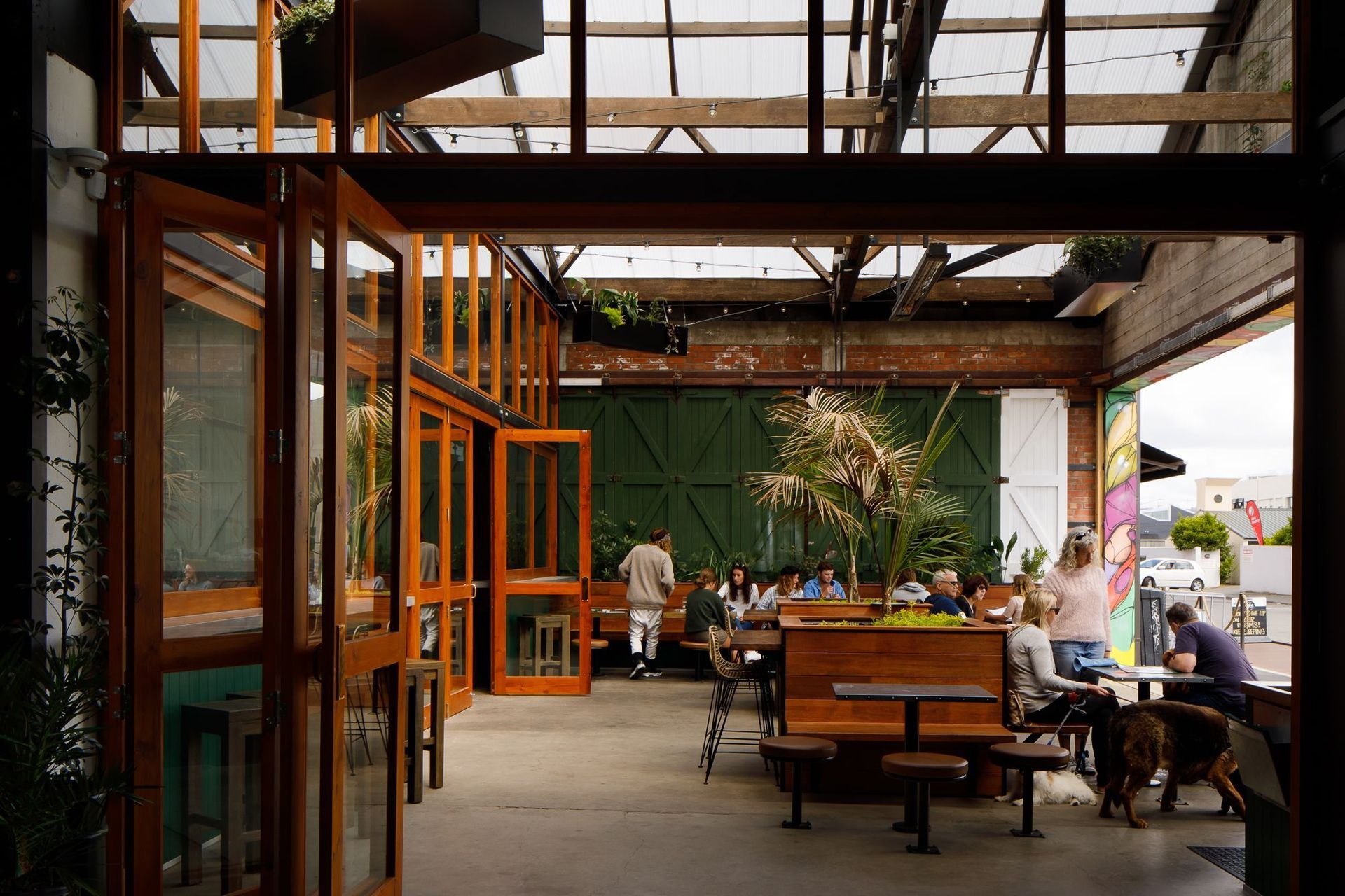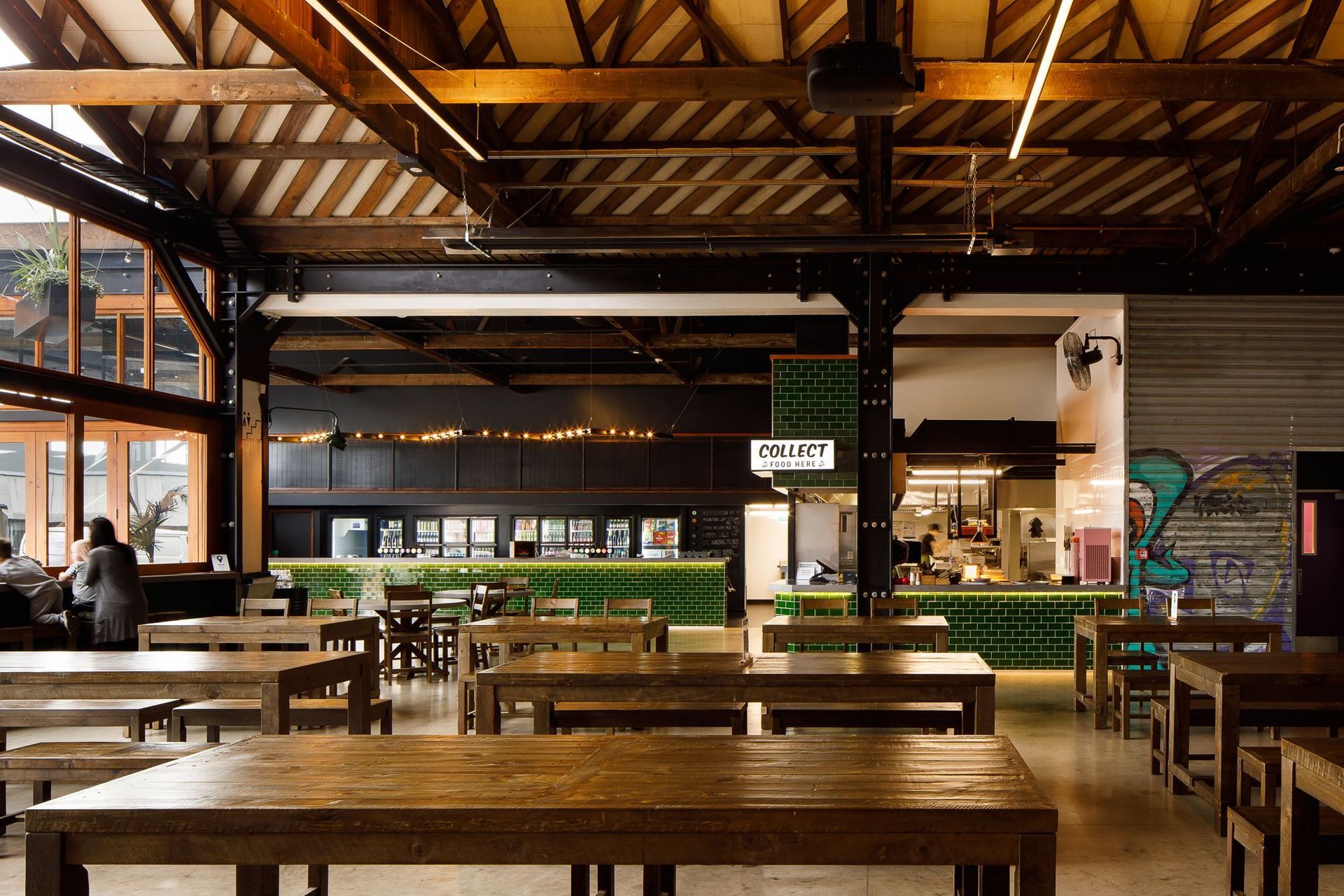 ArchiPro Project Summary - Transformation of a former grocery warehouse into a vibrant hospitality venue featuring casual dining spaces, a light-filled covered outdoor area, and a stylish mezzanine floor, all enhanced by a beautiful mix of materials and colors.