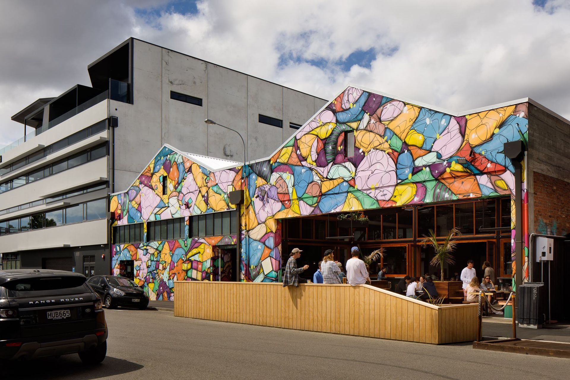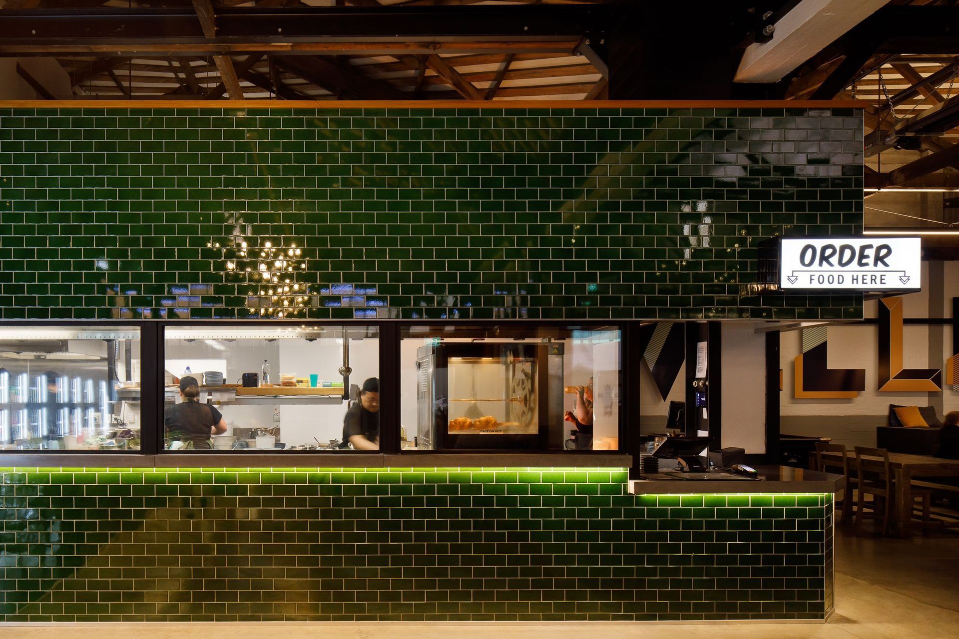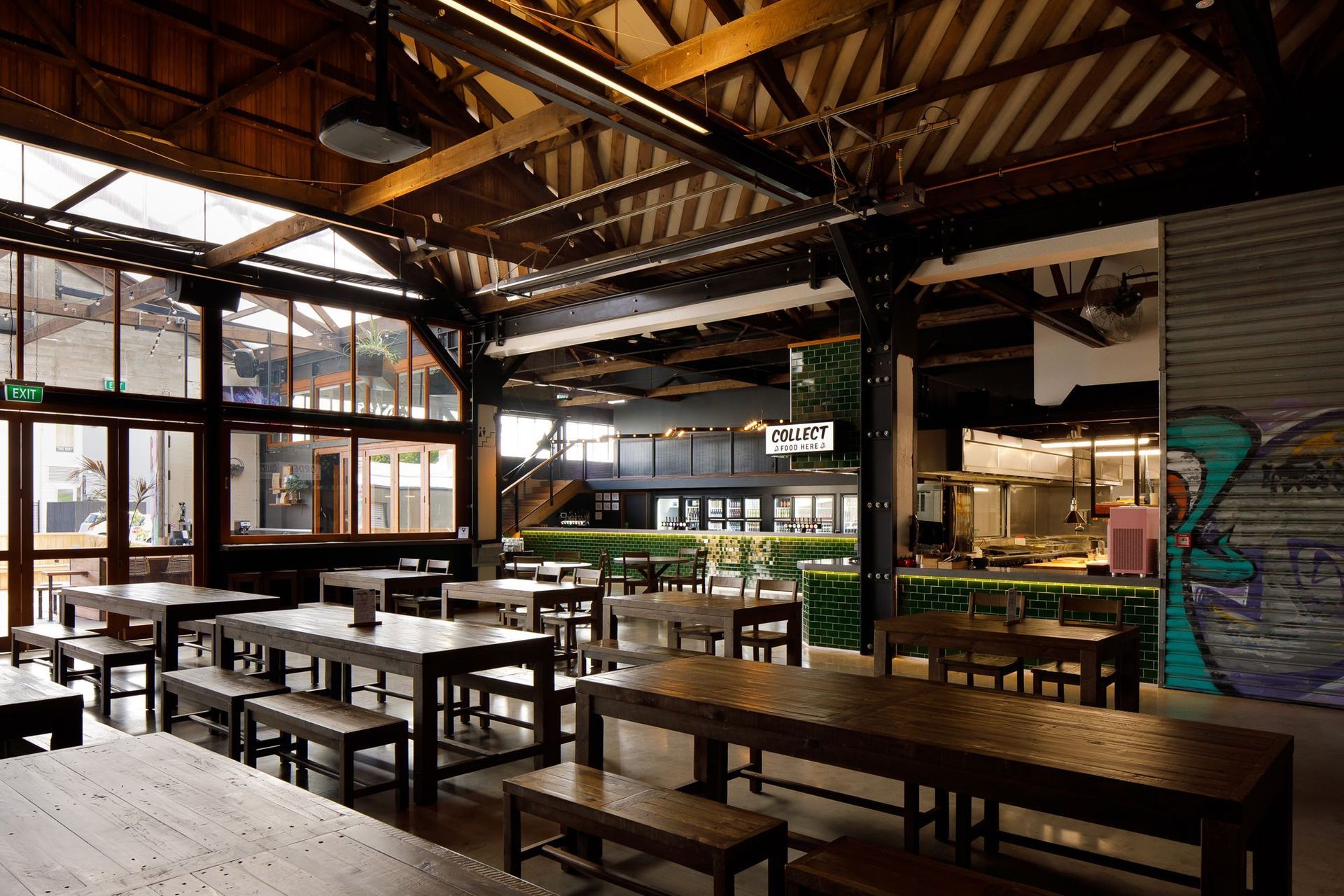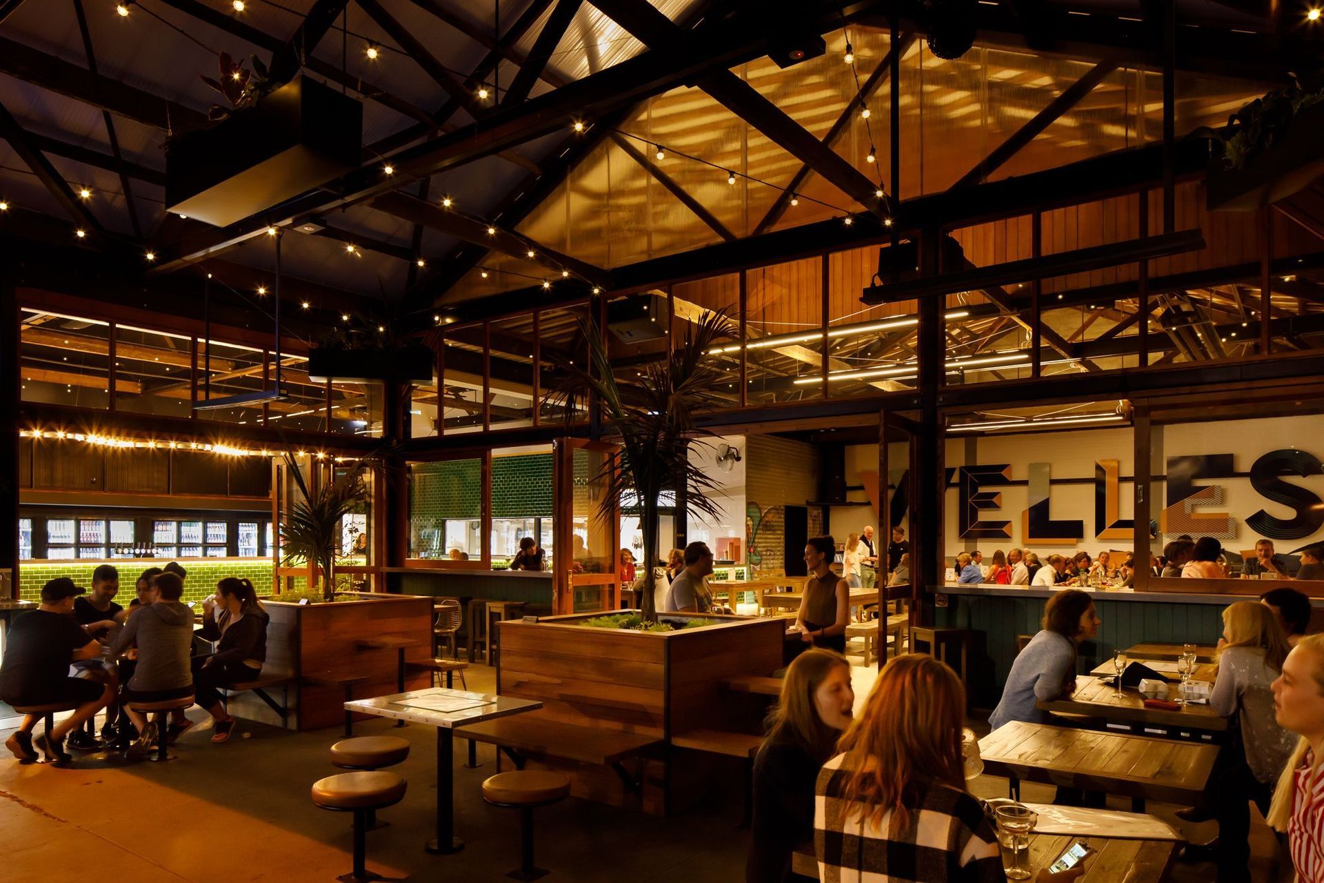 ArchiPro Project Summary - Transformation of a former grocery warehouse into a vibrant hospitality venue featuring casual dining spaces, a light-filled covered outdoor area, and a stylish mezzanine floor, all enhanced by a beautiful mix of materials and colors.