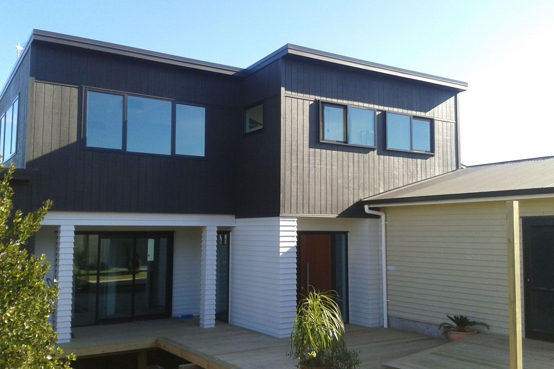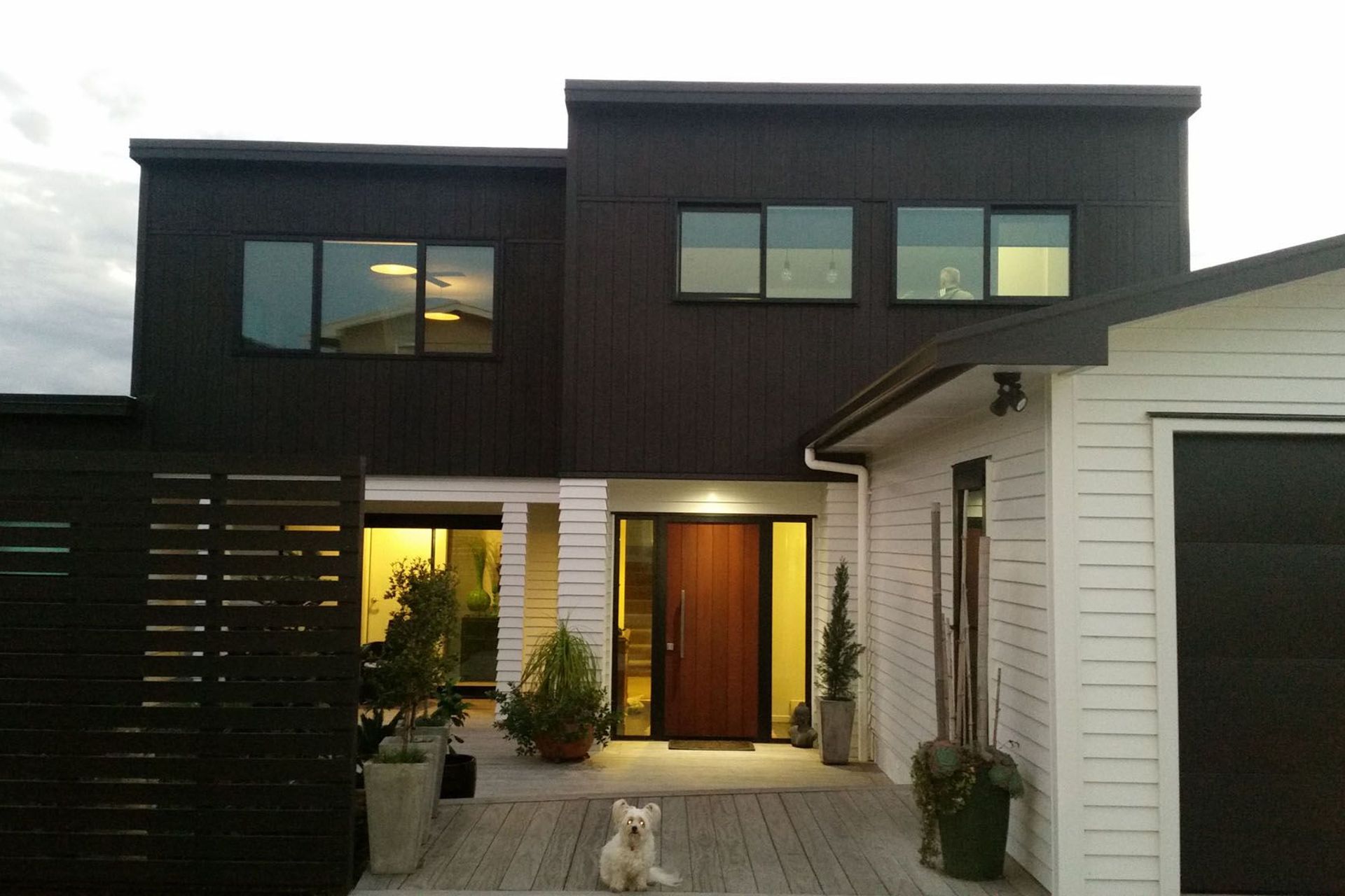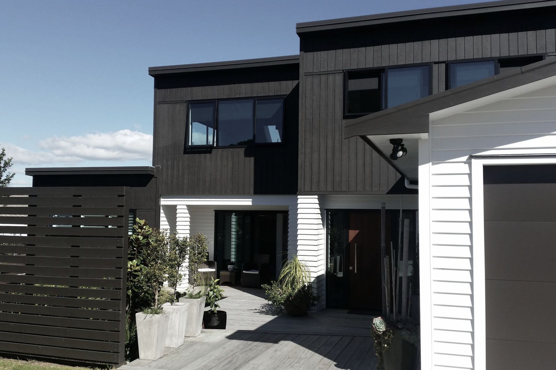 ArchiPro Project Summary - Innovative construction on a tight site, featuring a modern design with timber bevelback weather boards and a powder-coated aluminium balustrade, completed in 2016 at Wells Ave, Mt Maunganui.