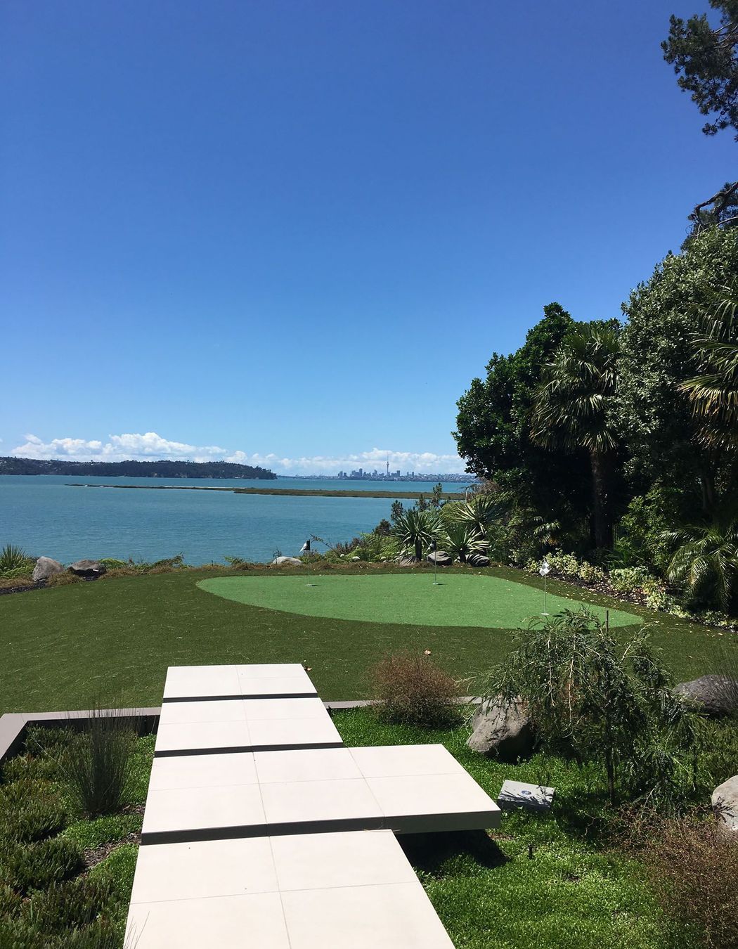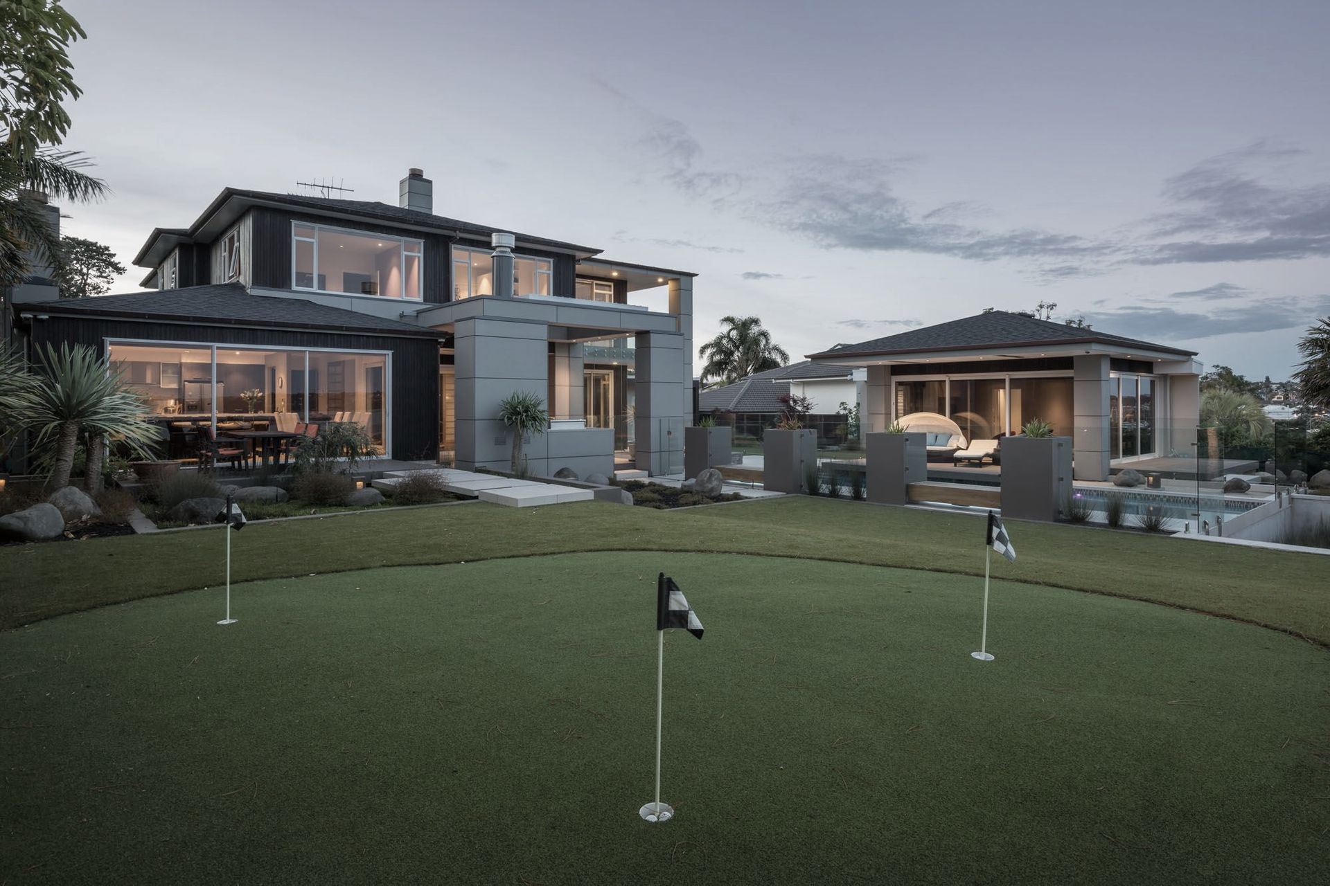 ArchiPro Project Summary - The West Harbour Home is a luxurious estate featuring landscaped gardens, a serene lawn, and views of a nearby golf course.