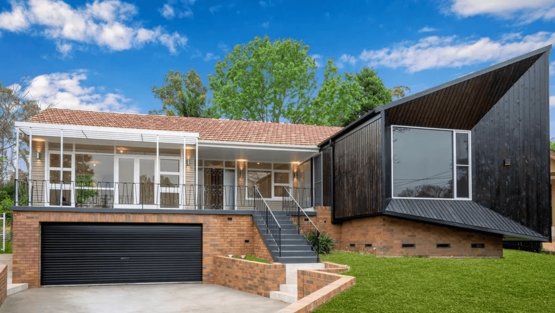 Original Mid Century Home with extensive internal planning changes. Bedroom wing to the west (right), and living to the east (left). Garage is now a useful space and double width; new front room has a peak to make the existing roof ridge; much needed shading to the north facing lounge and balcony