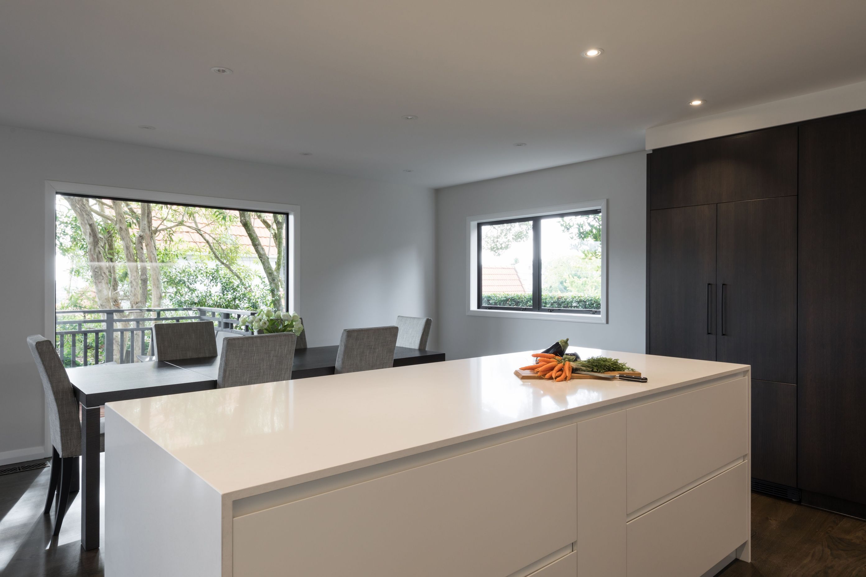 ArchiPro Project Summary - A classic renovation of a mid-century Remuera home, featuring an open-plan kitchen and dining area, dark timber floors, and a stylish contrast with a light island, completed in 2019 by Nicola Manning Design.
