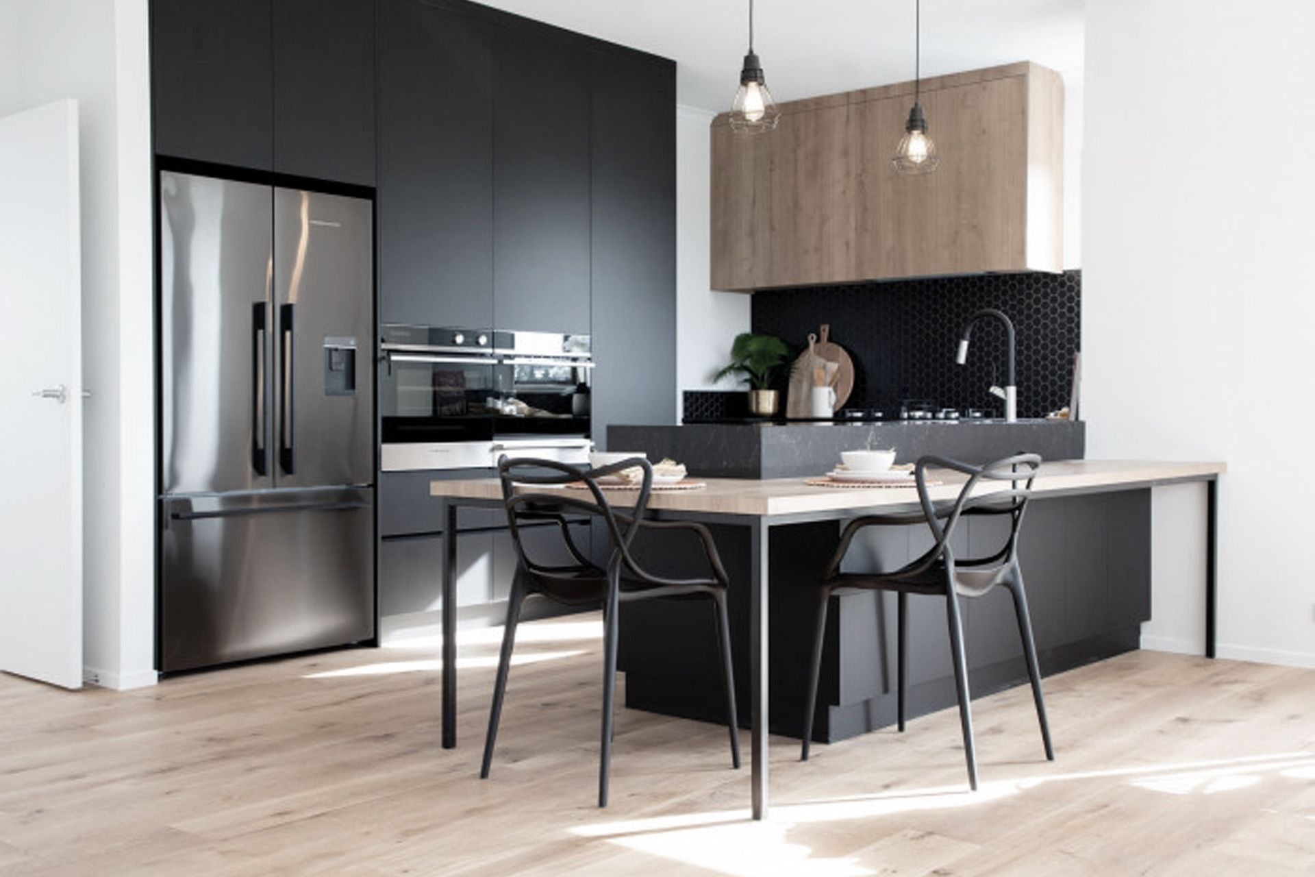 ArchiPro Project Summary - A beautifully designed family home featuring a central kitchen with modern black cabinetry and warm wood tones, creating a welcoming space for gatherings and family activities.
