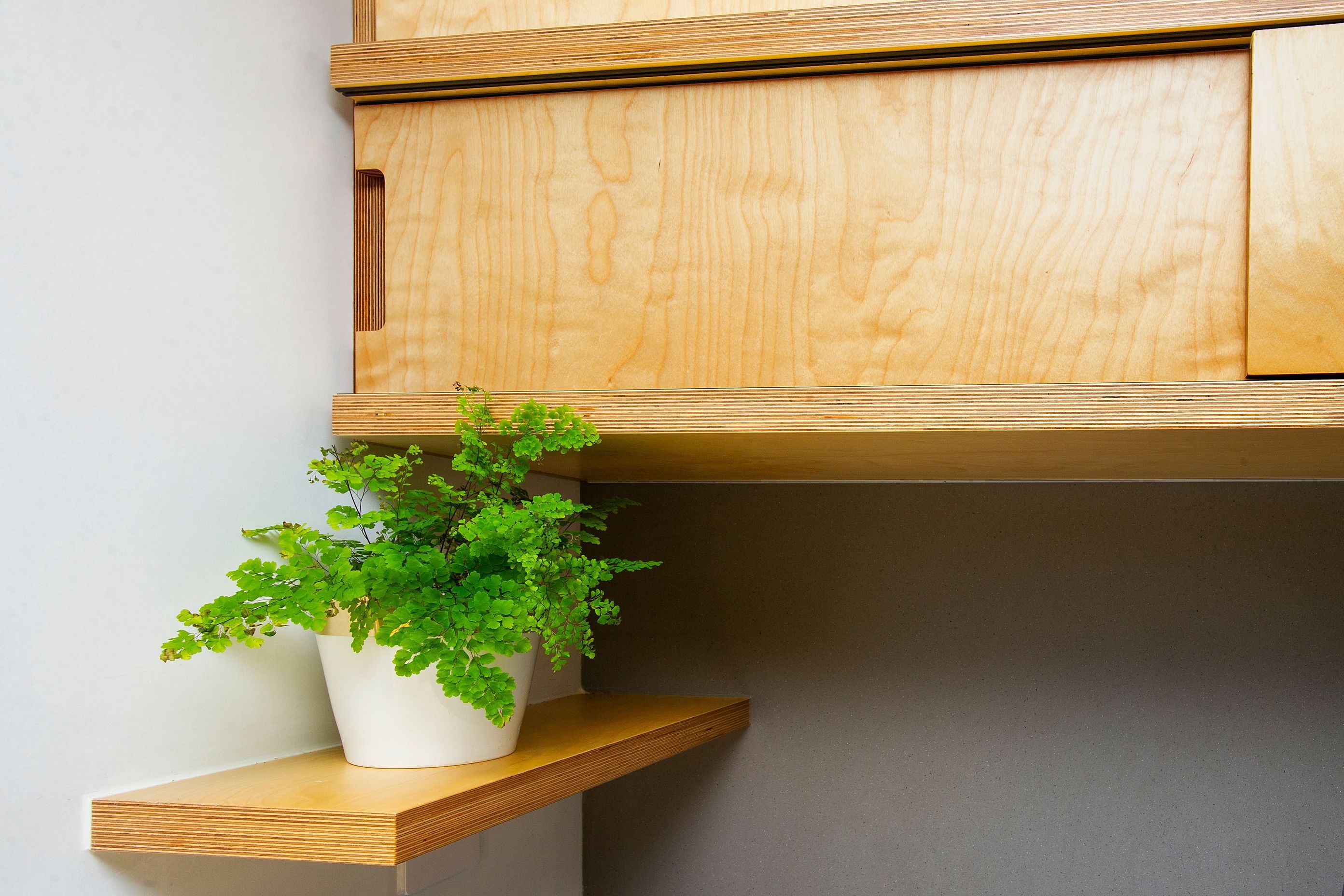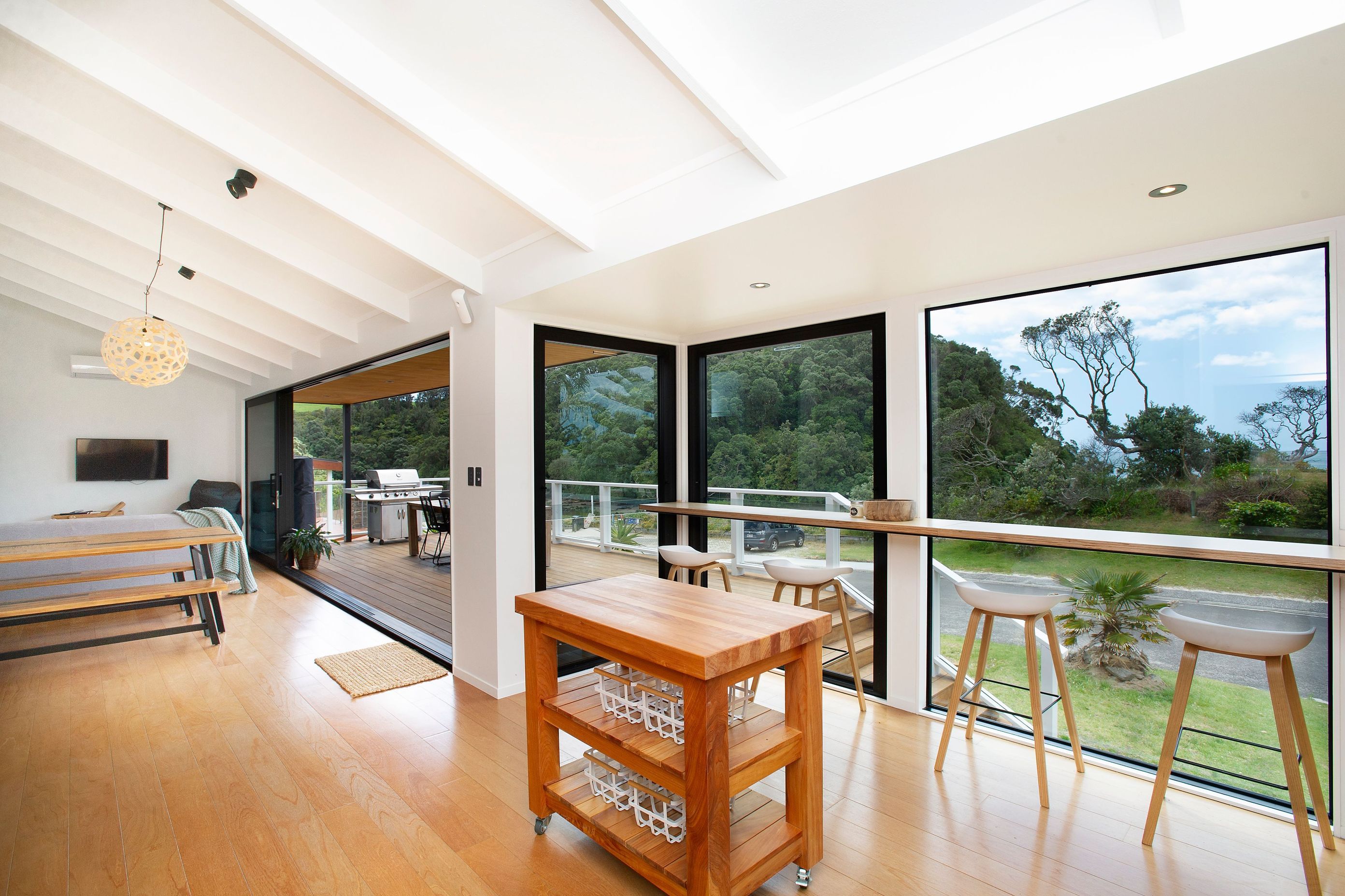 ArchiPro Project Summary - Contemporary kitchen featuring Birch ply construction, sealed with a UV-inhibiting matte finish, complemented by a floating top supported by a discreet steel structure, enhancing the aesthetic as you approach from the Whiritoa beachfront.
