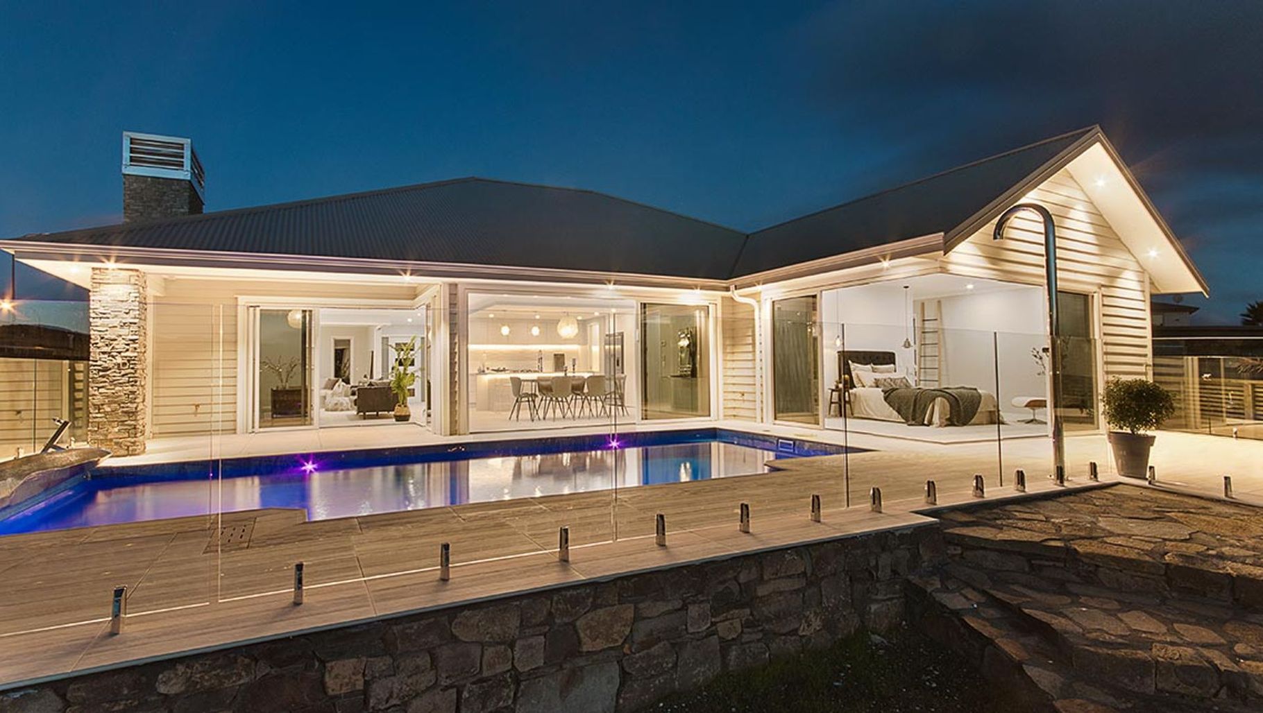 ArchiPro Project Summary - Elegant pool fence and interior glazing solutions for the Whitianga Waterways project, featuring Haynes Balustrades, Bevelled Mirrors, and Showers, completed in Winter 2018 for DW Homes.