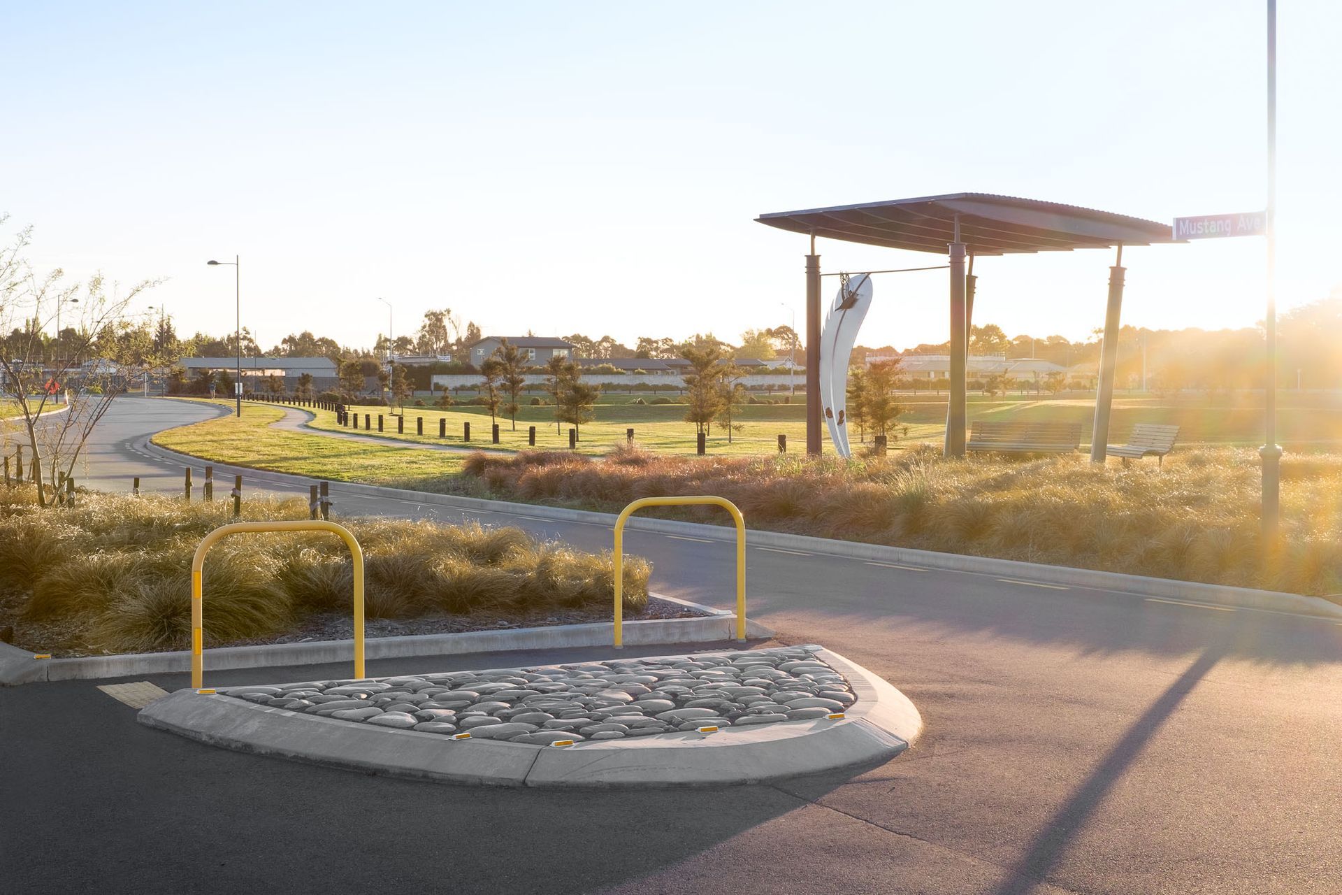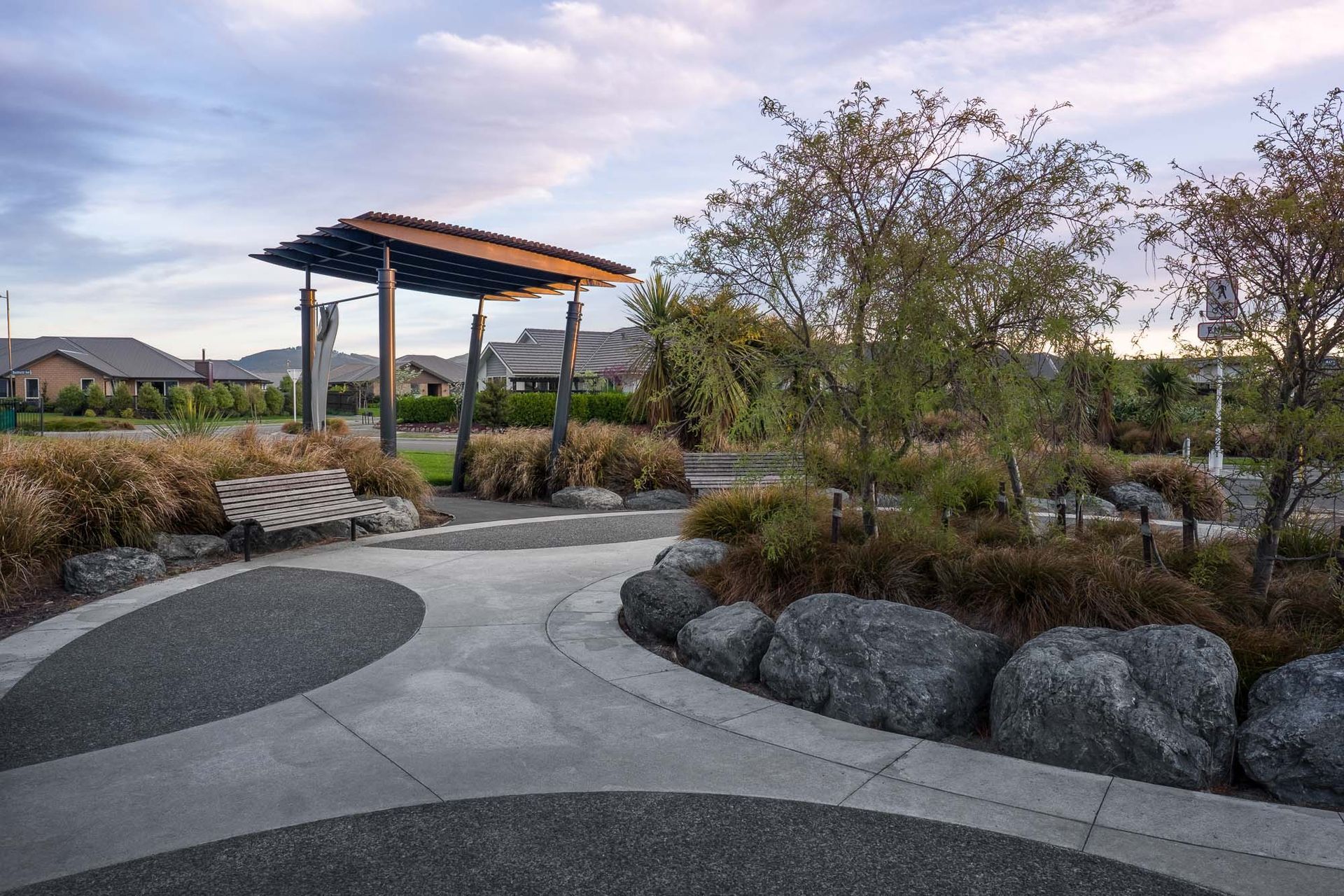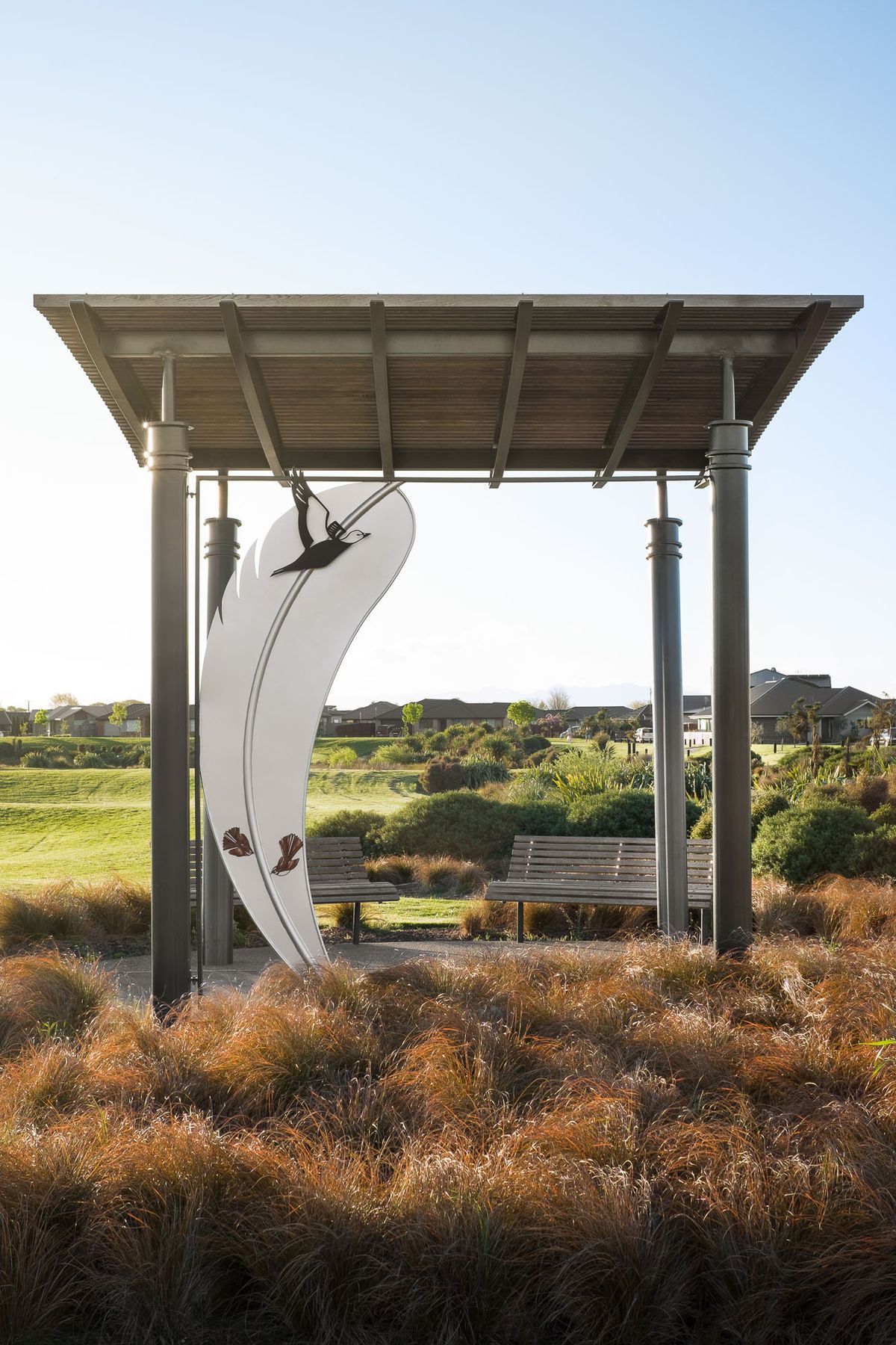 ArchiPro Project Summary - A thoughtfully designed subdivision that honors Ngai Tahu heritage and the historical Wigram Aerodrome, featuring extensive native plantings and seasonal color through a blend of indigenous and exotic tree species.