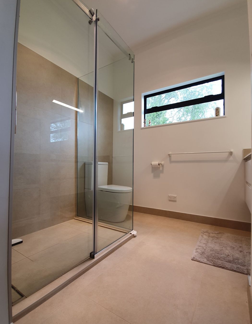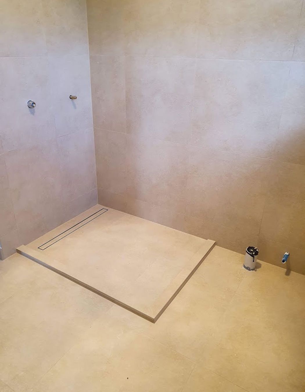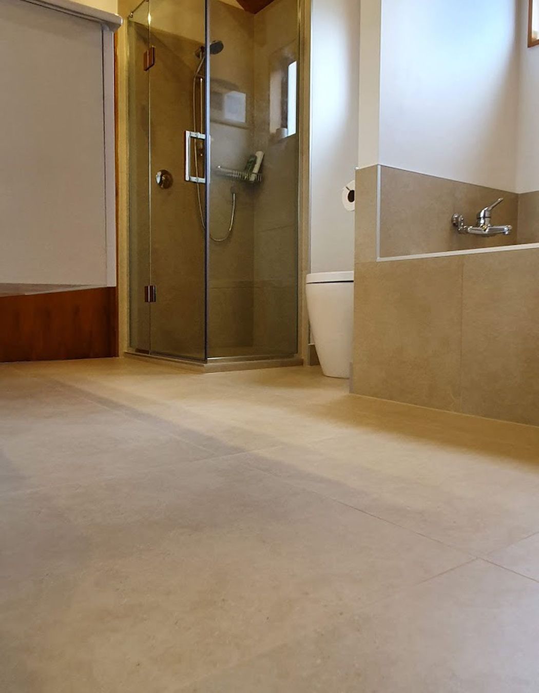 ArchiPro Project Summary - Comprehensive double bathroom renovation transforming a three-room layout into a spacious open-plan design, featuring complete demolition, new plumbing and electrical systems, and high-quality finishes throughout.