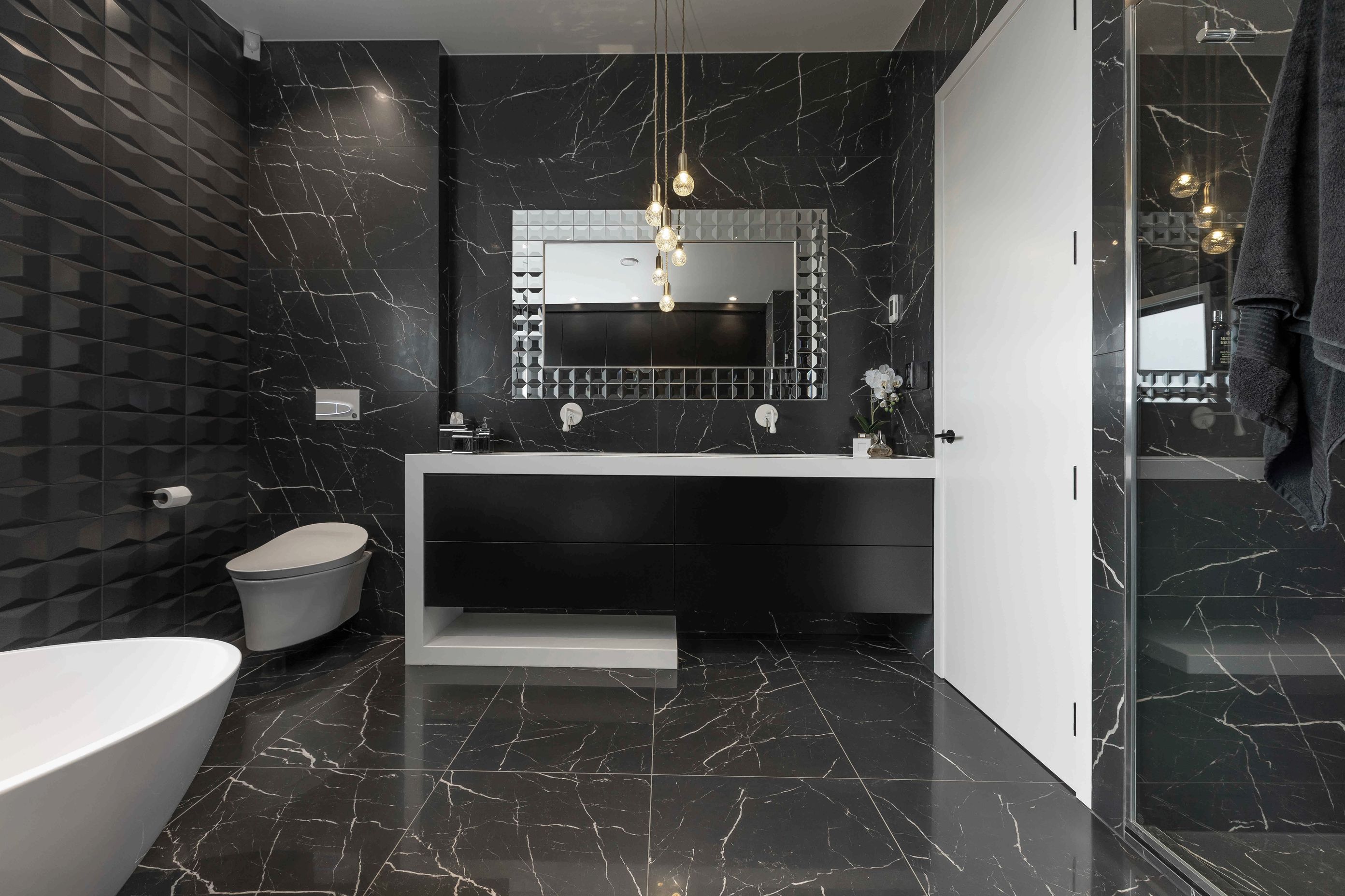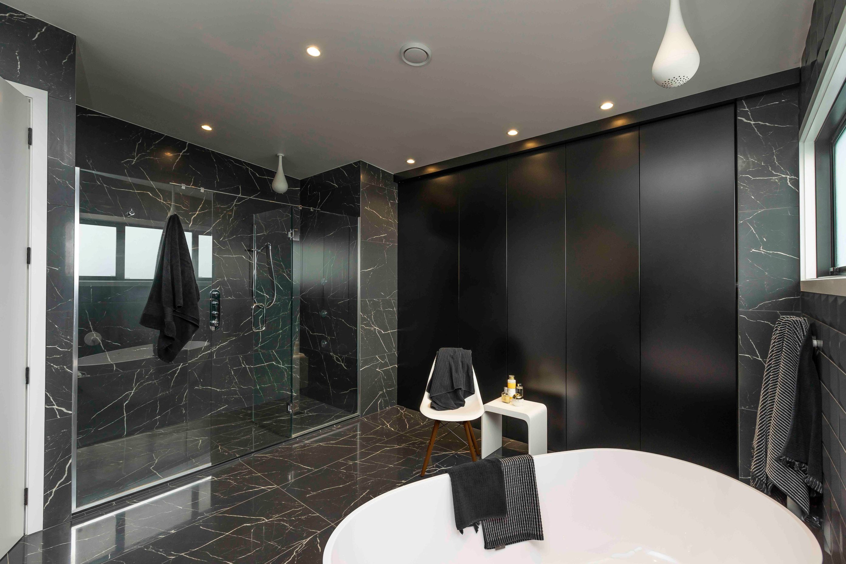 ArchiPro Project Summary - A luxurious master ensuite featuring contemporary materials, innovative design elements, and ample storage, designed to provide a private yet accessible space for shared use, complete with a dual shower zone and a striking freestanding bathtub.