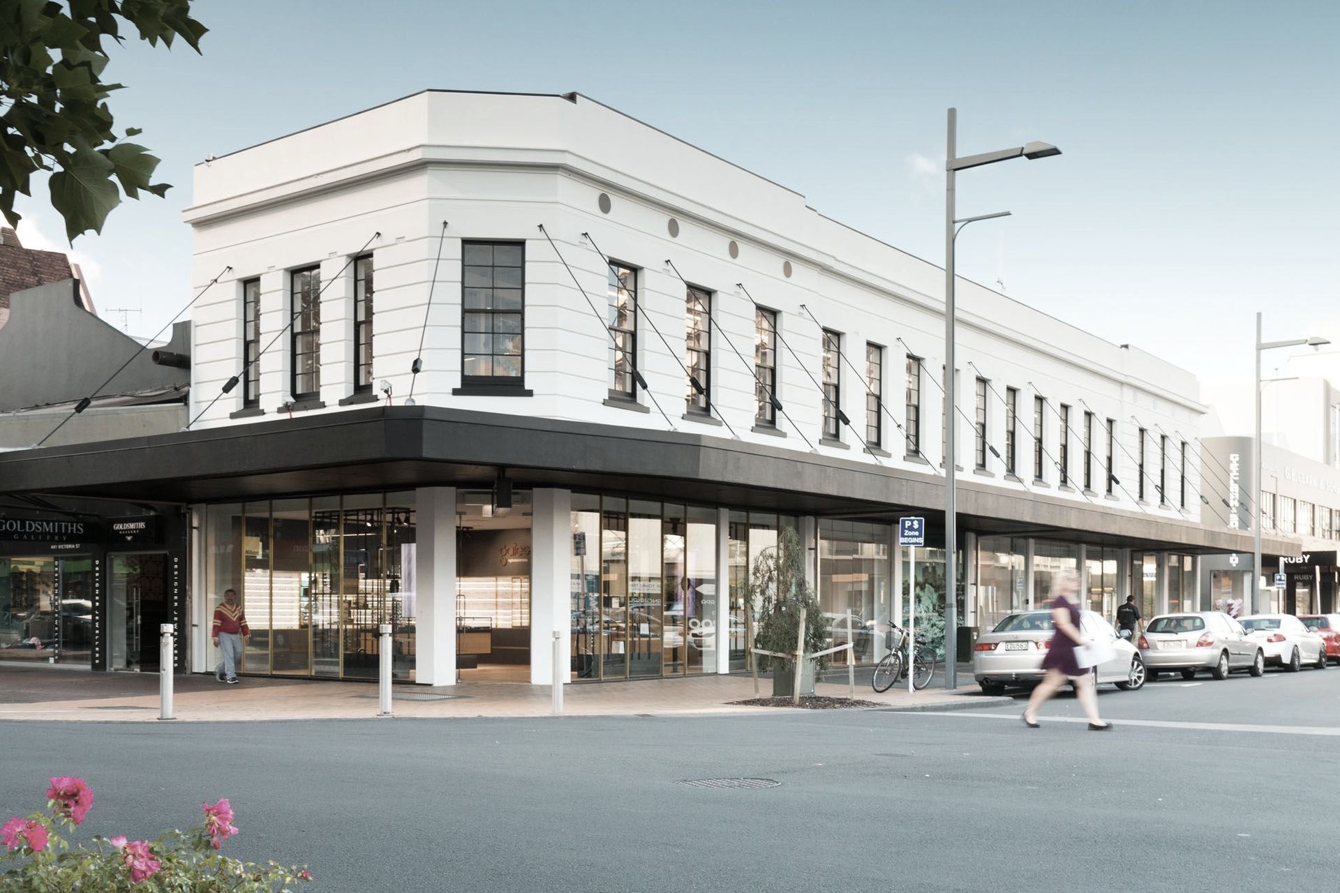 ArchiPro Project Summary - Heritage restoration of Wiseman Central, featuring enhanced façade, earthquake strengthening, and dynamic retail frontage with faceted glazing, harmonizing modern aesthetics with historical architecture.