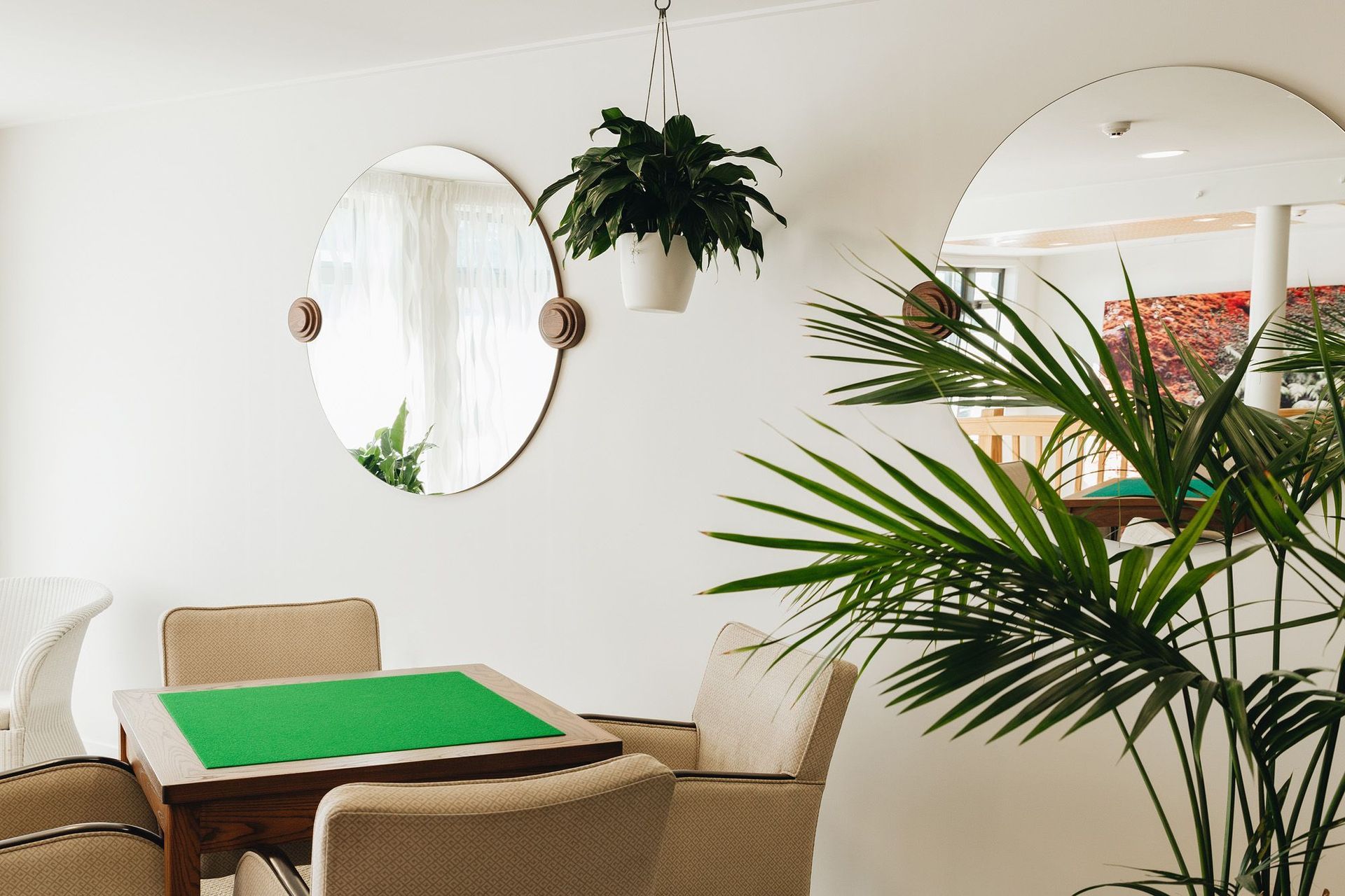 The card table provides a purpose to gather on the mezzanine floor of the Central Conservatory at Woburn Apartments... although sometimes the softly filtered light and a newspaper is all someone needs to rest here.