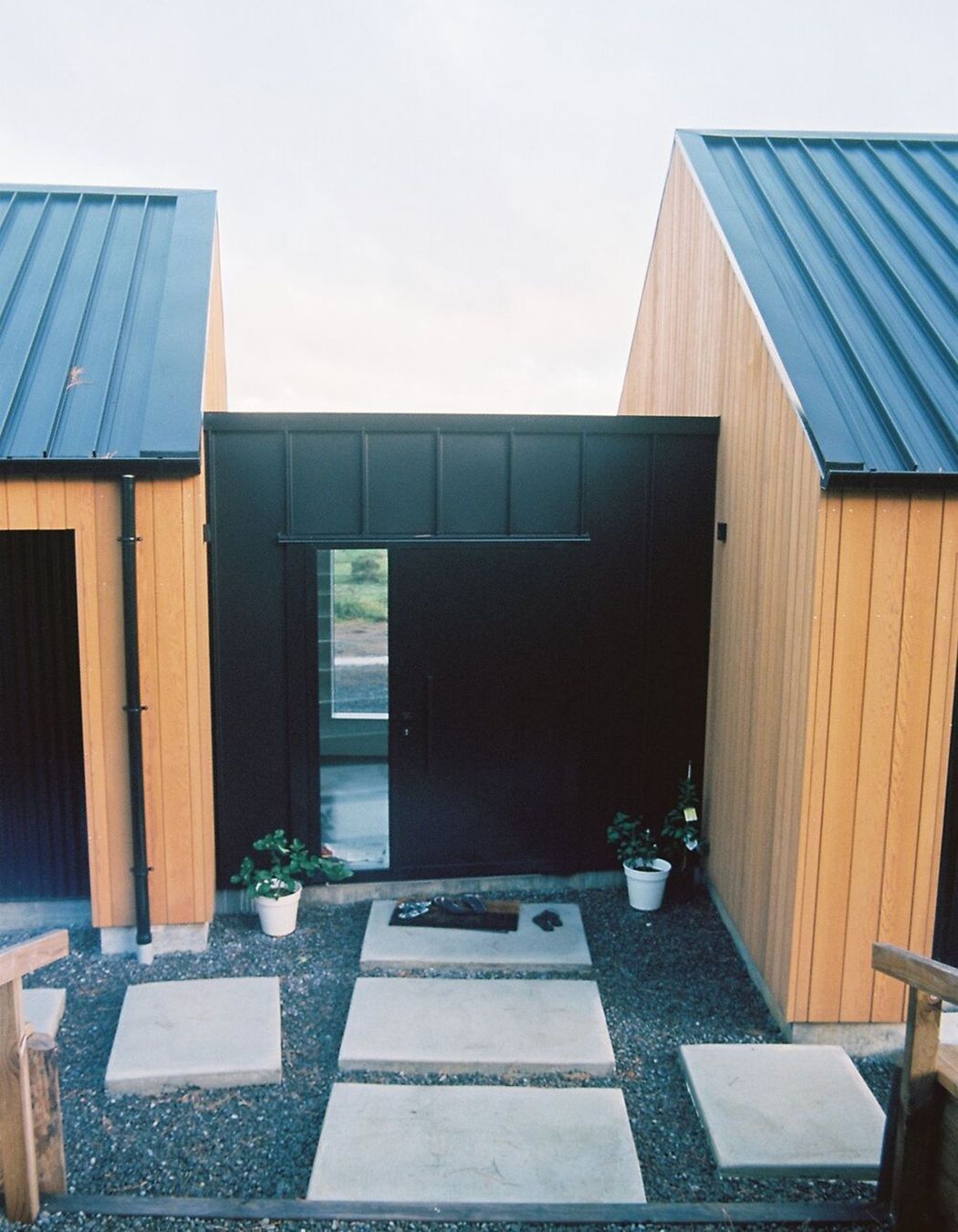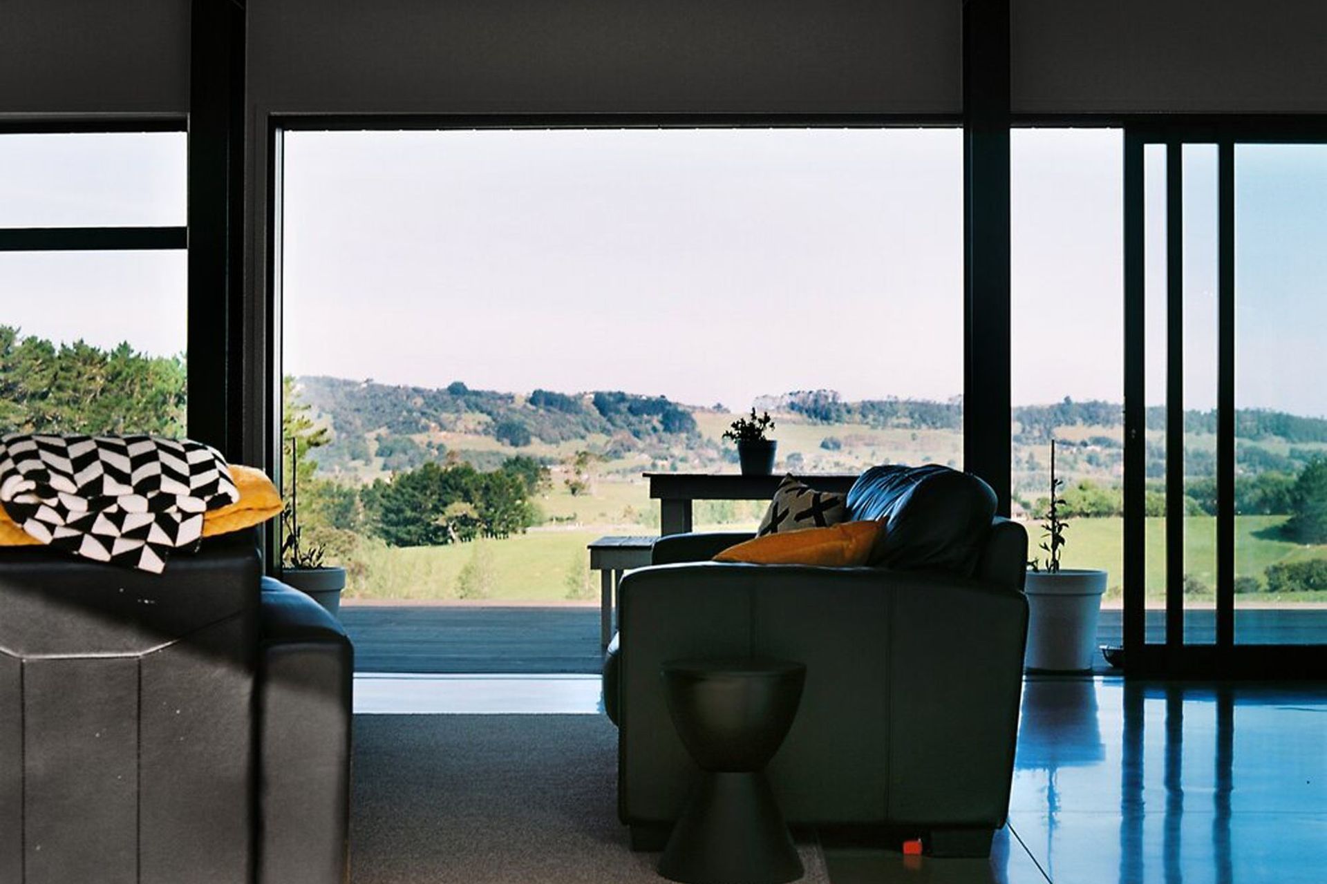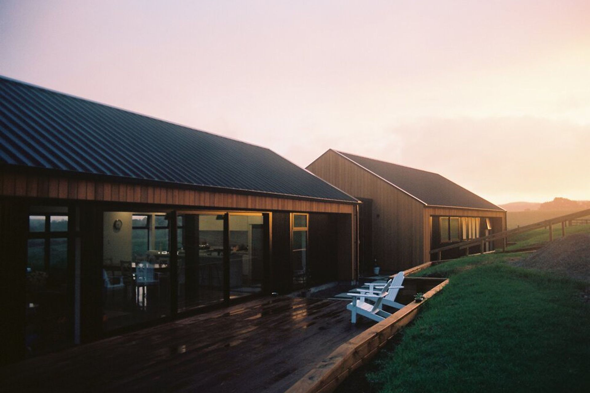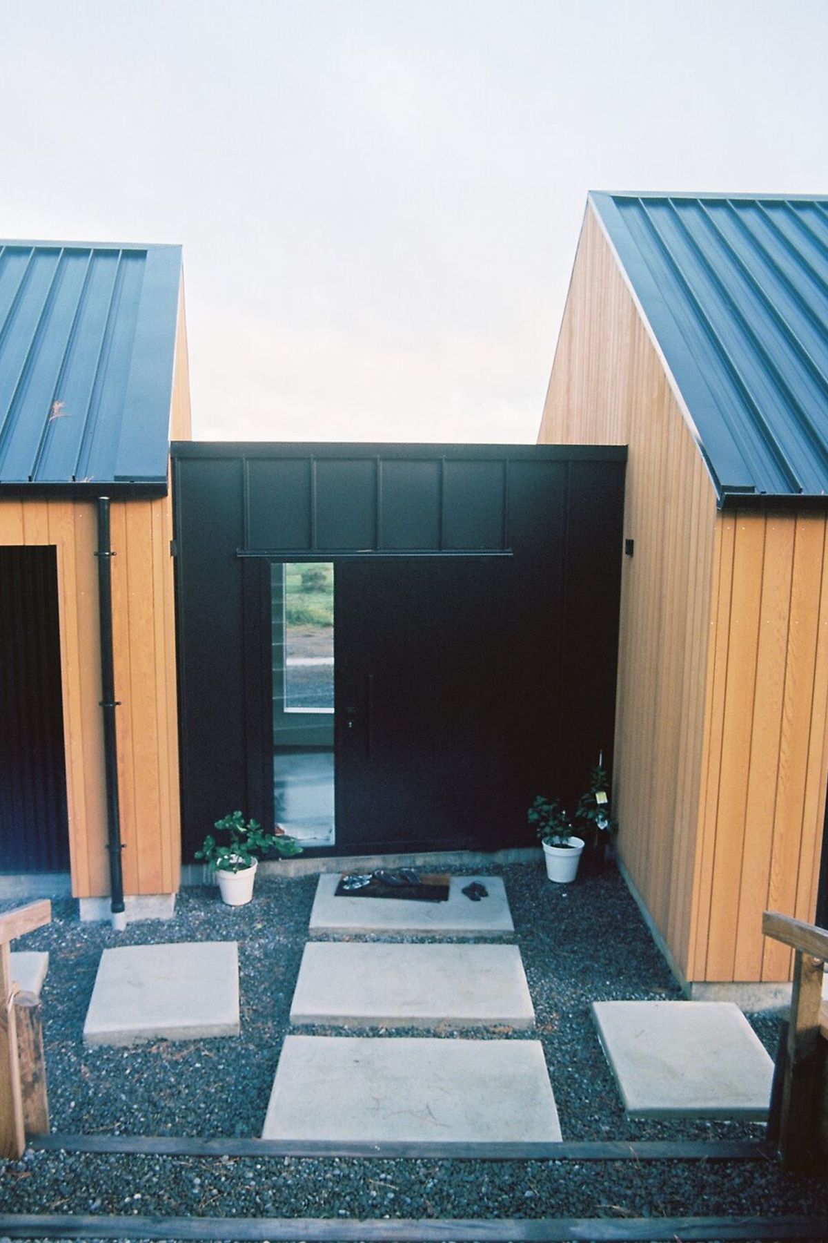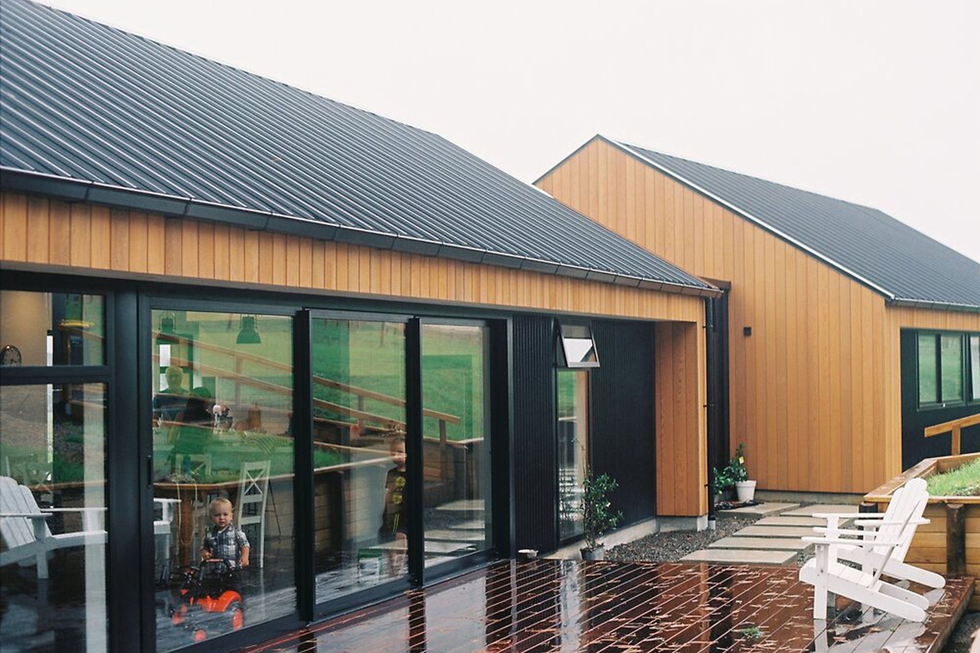 ArchiPro Project Summary - A contemporary farmhouse designed for a young family, featuring cedar-clad gable forms and a striking black steel interior, harmoniously integrated into the rural New Zealand landscape.