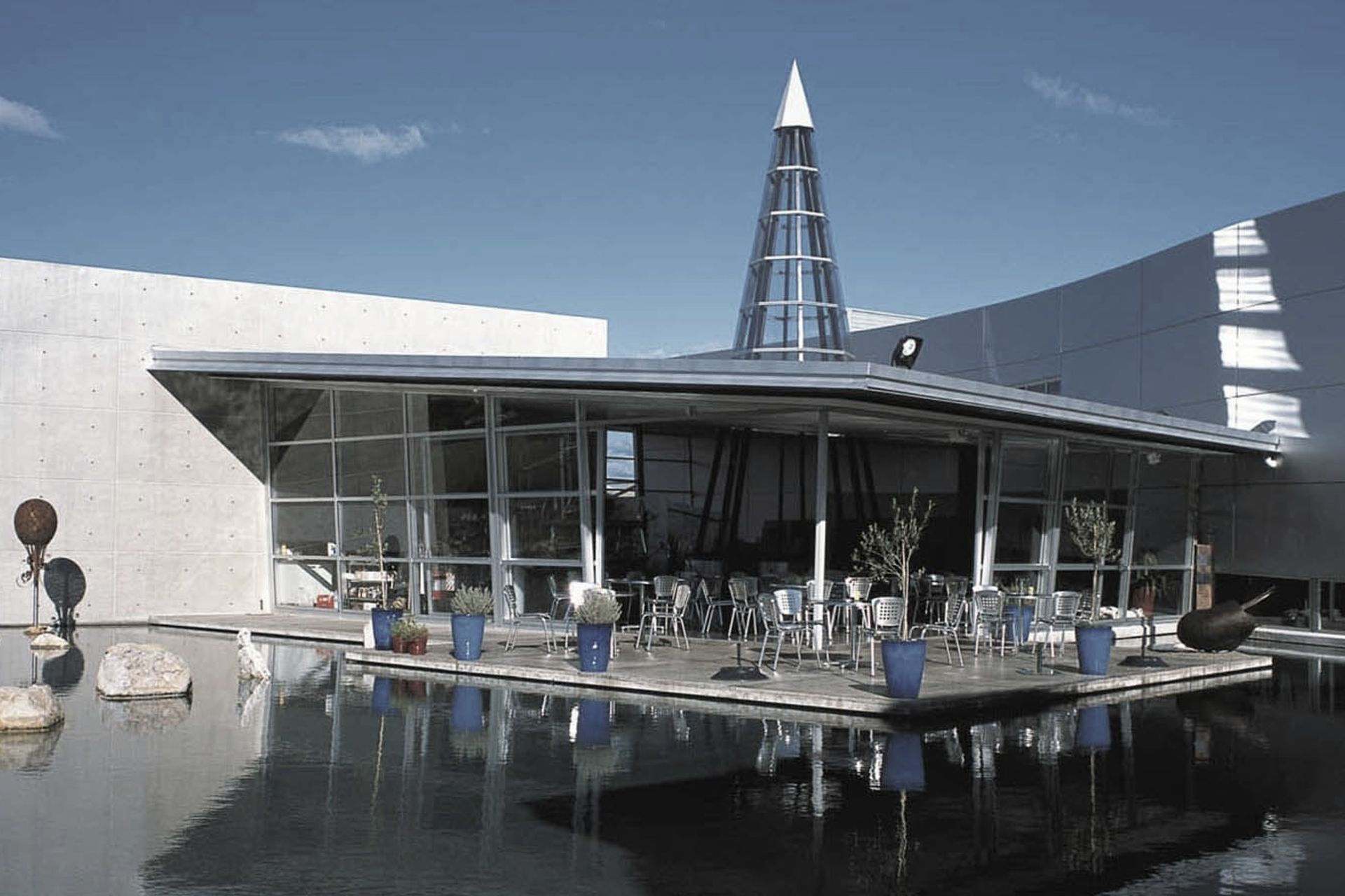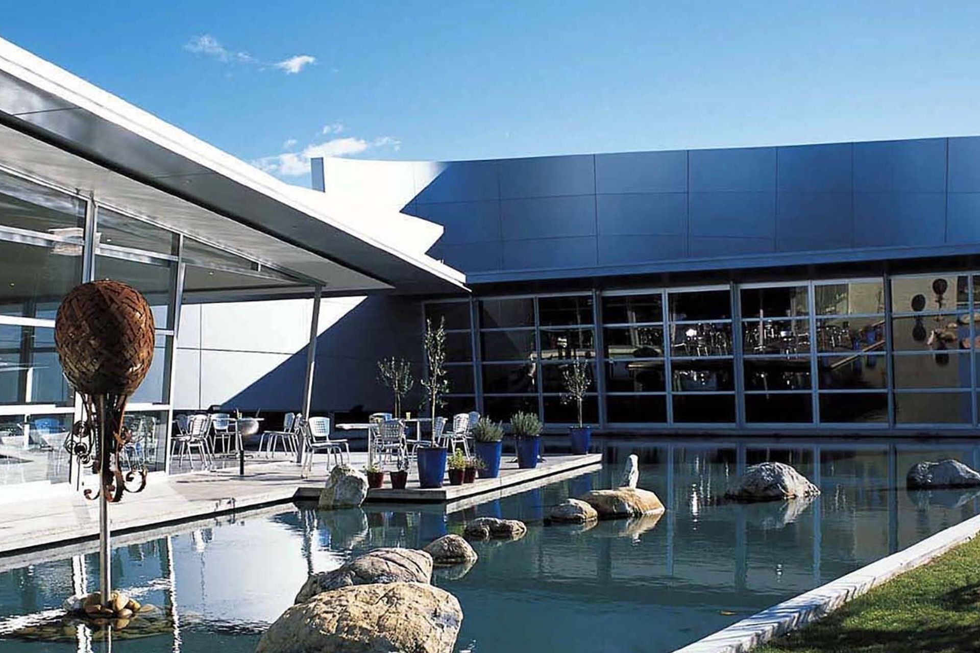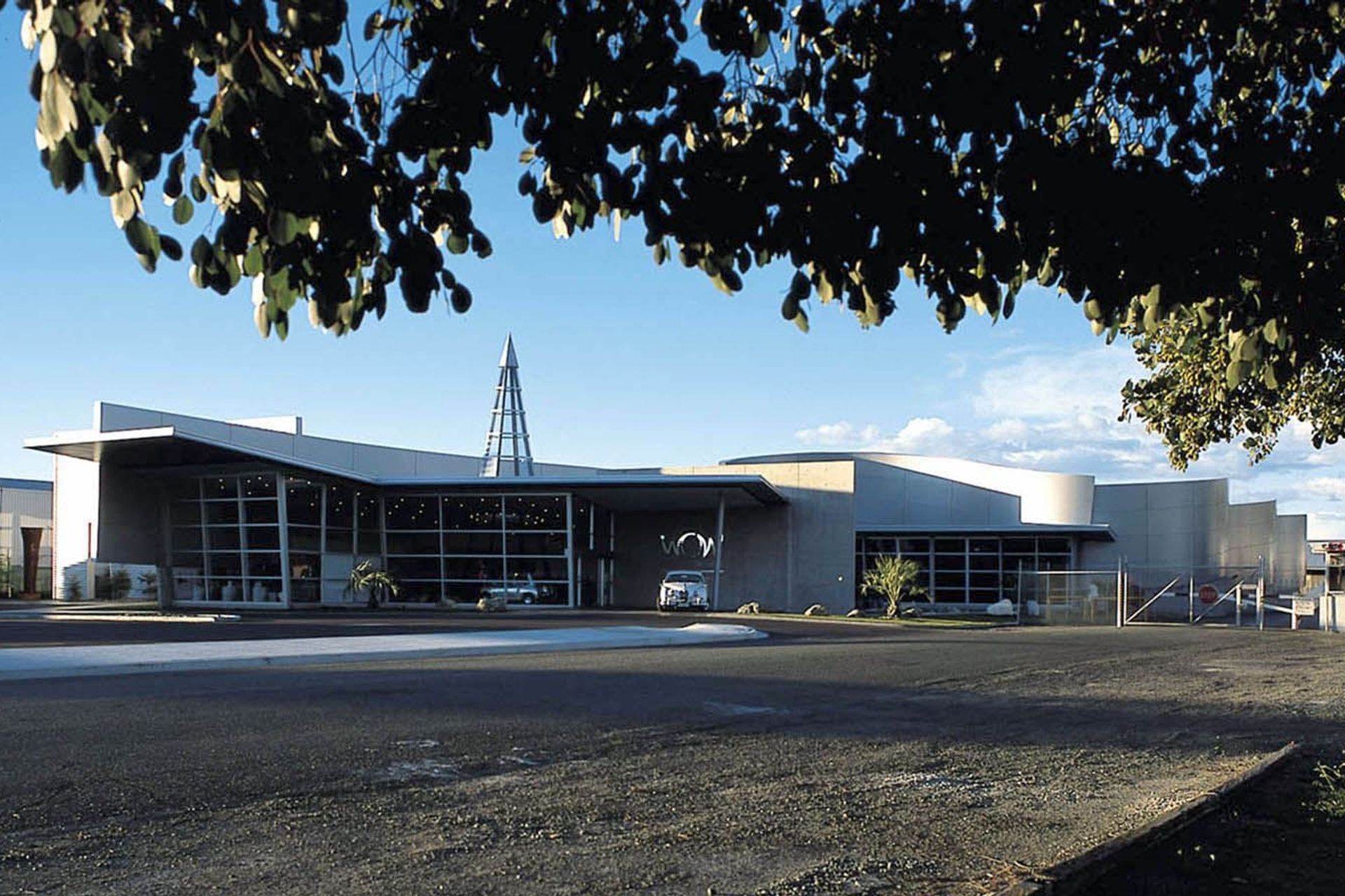 ArchiPro Project Summary - A dynamic tourist destination featuring the Wearable Arts Gallery, a classic car collection, a modern art display, and a café, all unified by a striking 6-meter high aluminum ribbon wall that enhances the sculptural qualities of the building.