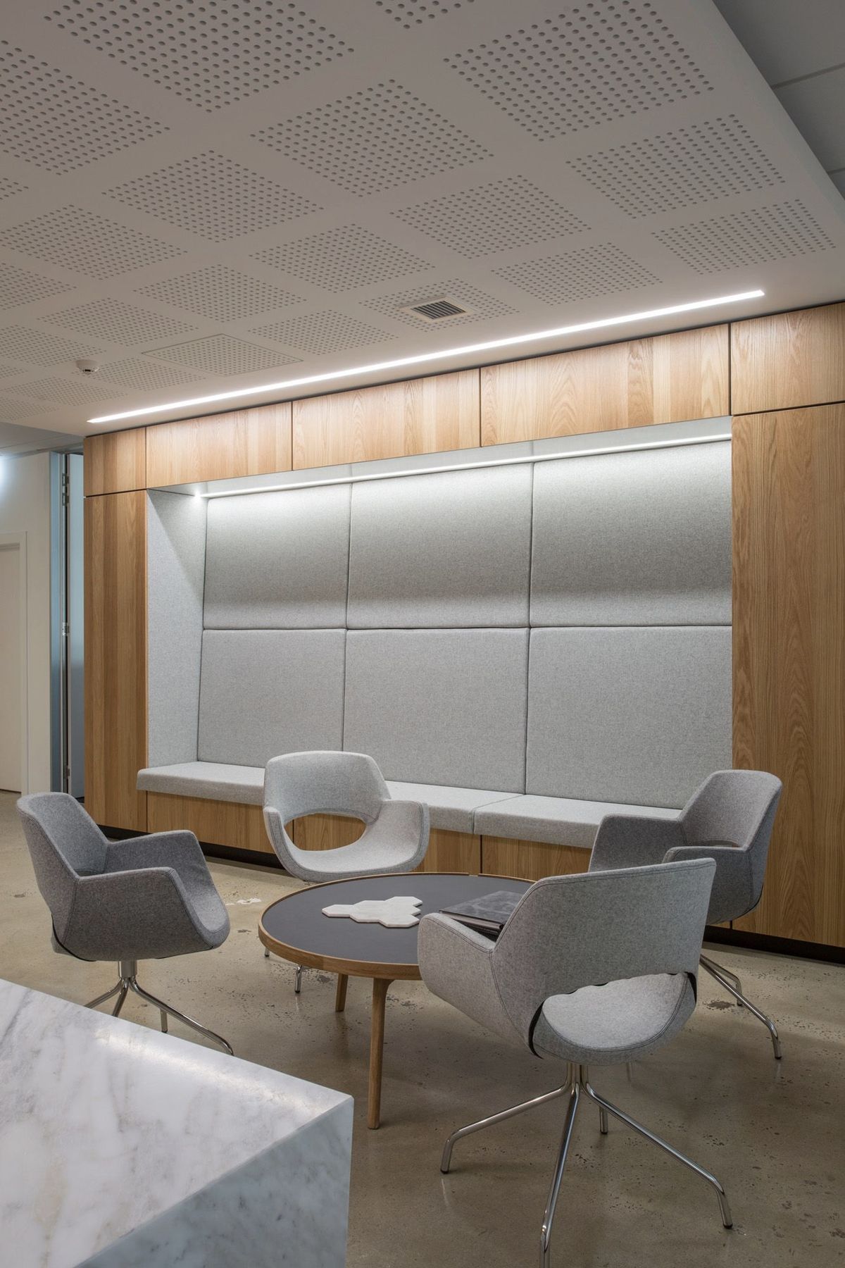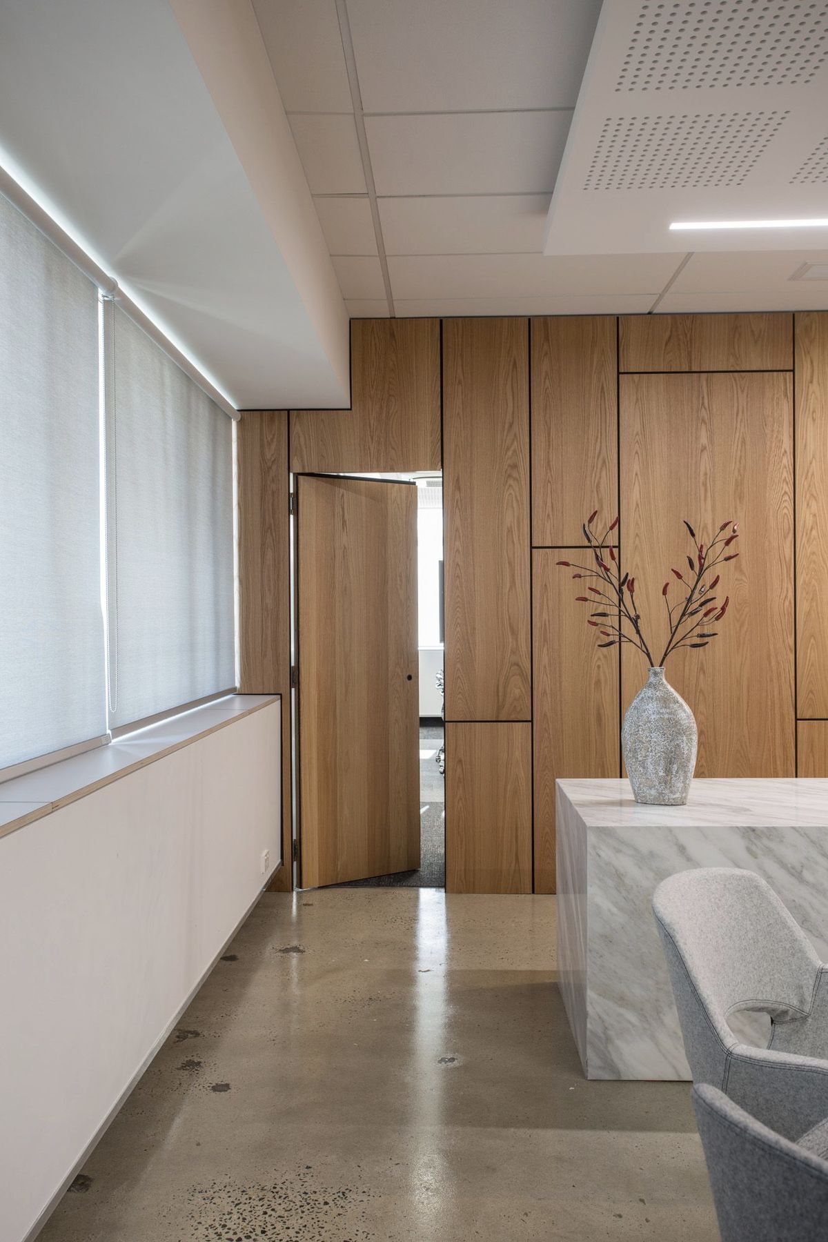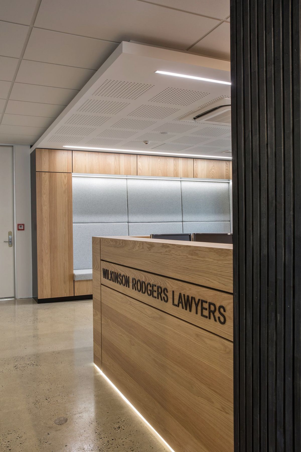 ArchiPro Project Summary - Contemporary office fit-out for WR Lawyers in a prominent 1970s Dunedin building, featuring a blend of brushed oak, grey cashmere fabrics, and Italian marble, completed in 2017.