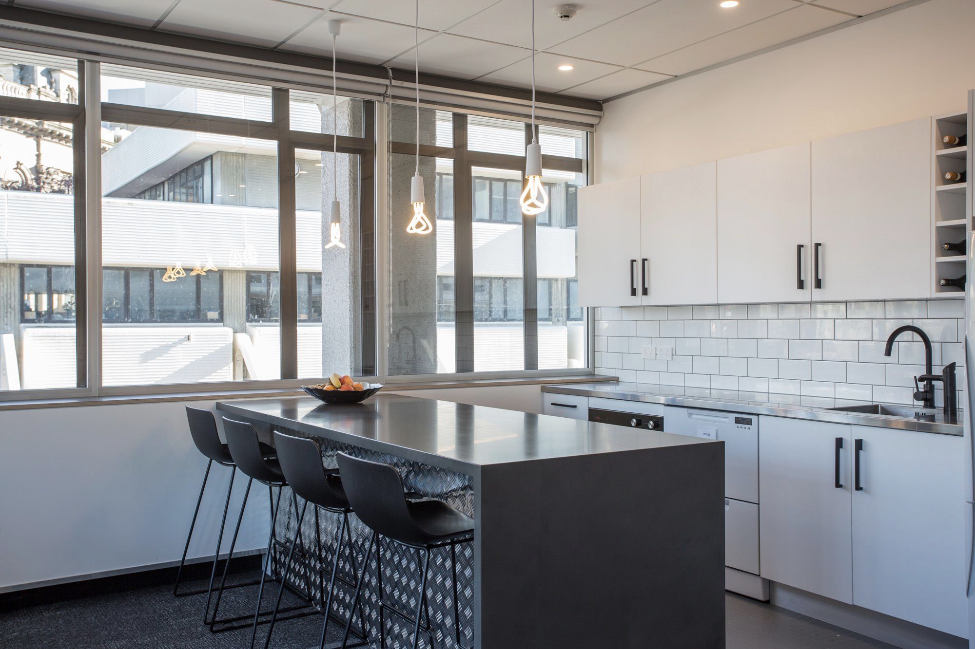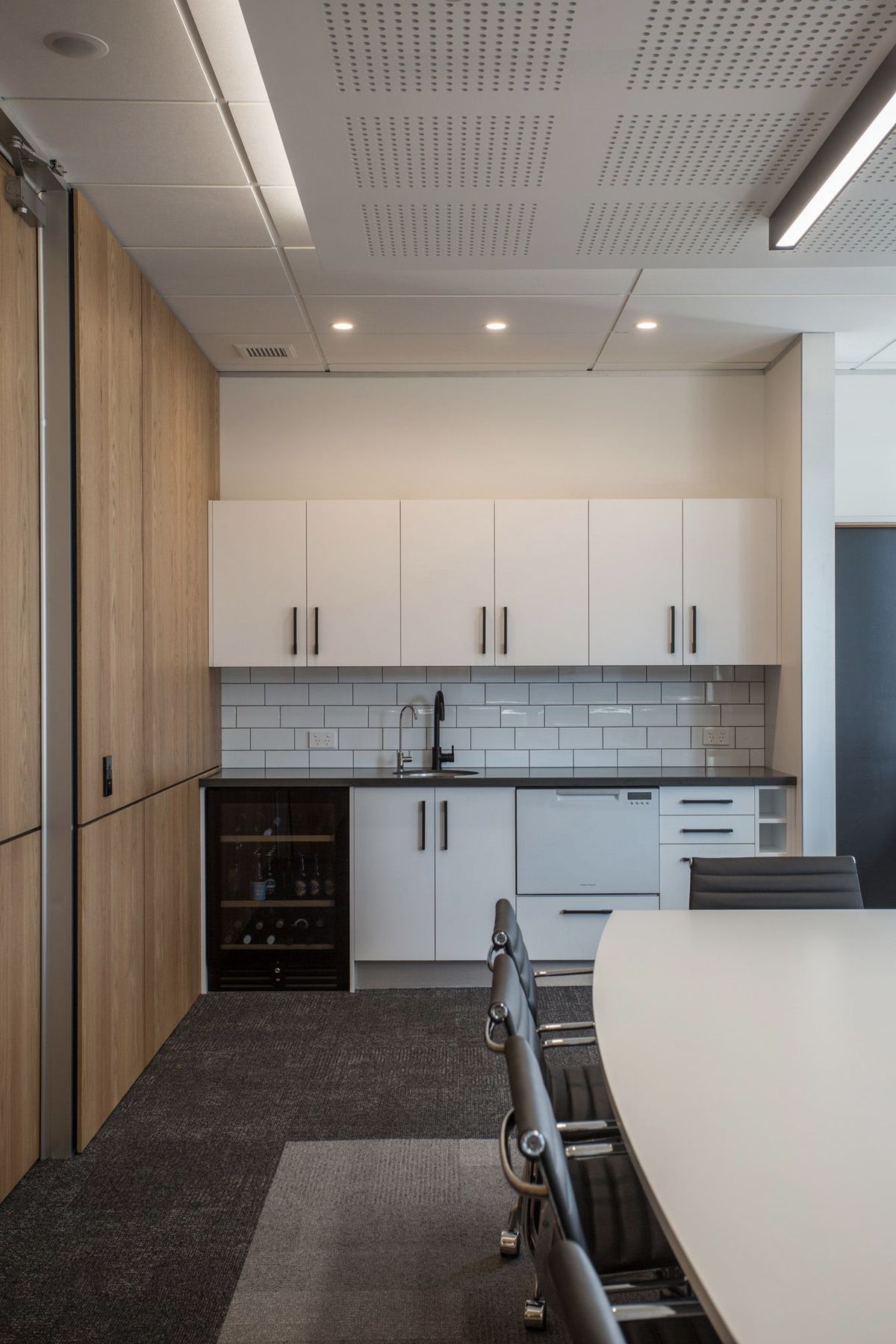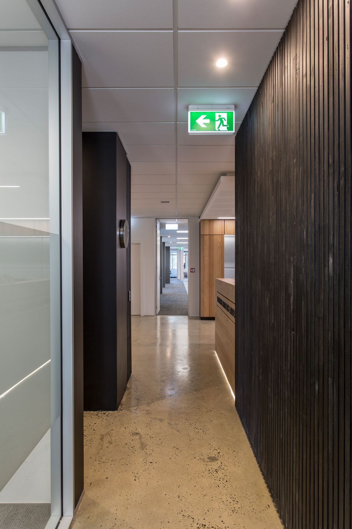 ArchiPro Project Summary - Contemporary office fit-out for WR Lawyers in a prominent 1970s Dunedin building, featuring a blend of brushed oak, grey cashmere fabrics, and Italian marble, completed in 2017.