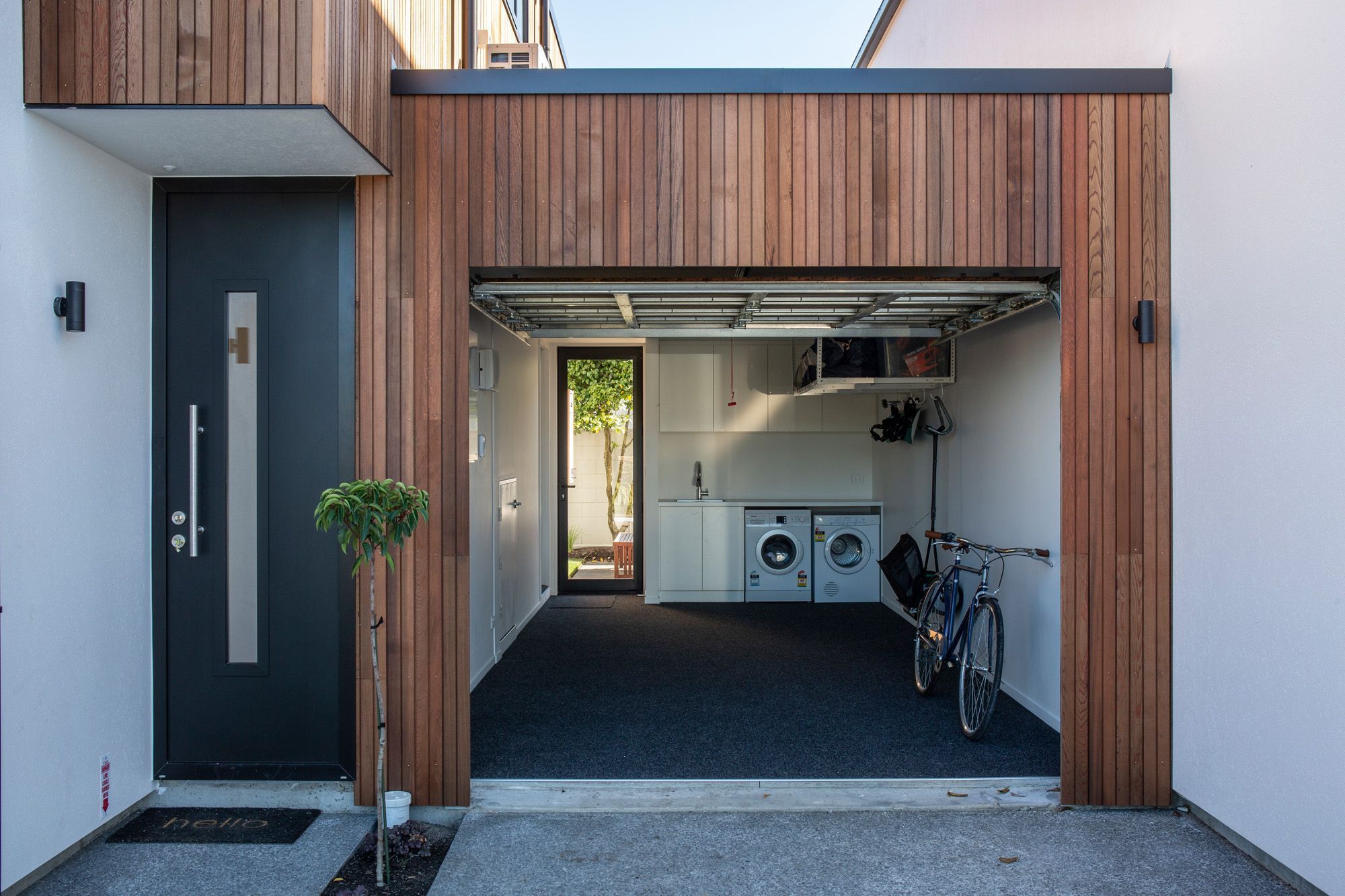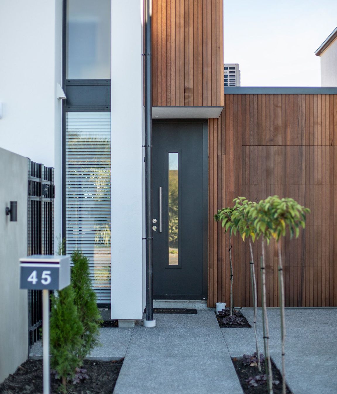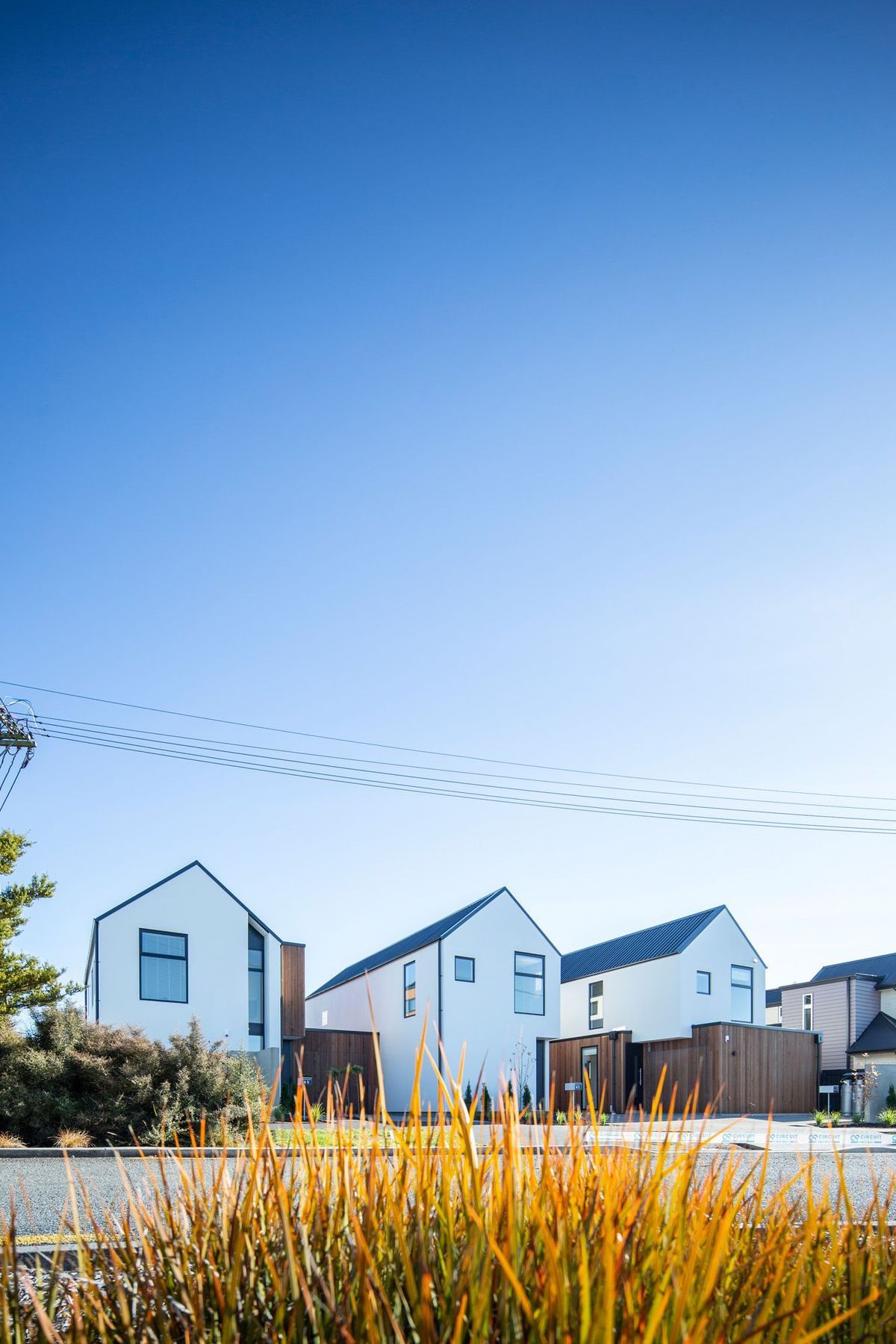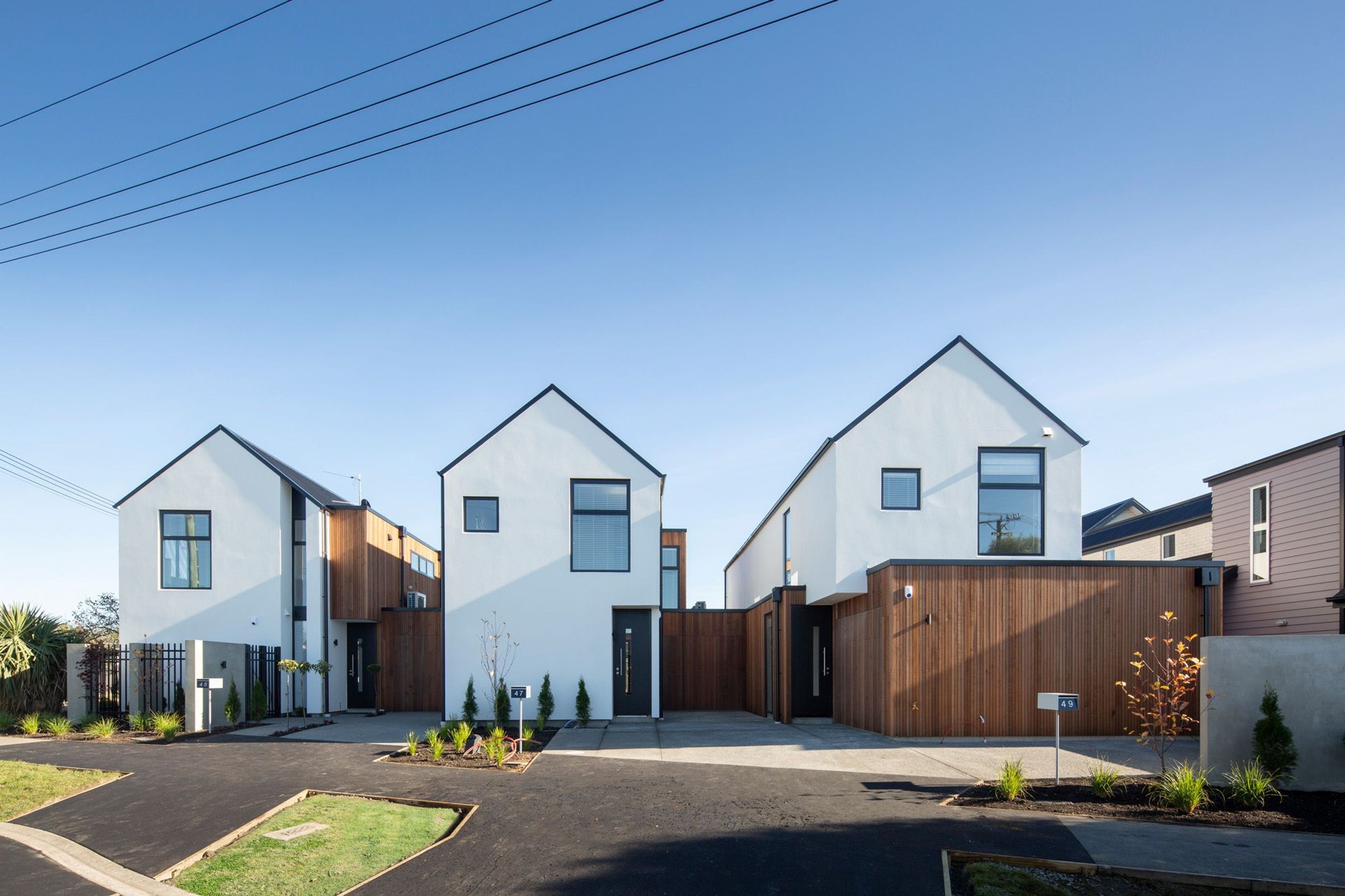 ArchiPro Project Summary - Three modern townhouses in Papanui, Christchurch, featuring efficient space planning, private courtyards, and a blend of cedar weatherboard and white plaster exteriors, designed for urban living in a redeveloping suburb.