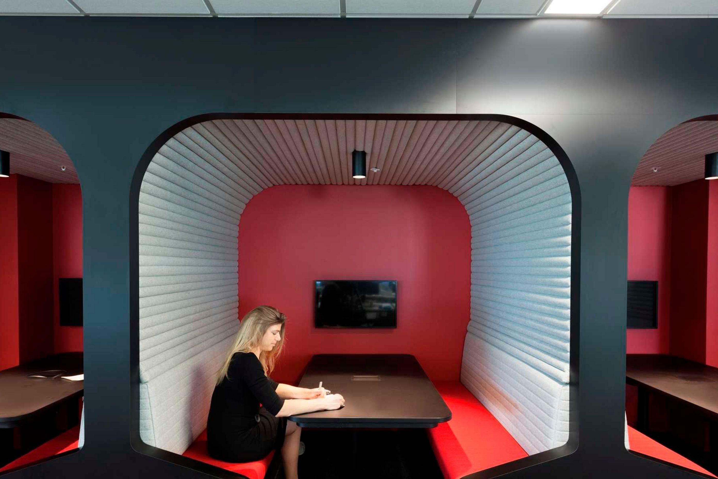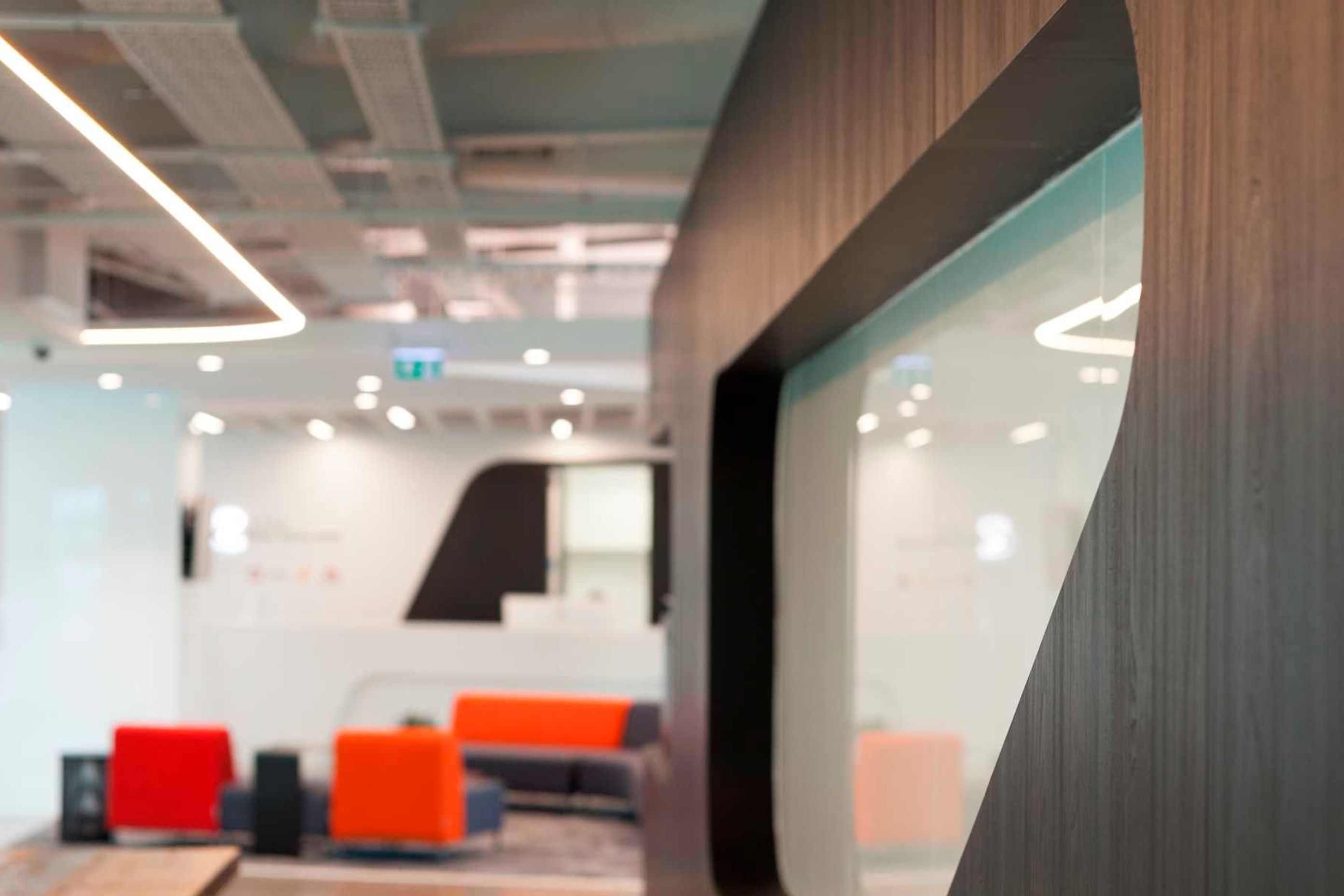 ArchiPro Project Summary - Z Energy Office fitout featuring durable Prime Laminate in Burnished Black for bar area, wall panelling, and seating surrounds, designed to withstand the demands of a busy office and social environment while providing a striking visual impact.