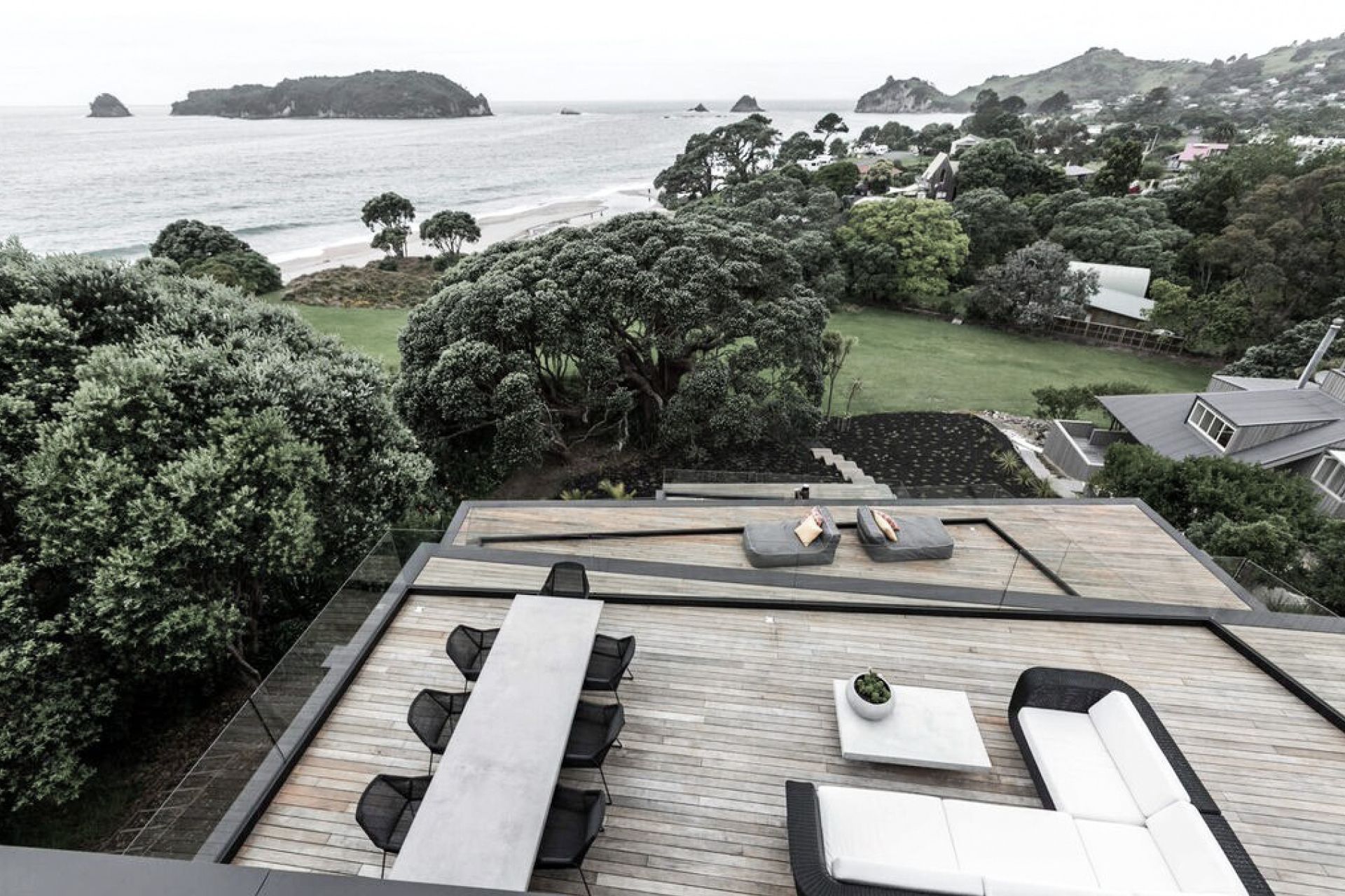 ArchiPro Project Summary - A stunning Hahei Beach House designed to enhance privacy and views, featuring floating roof structures and unique black finger-like foundations inspired by the ancient Pohutukawa tree on the property.